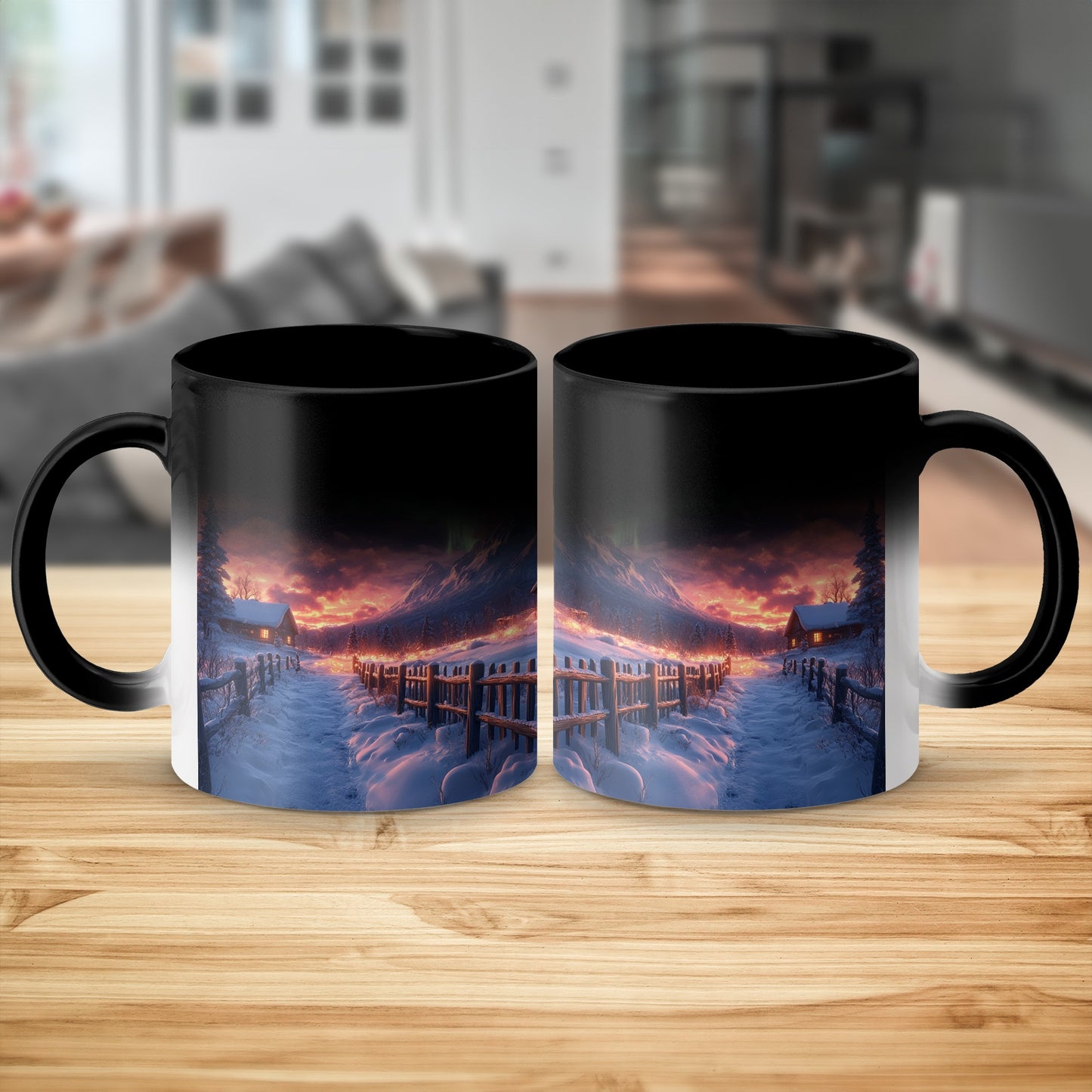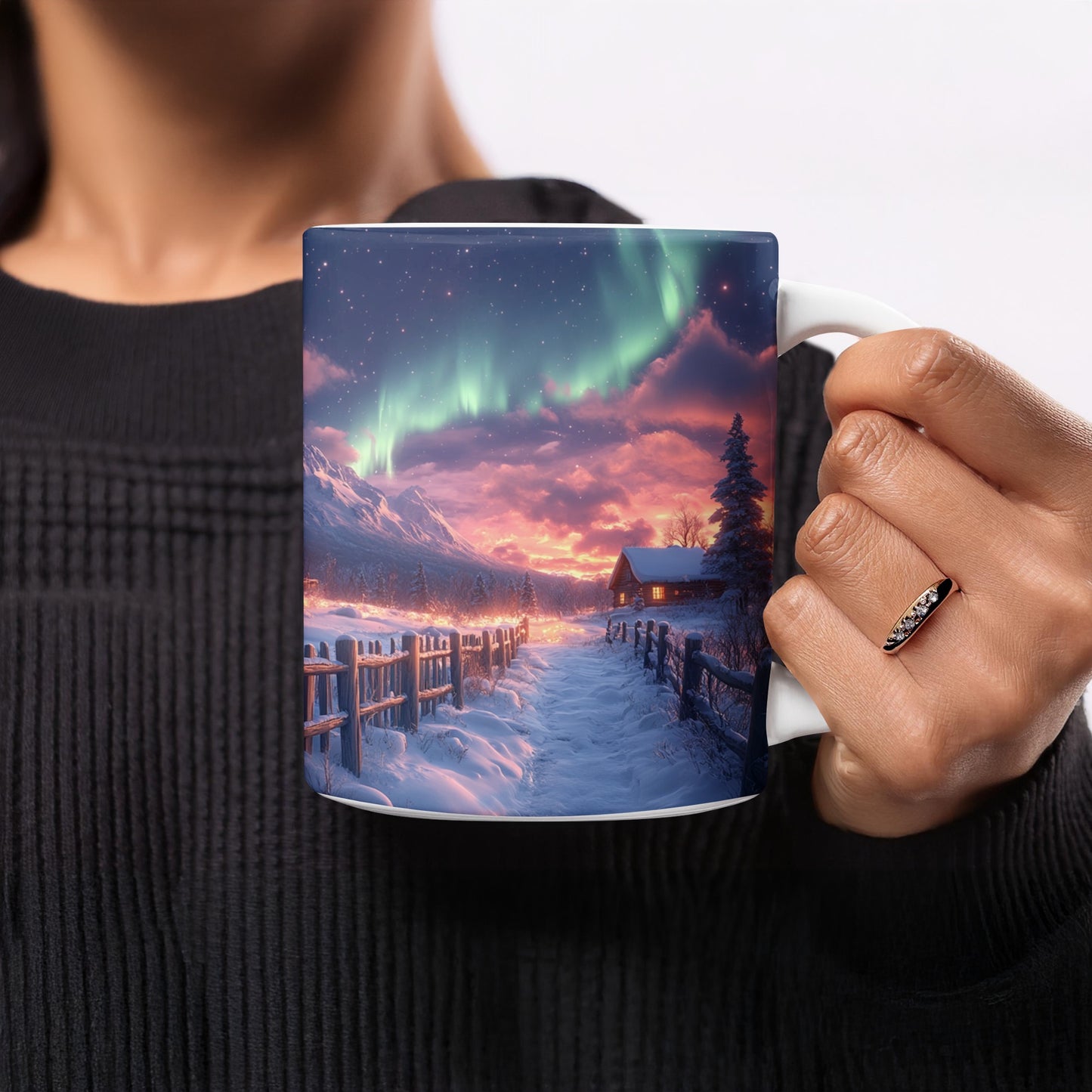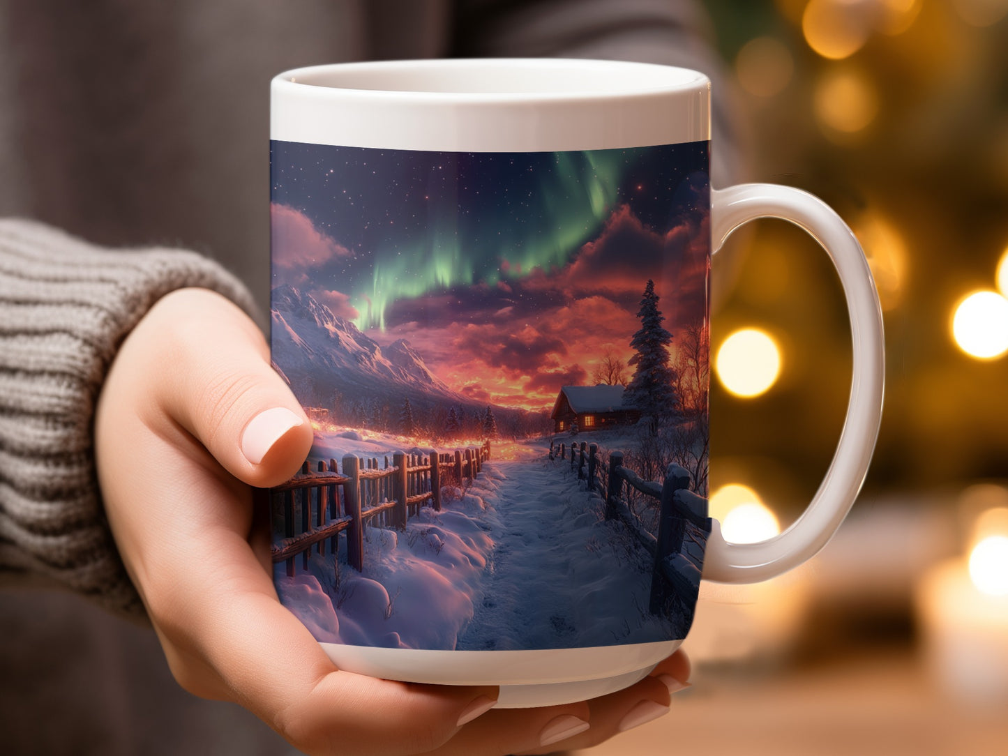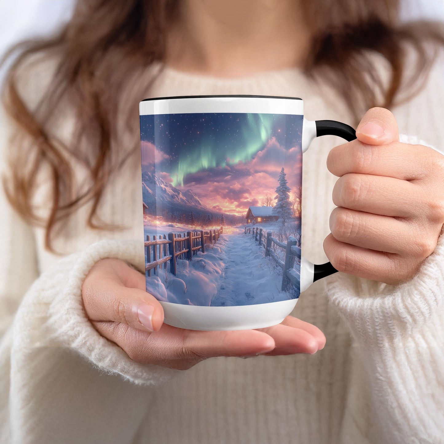 Nordlichter über verschneiten Hütten Landschaft Kunst Becher