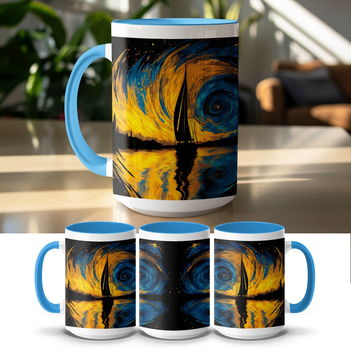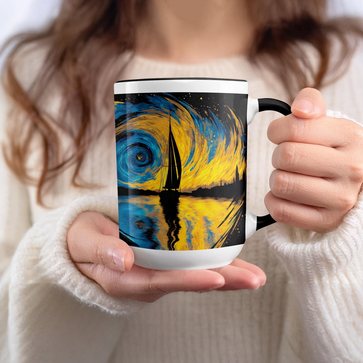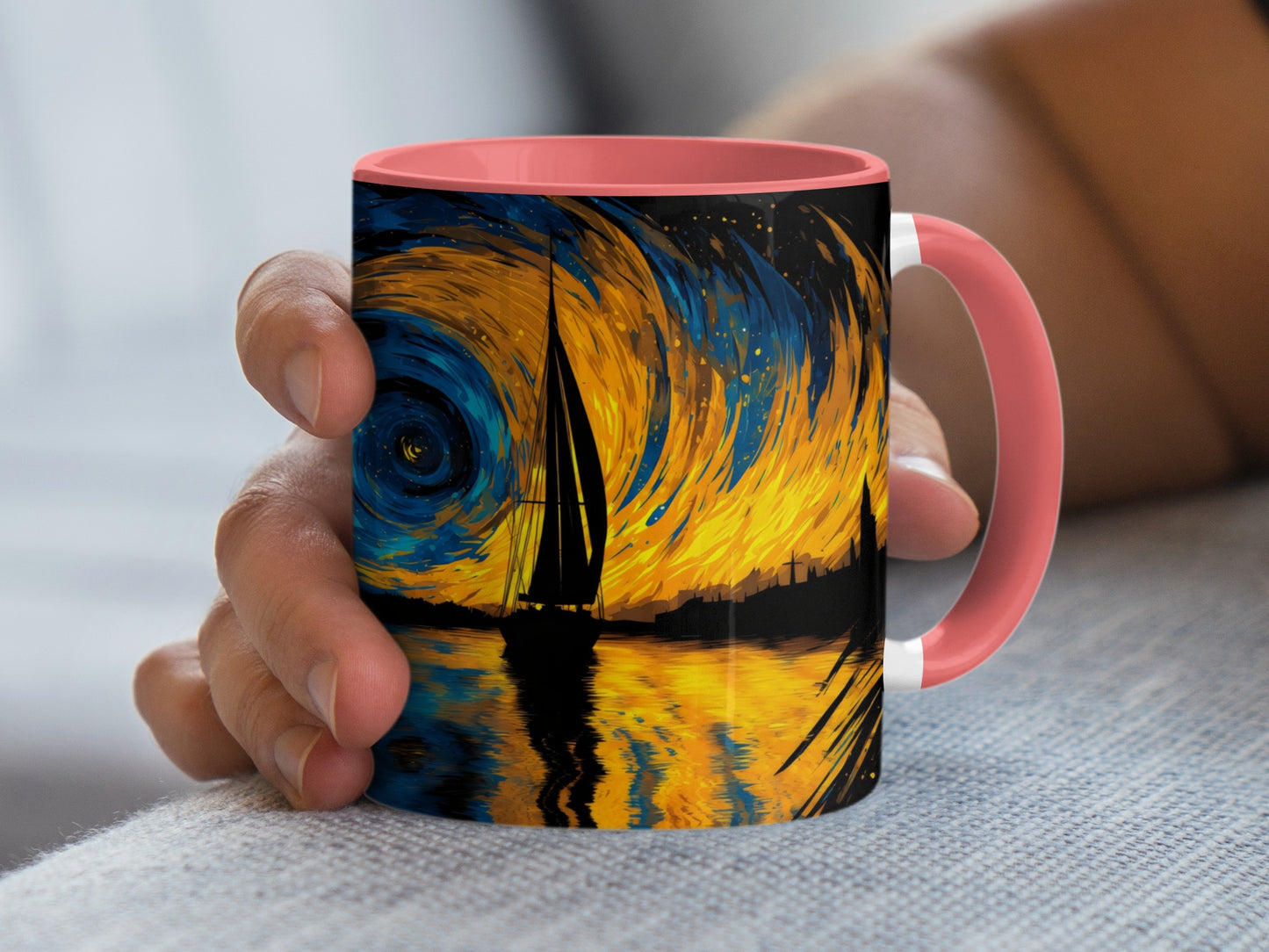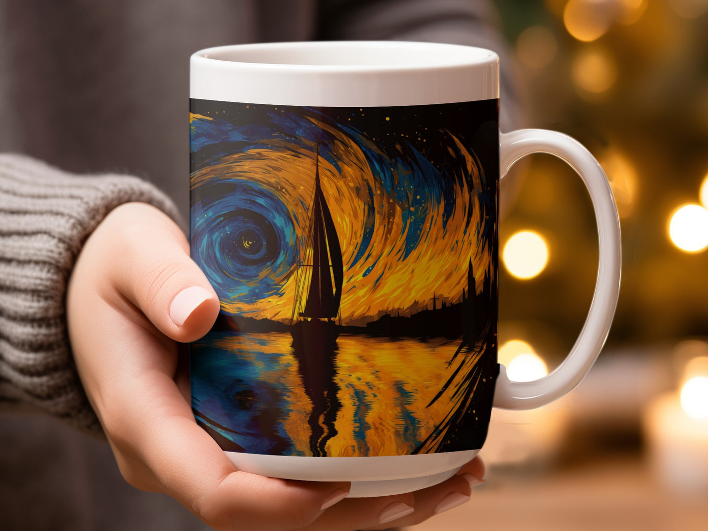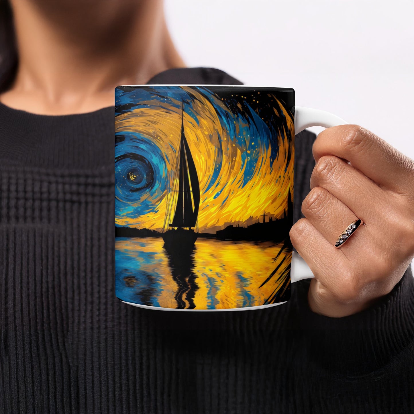 Boat at Sea Against Starry Sky Art Theme Design Mug