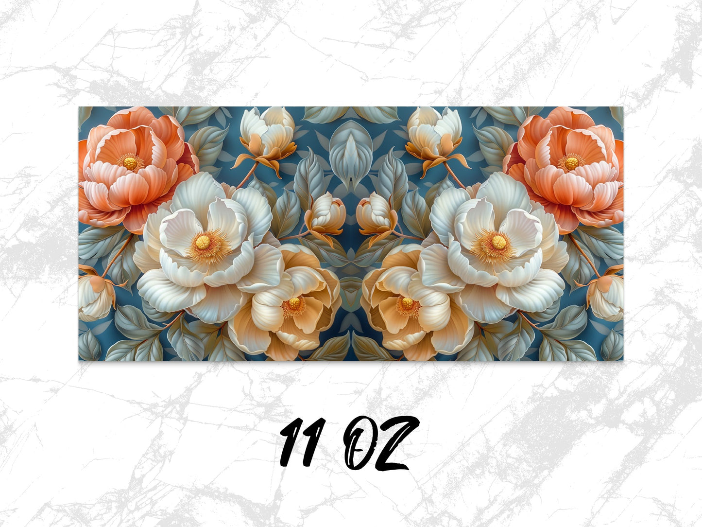 Adorn your mugs with this elegant floral design featuring beautiful white and peach flowers against a calming blue background. Perfect for adding a touch of beauty to your daily routine.