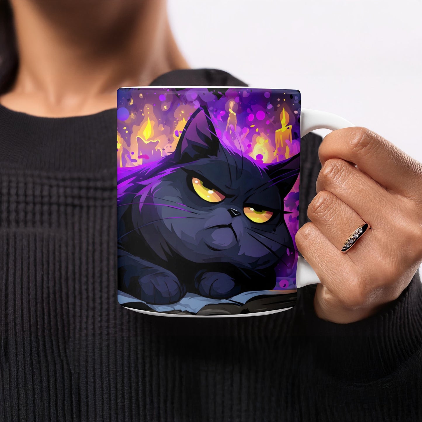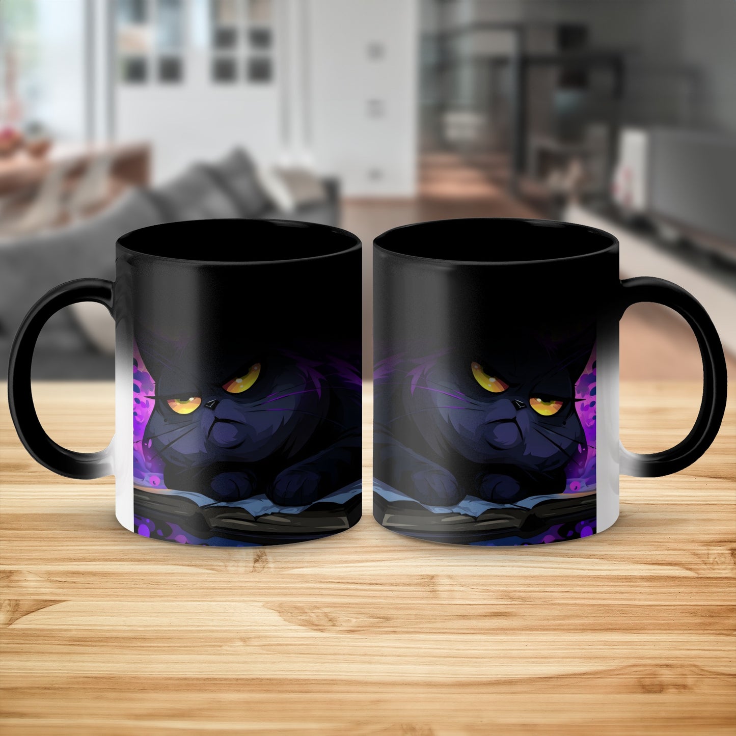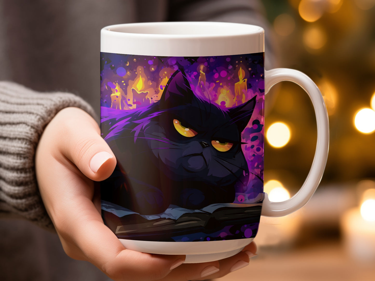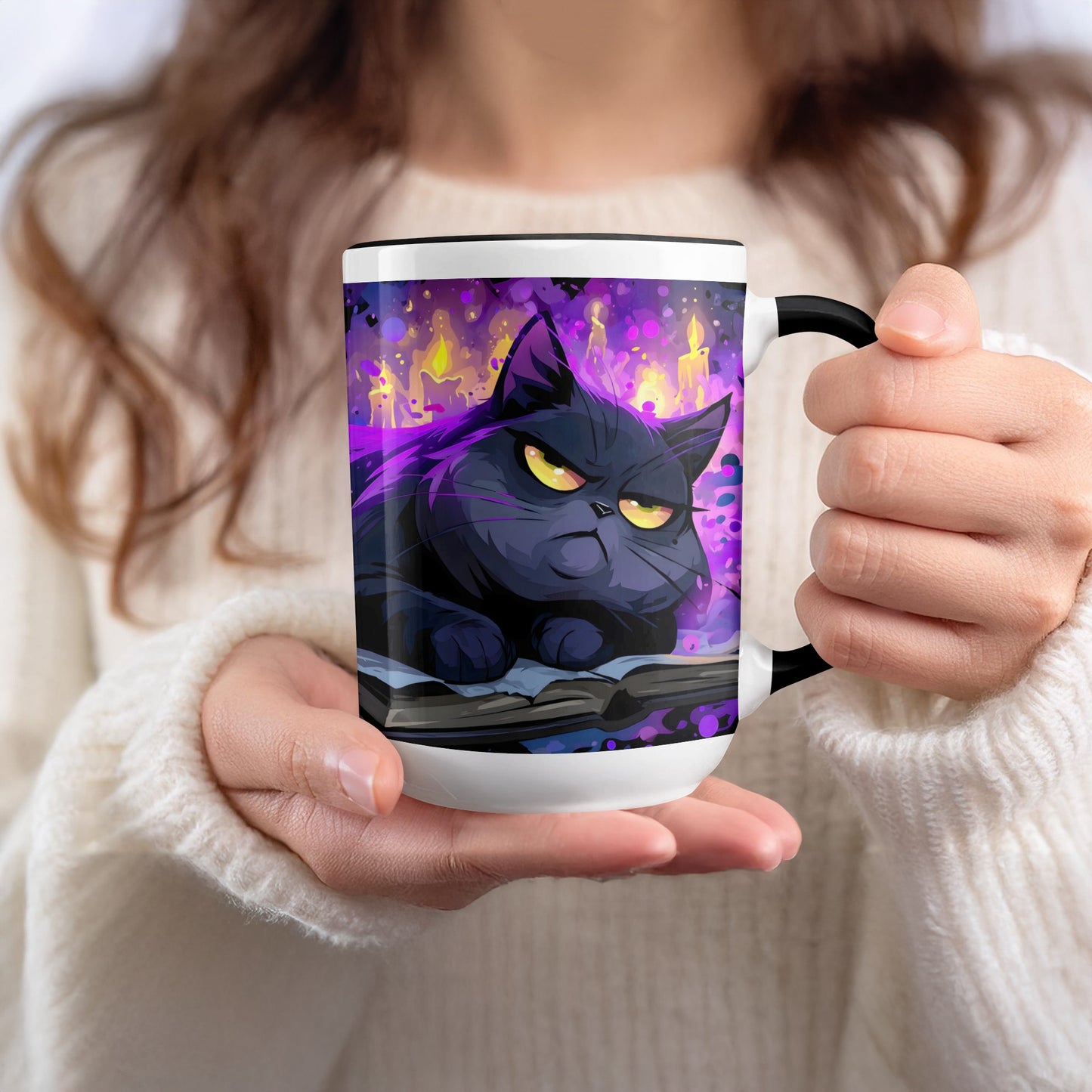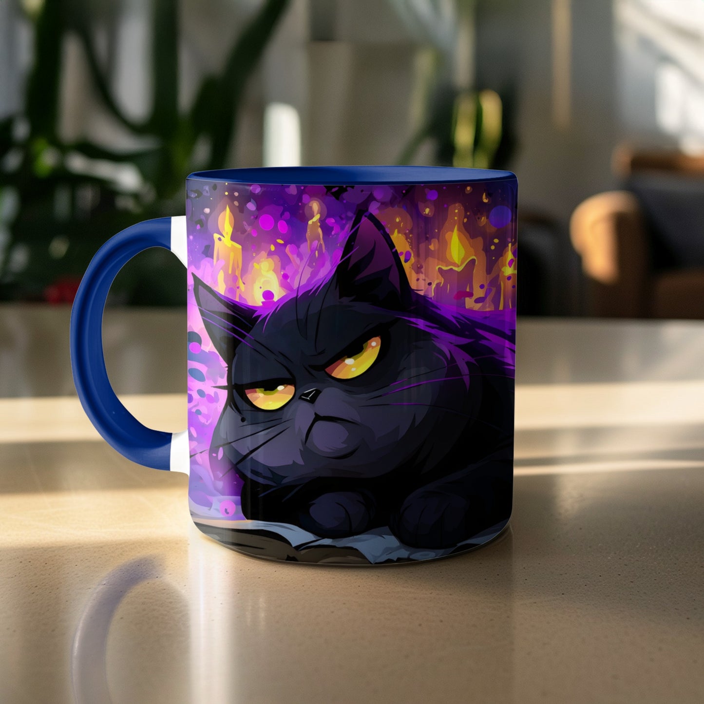 Halloween Schwarze Katze auf Buch mit Kerzen Zaubertasse