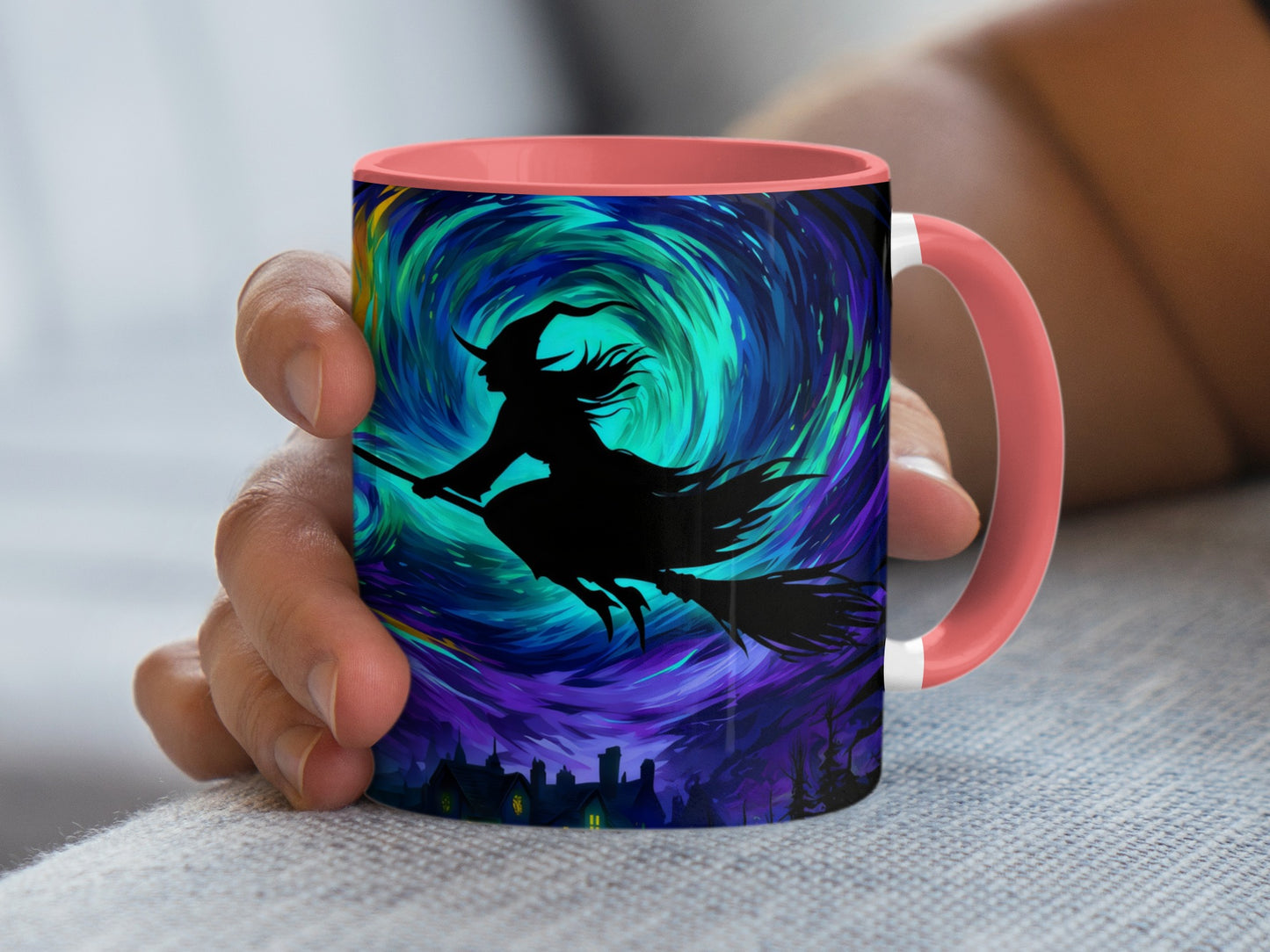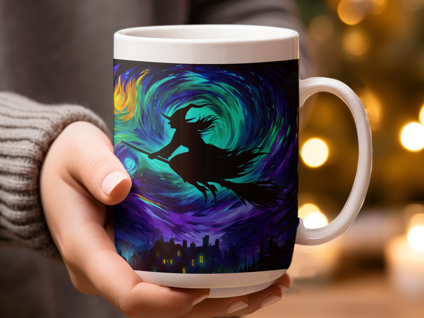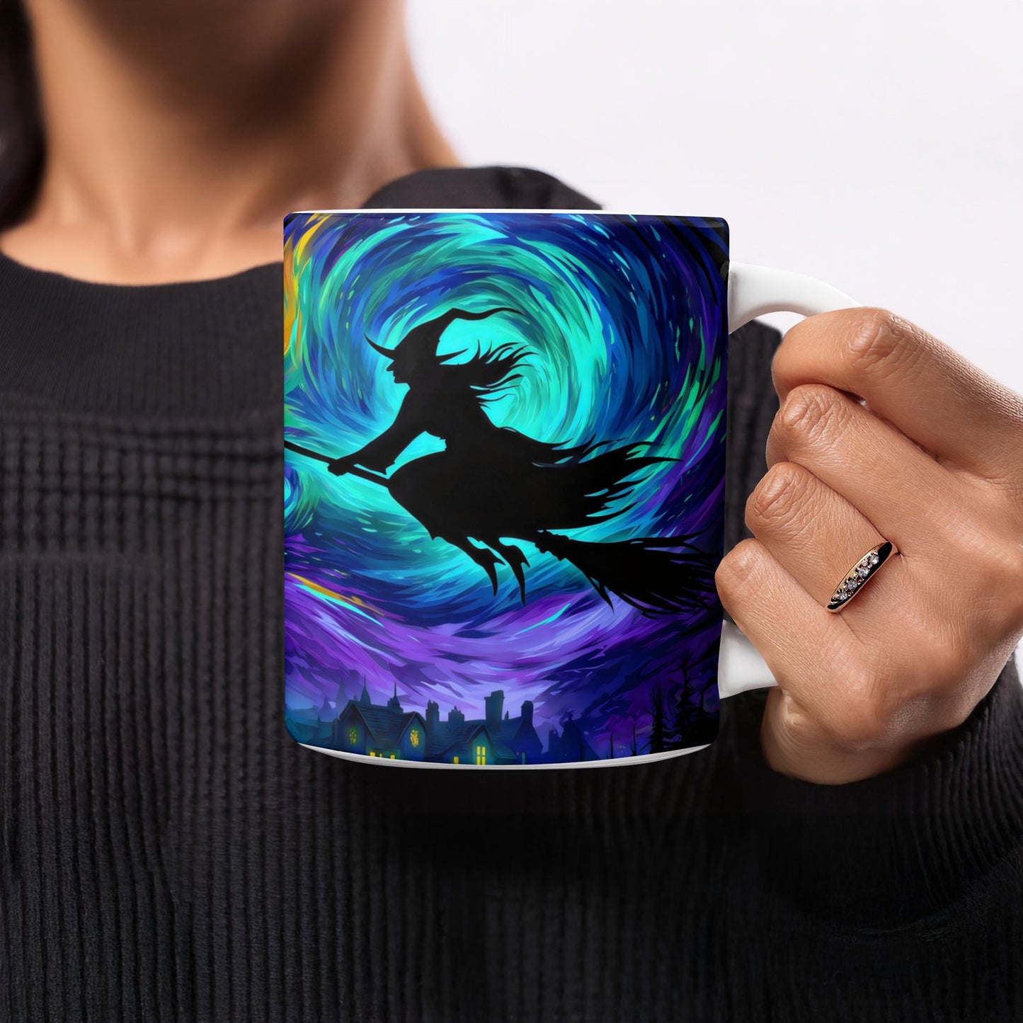 Halloween Night Witch Ride Over Cityscape Design Mug