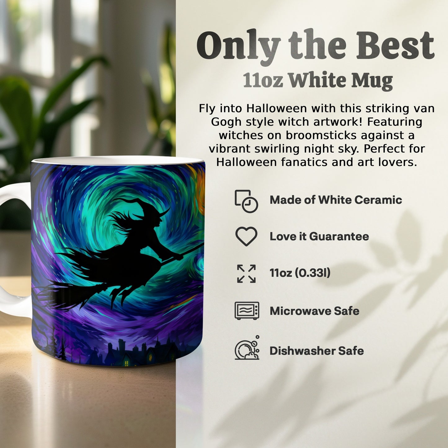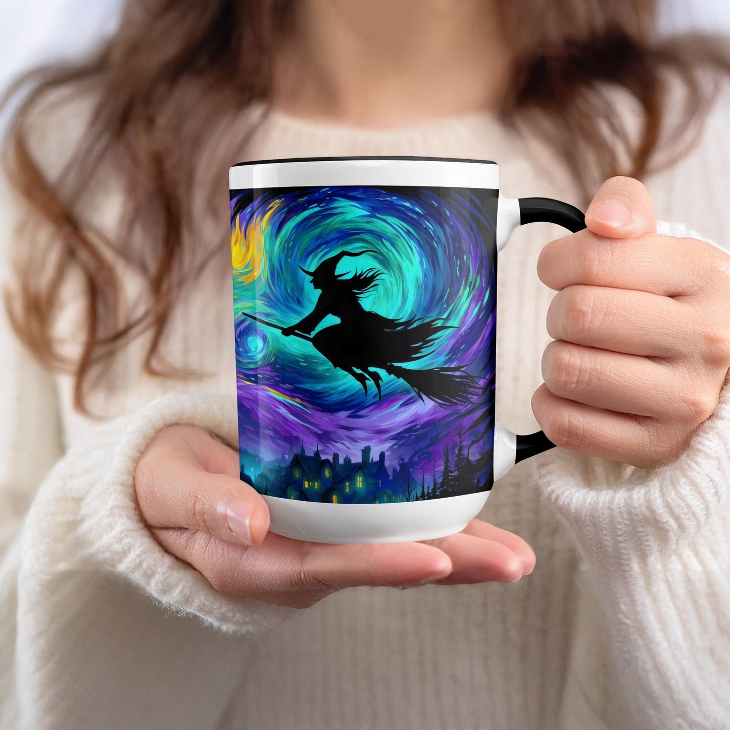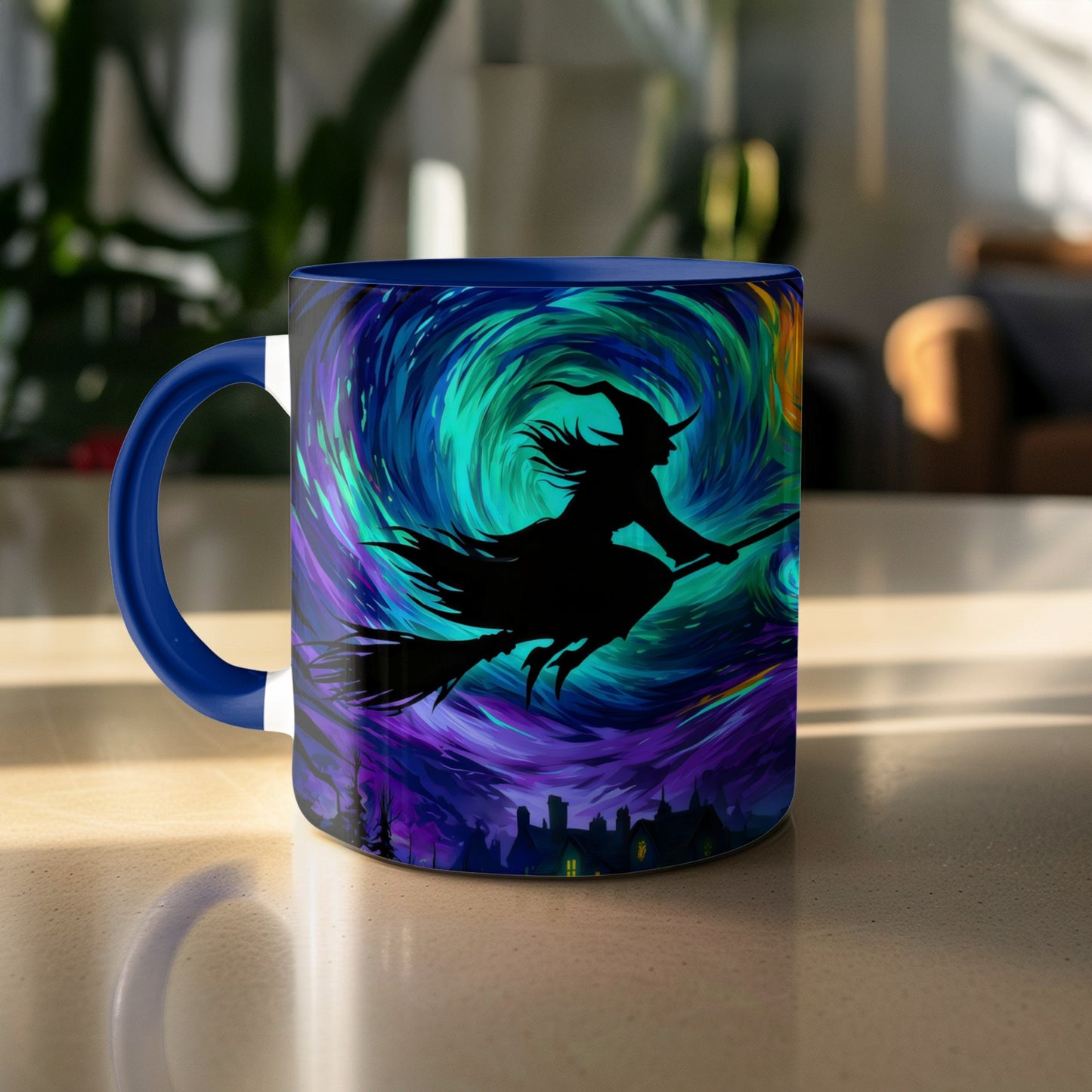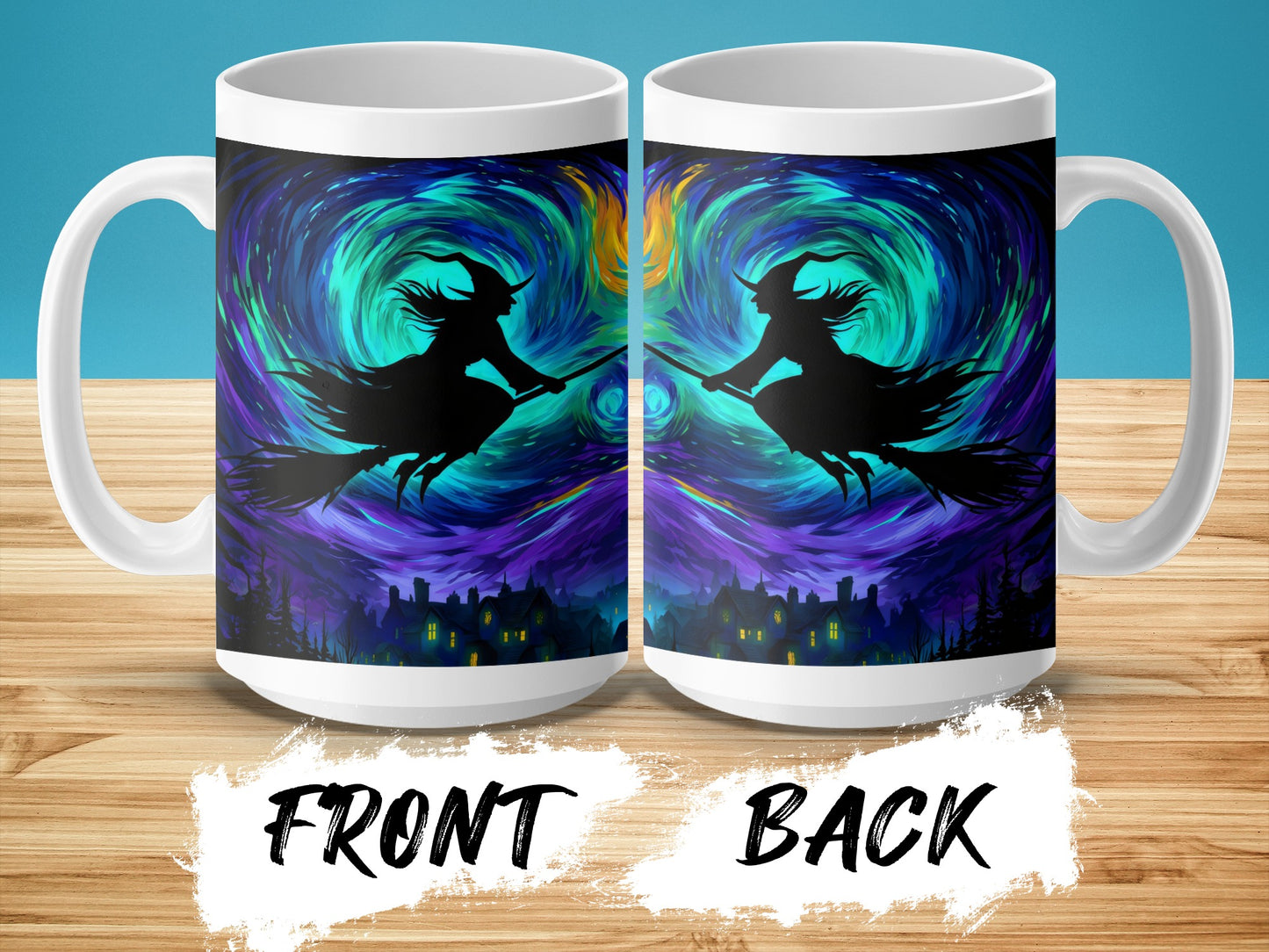 Halloween Night Witch Ride Over Cityscape Design Mug