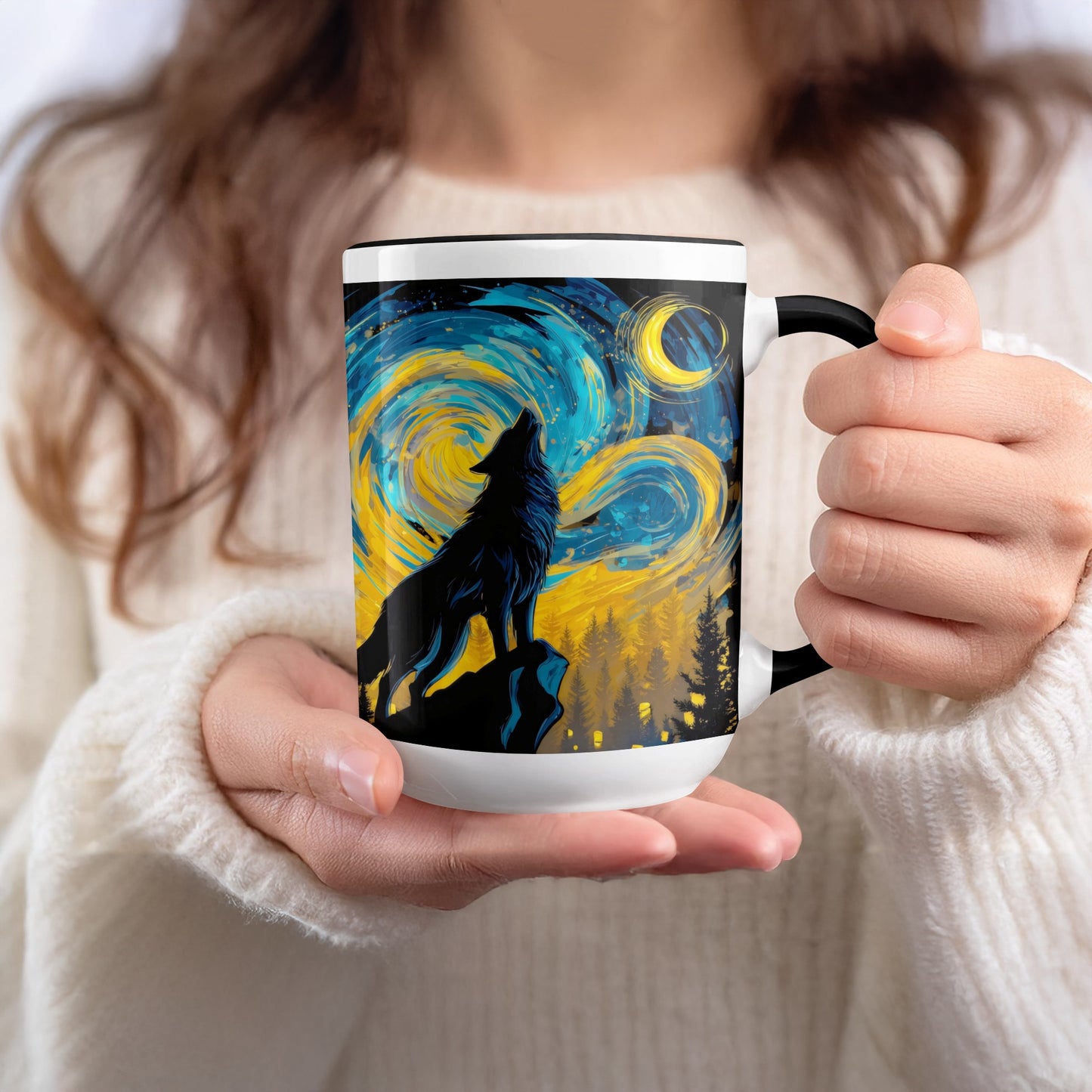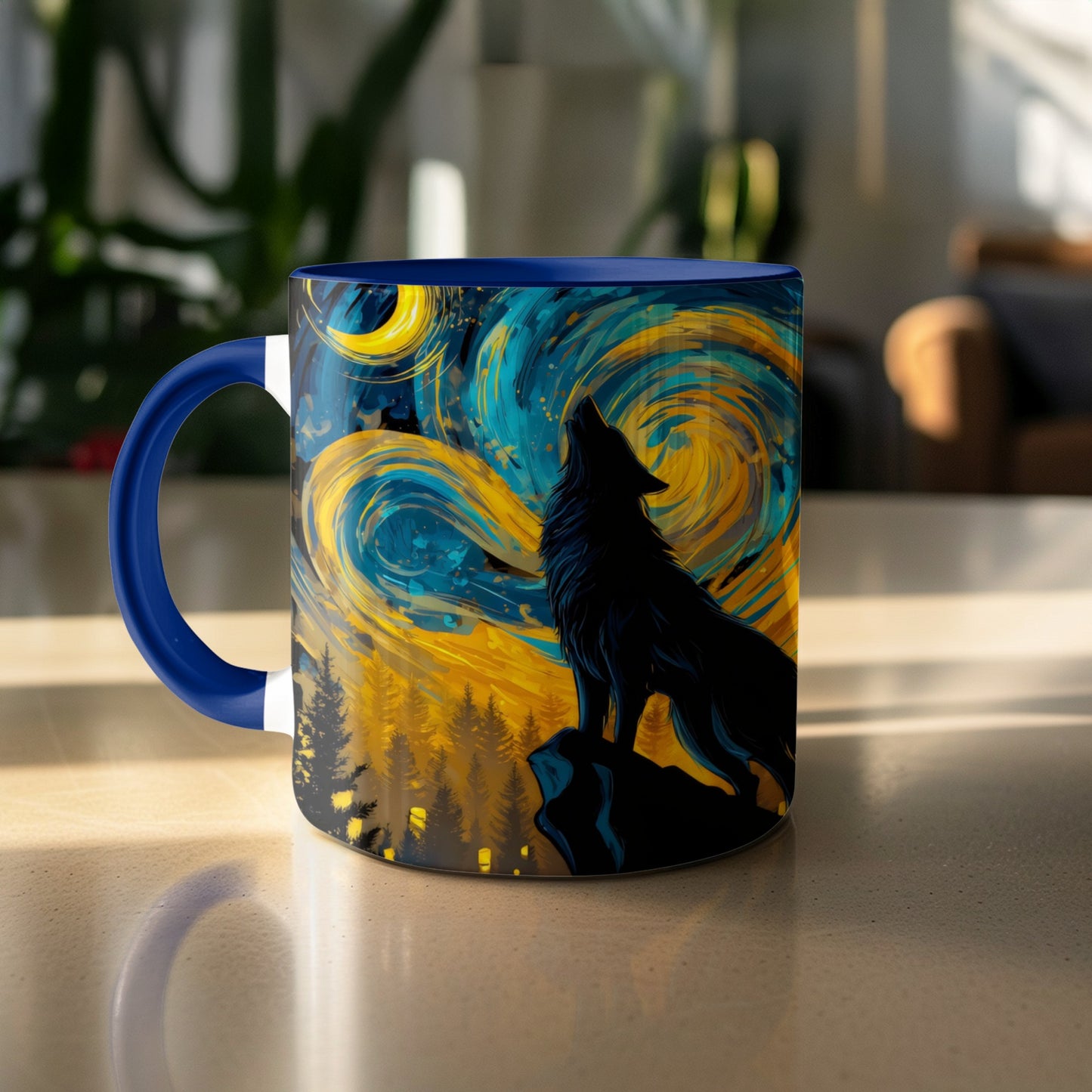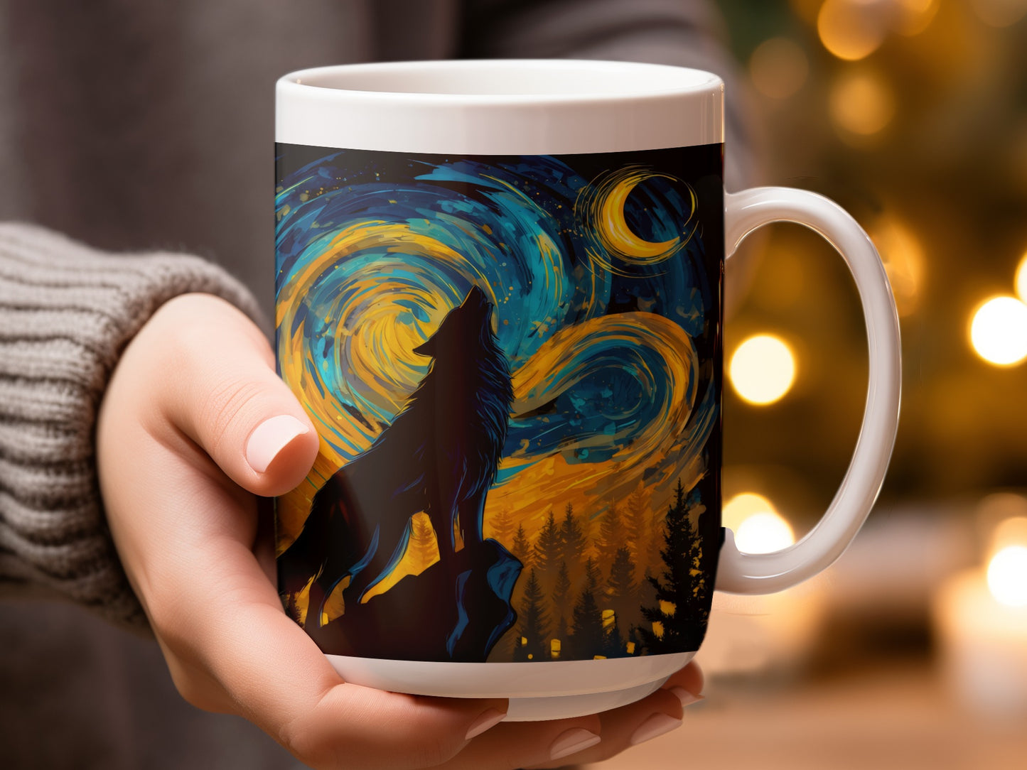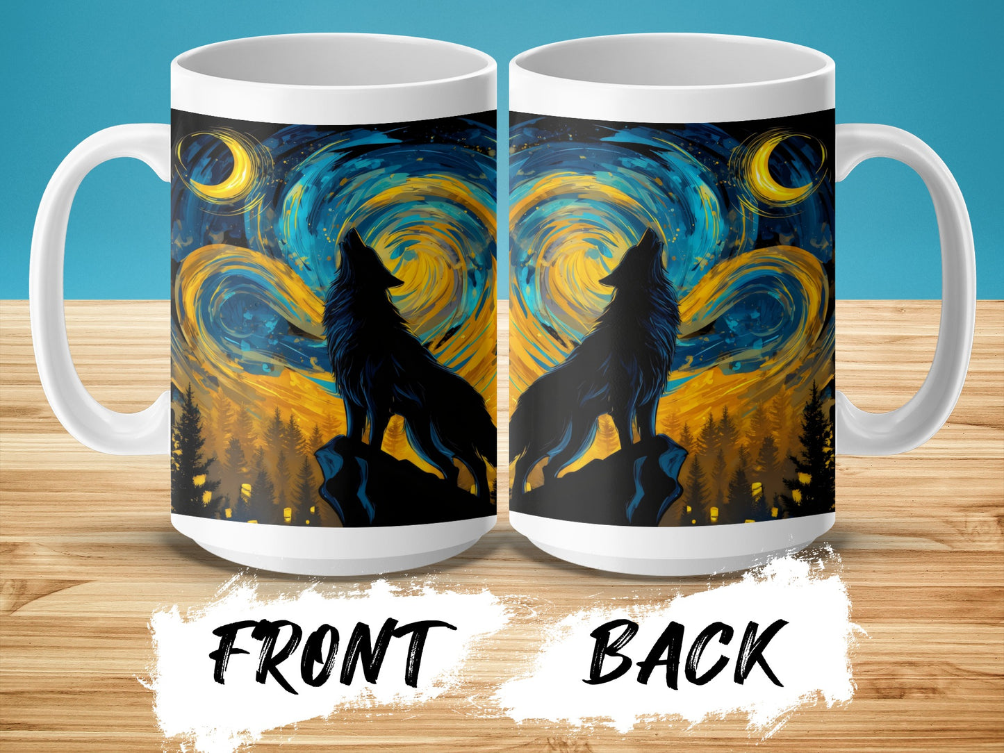 Lone Wolf Howling at Moon Night Sky Art Print Mug