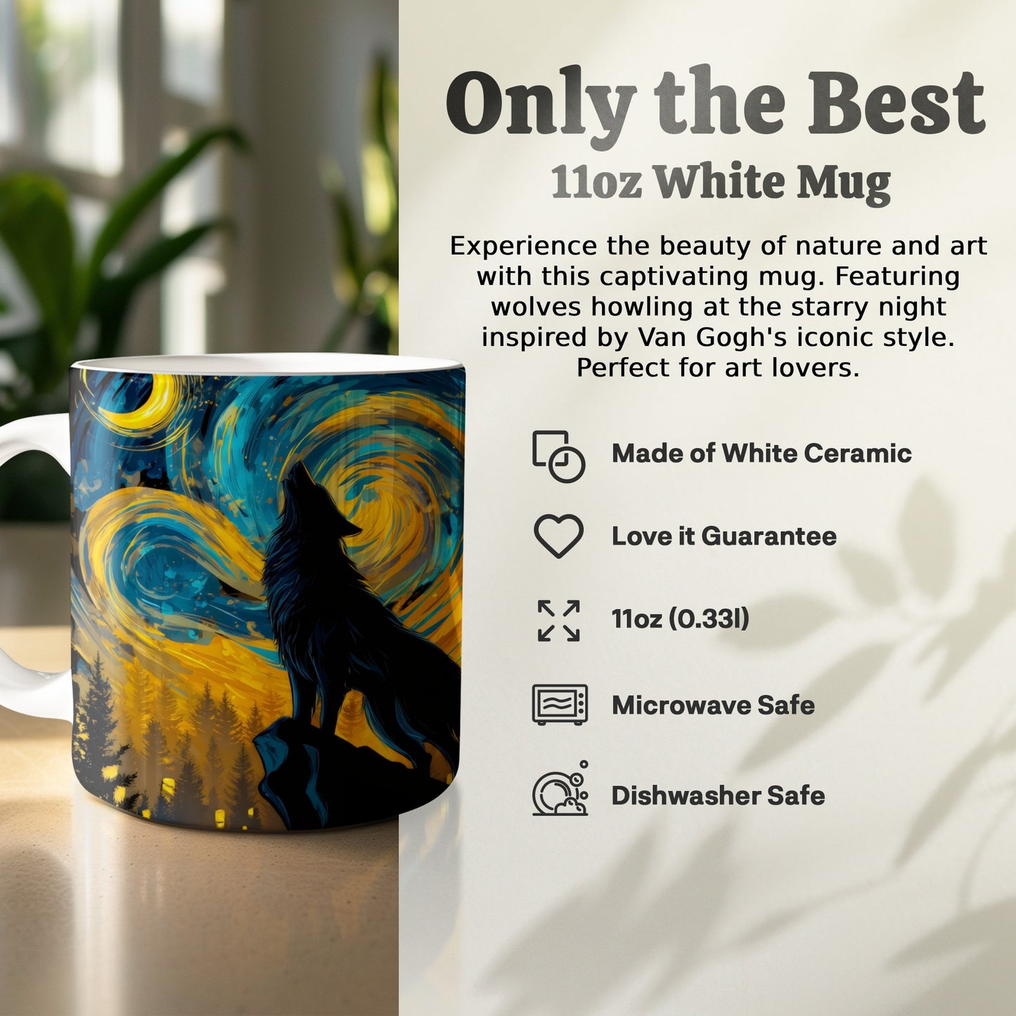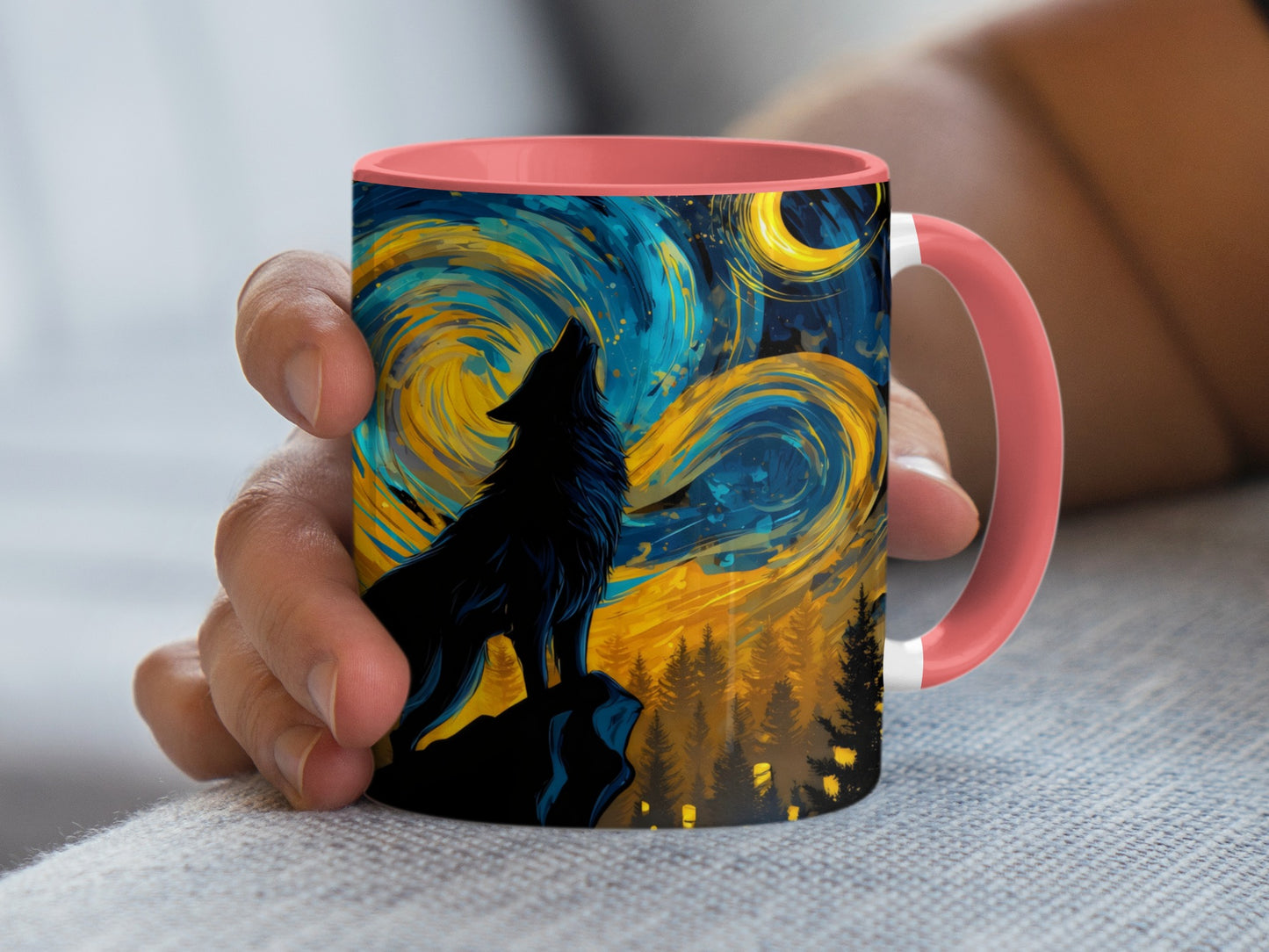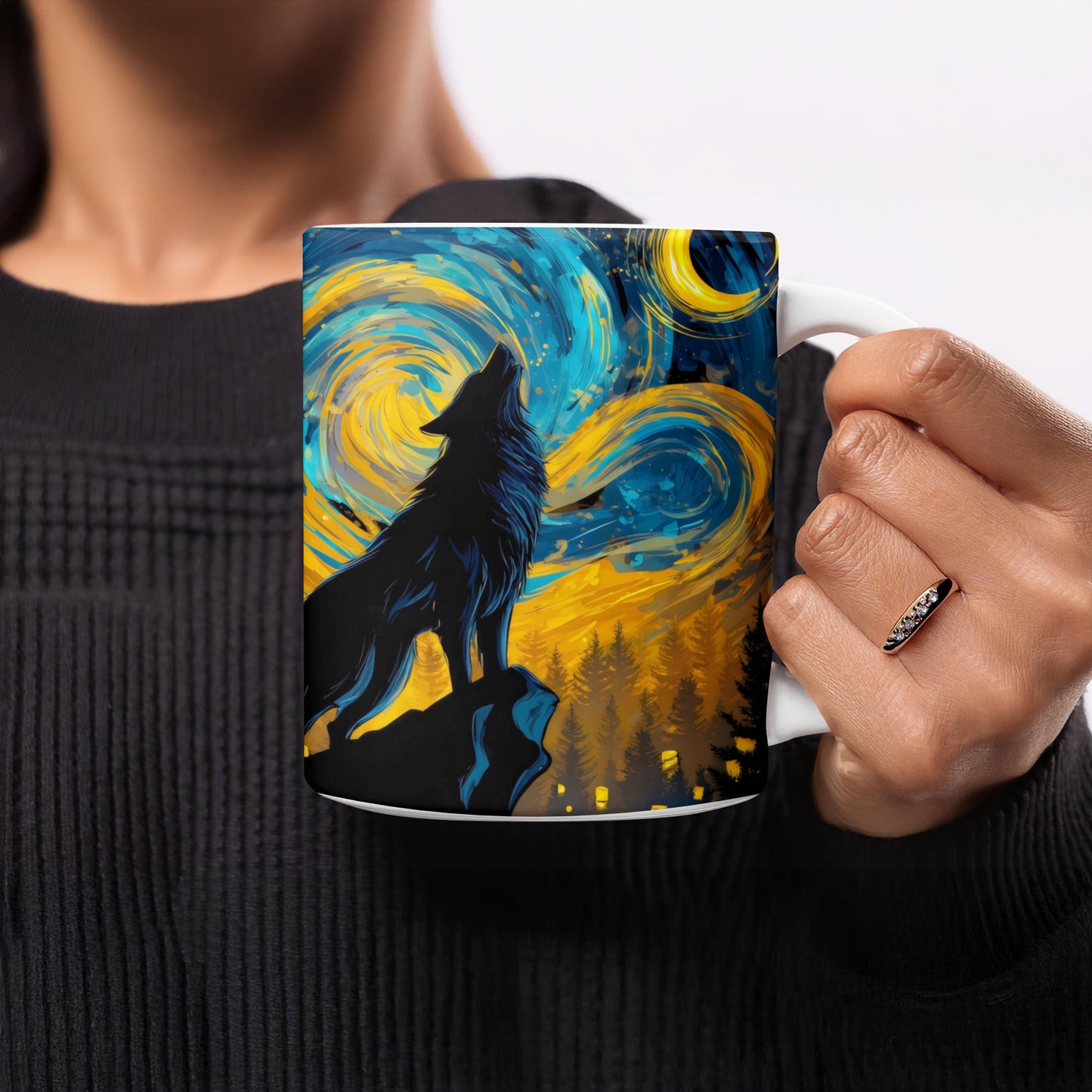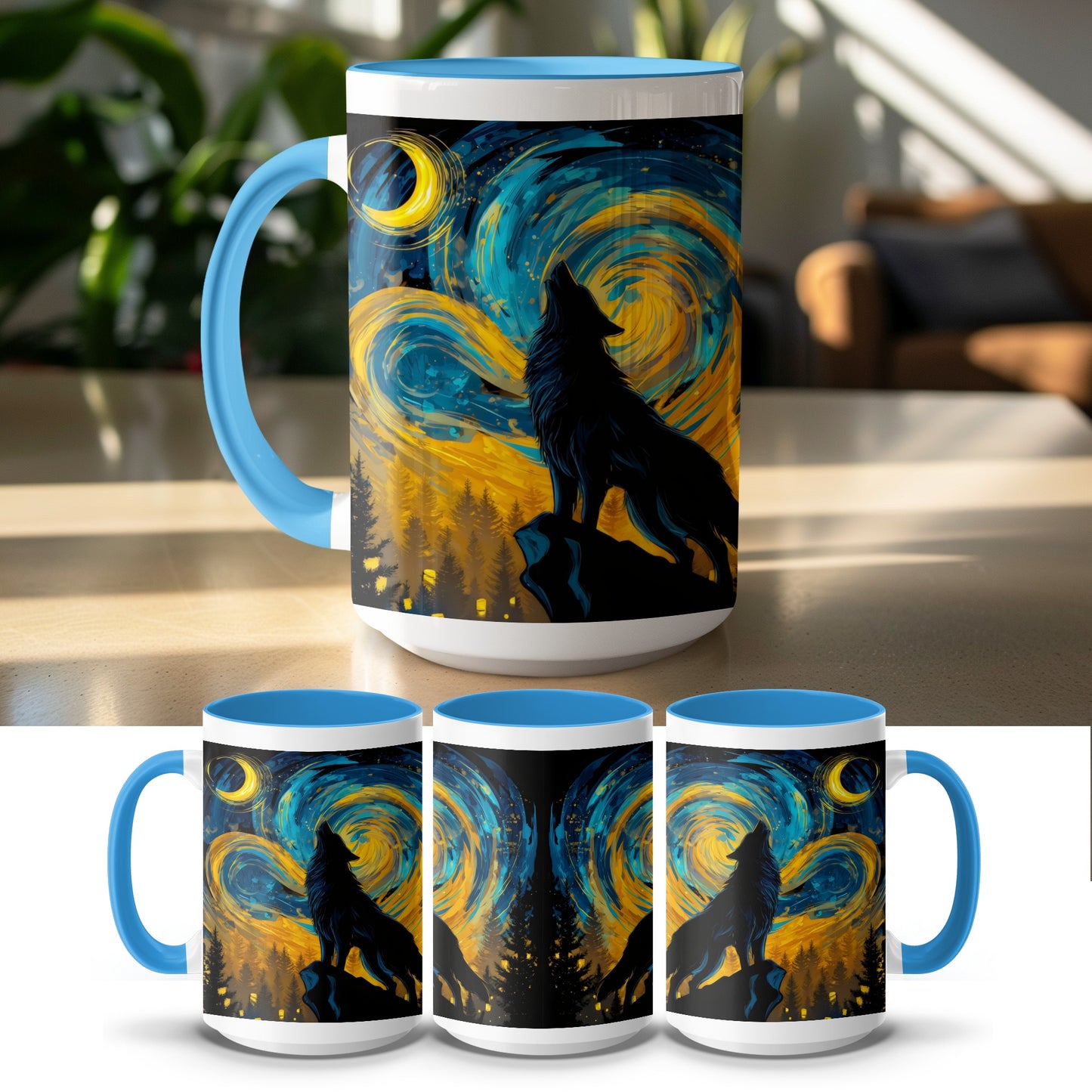 Lone Wolf Howling at Moon Night Sky Art Print Mug