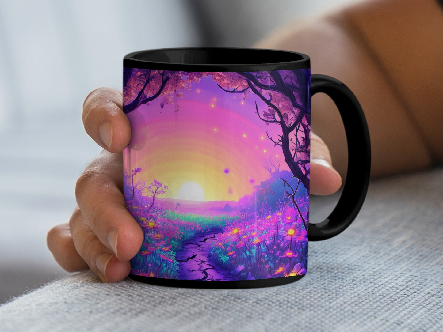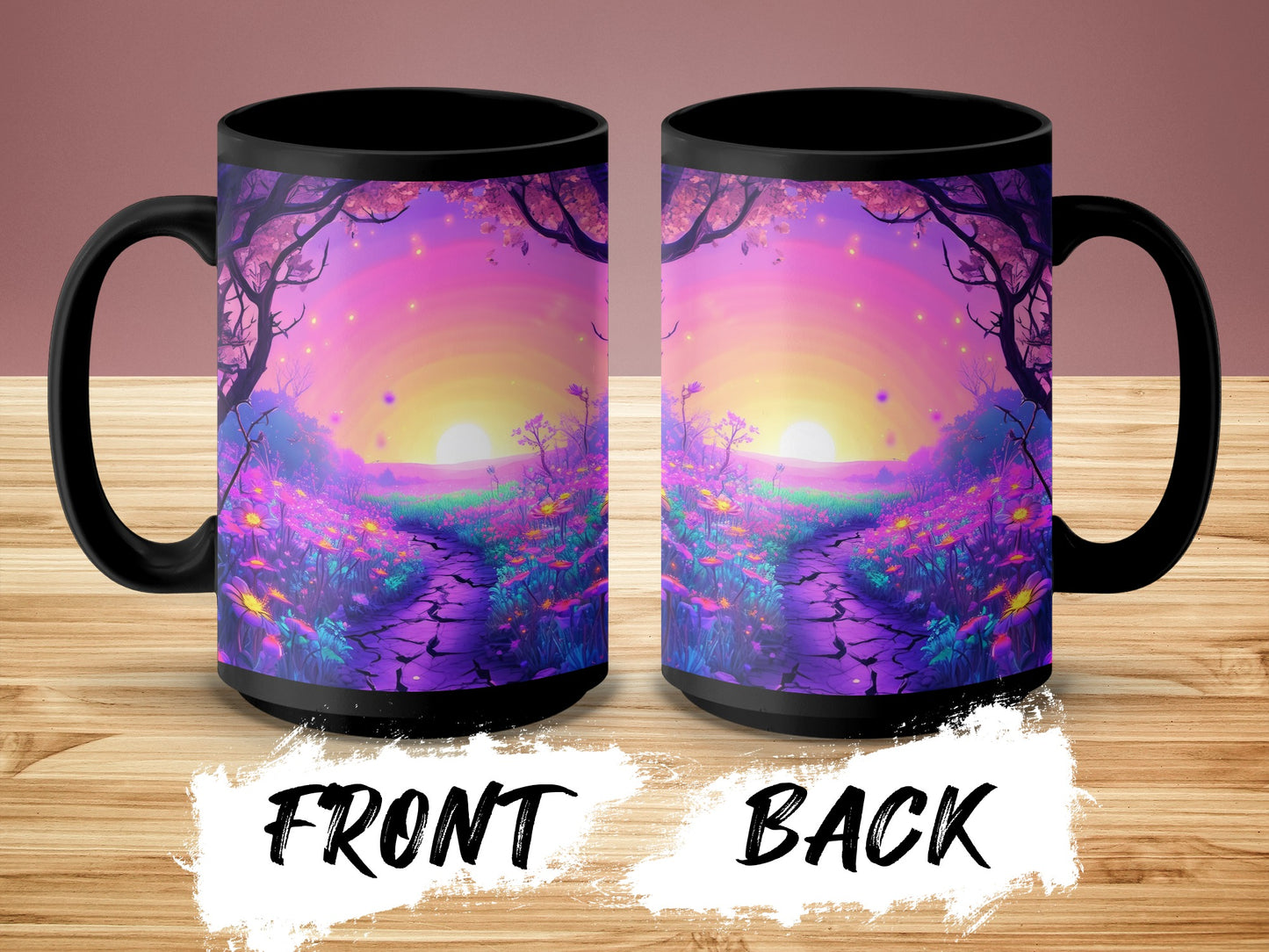Magical Purple Flower Field Under Sunset Scenery Art Mug