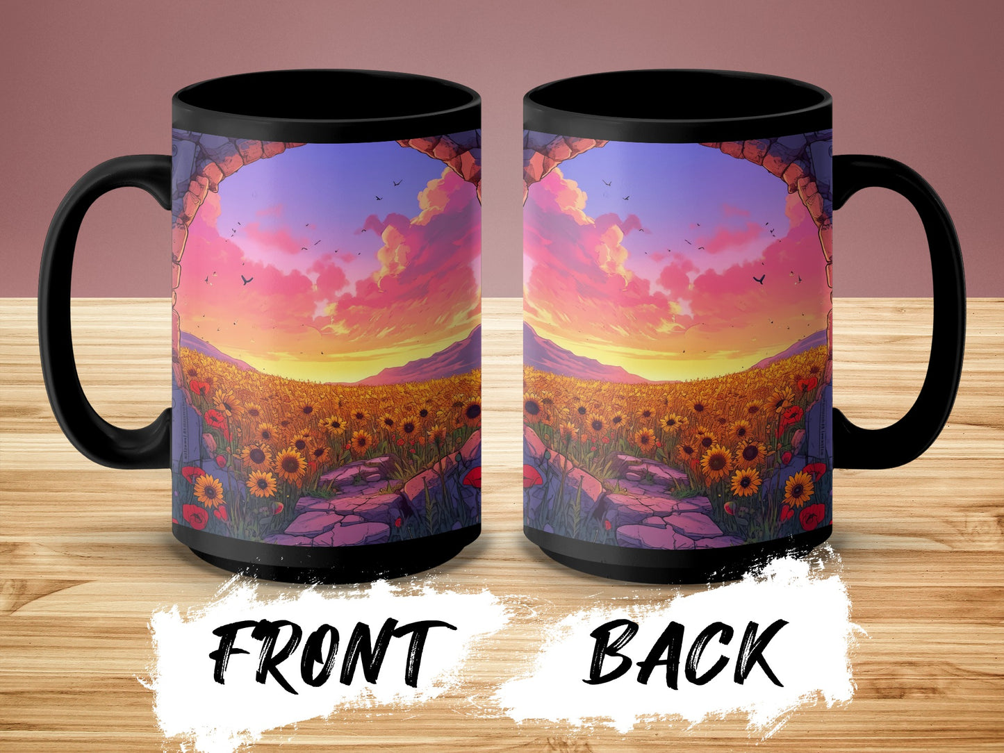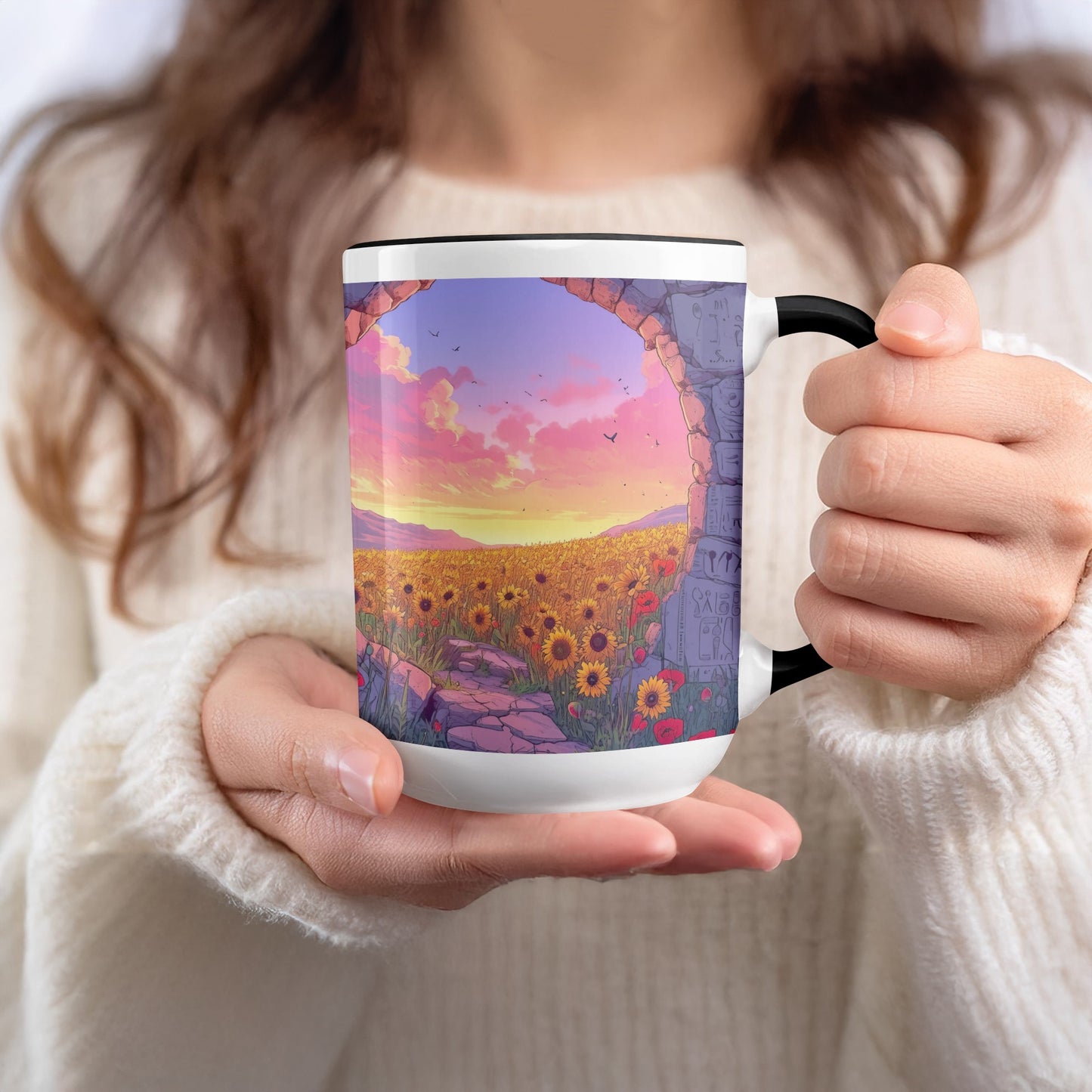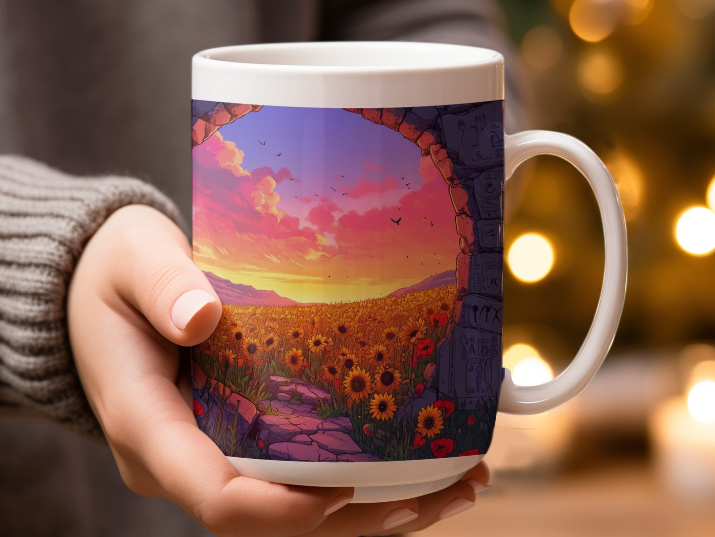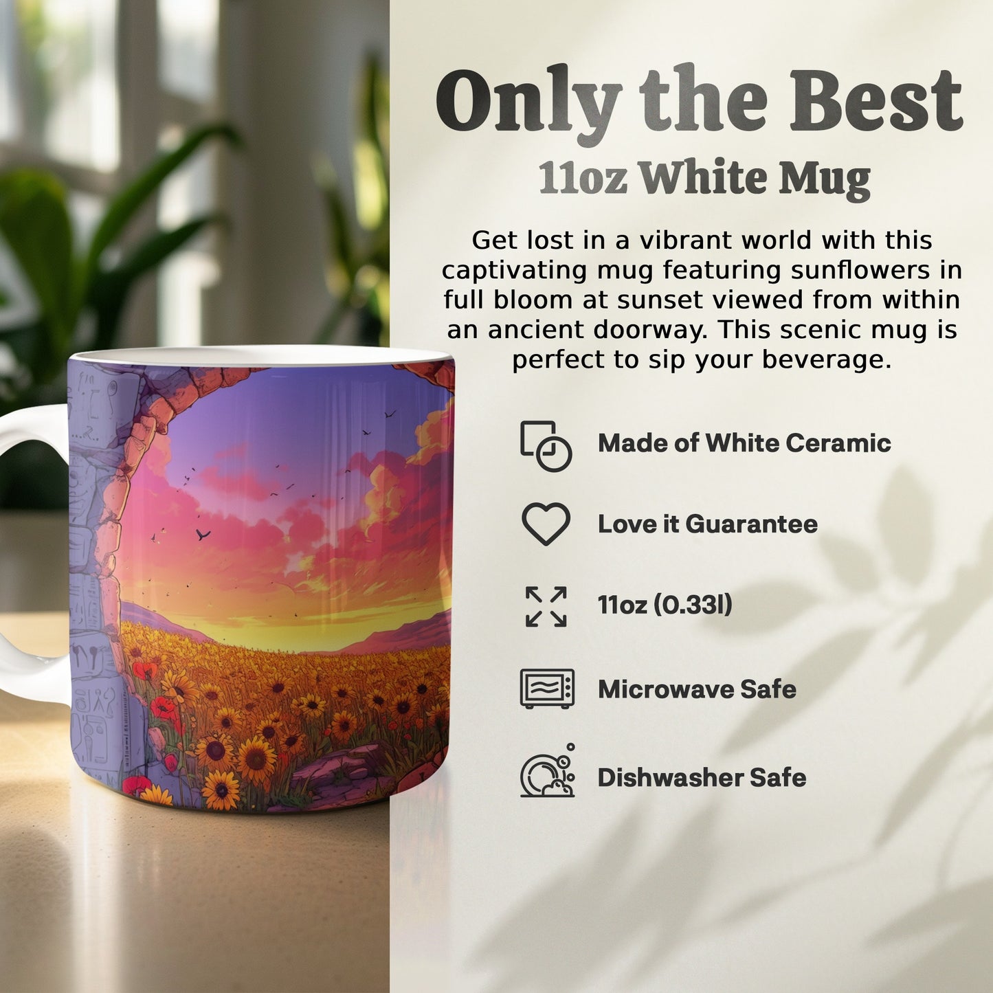 Sunflower Field Sunset With Ancient Doorway Design Mug