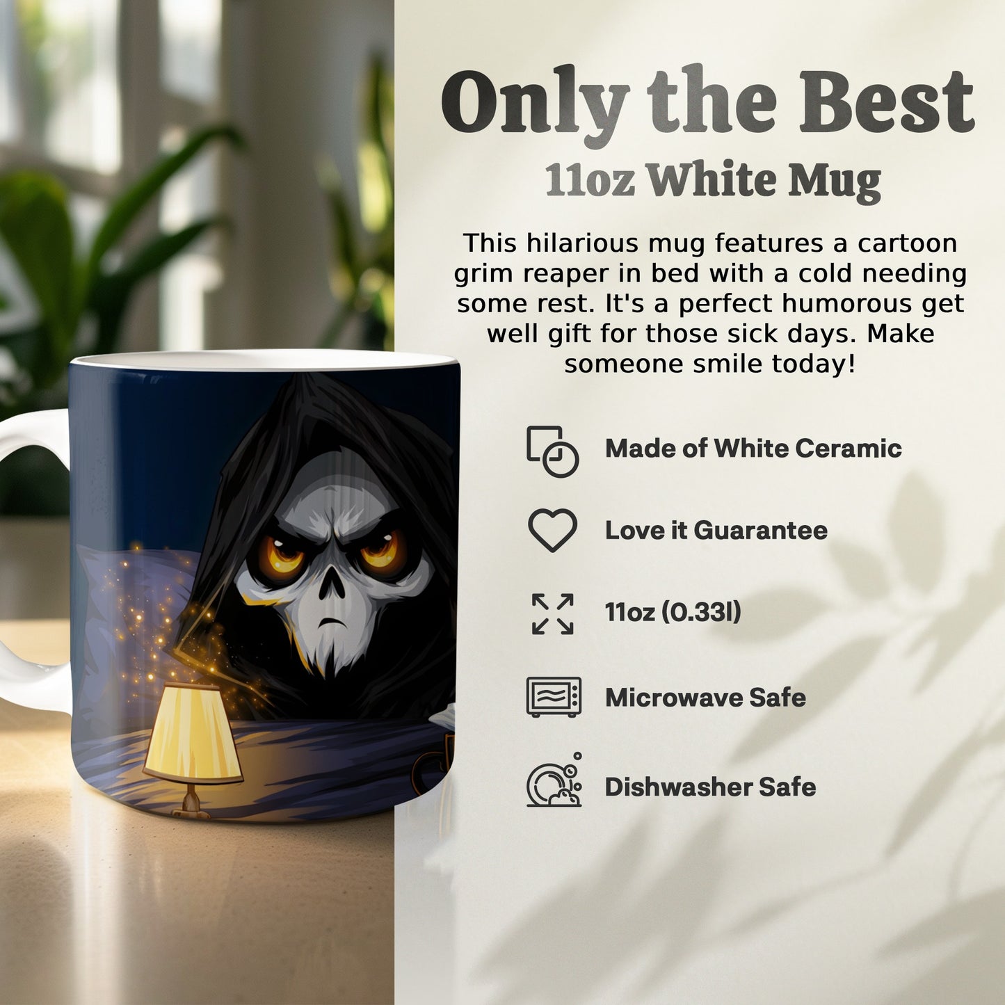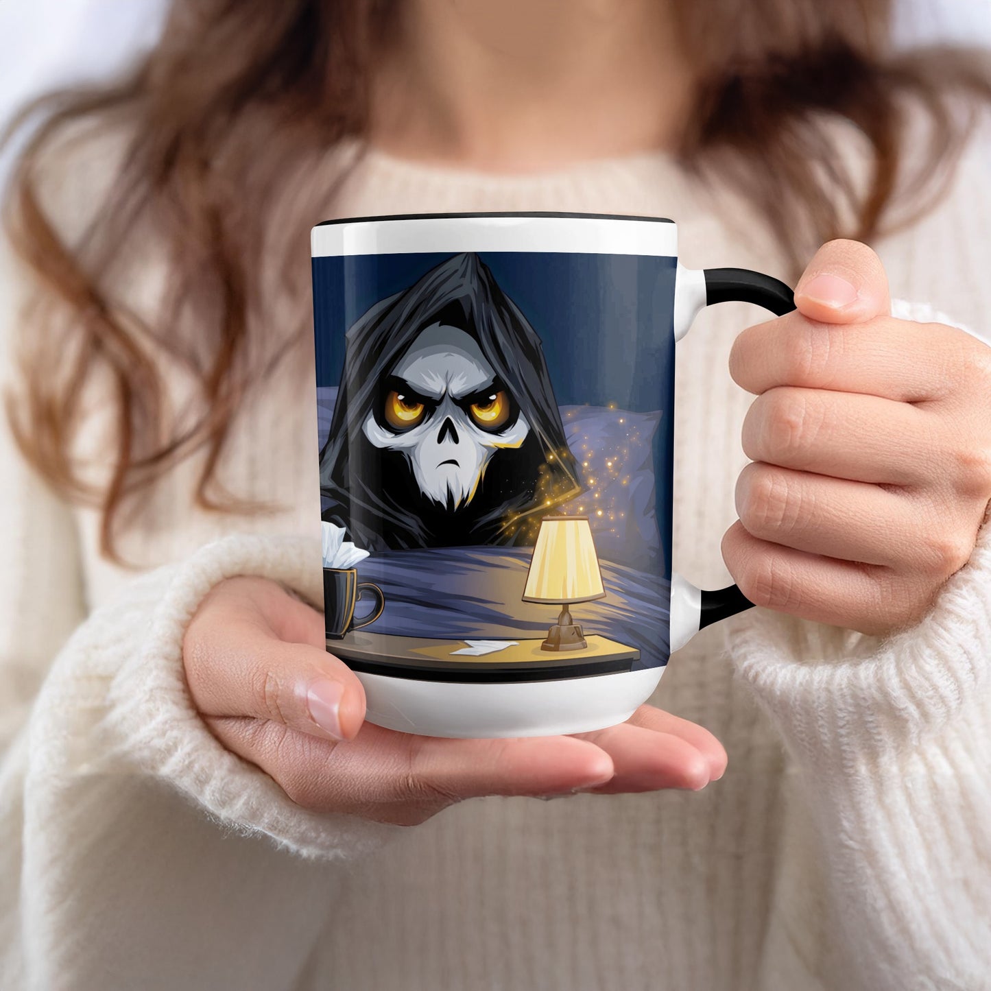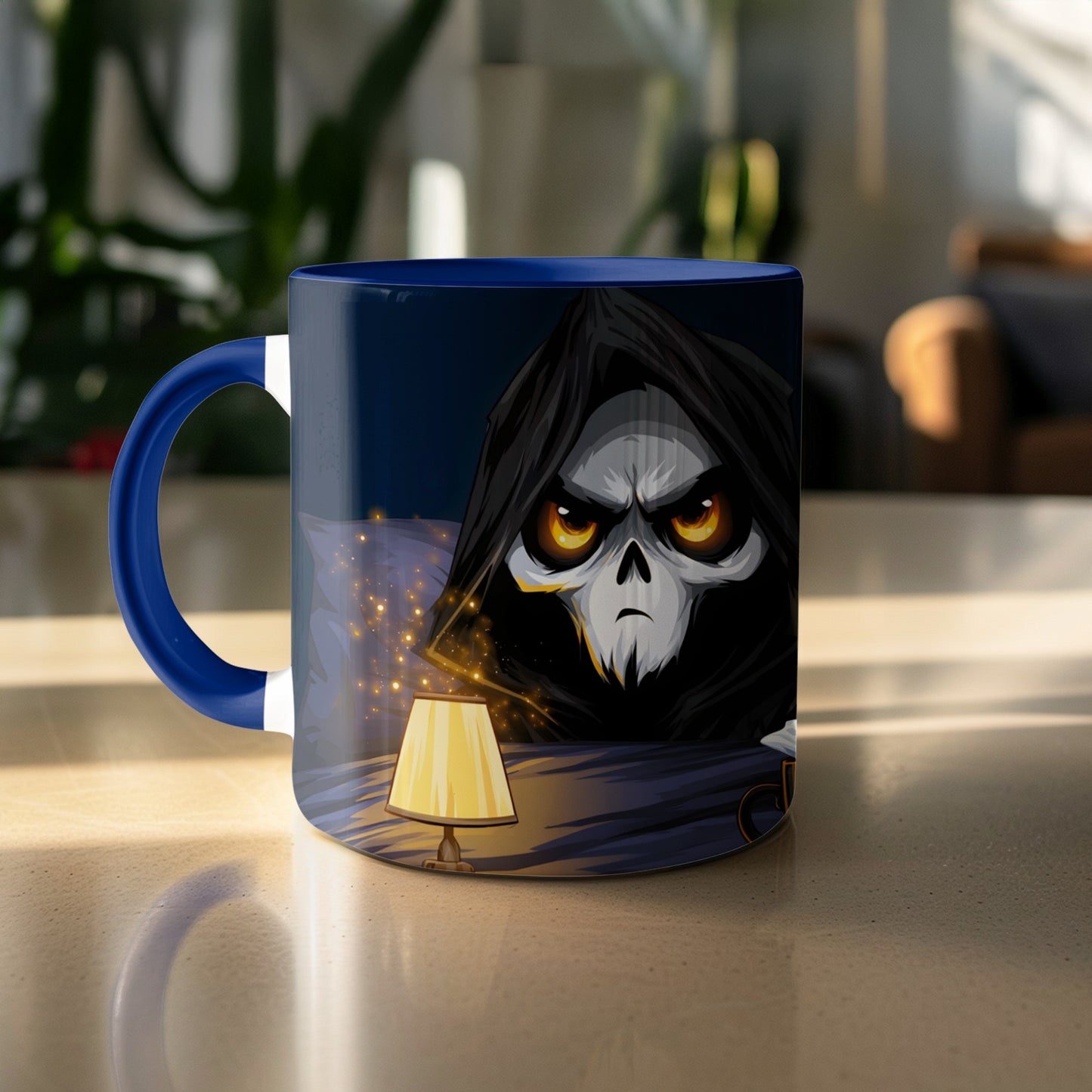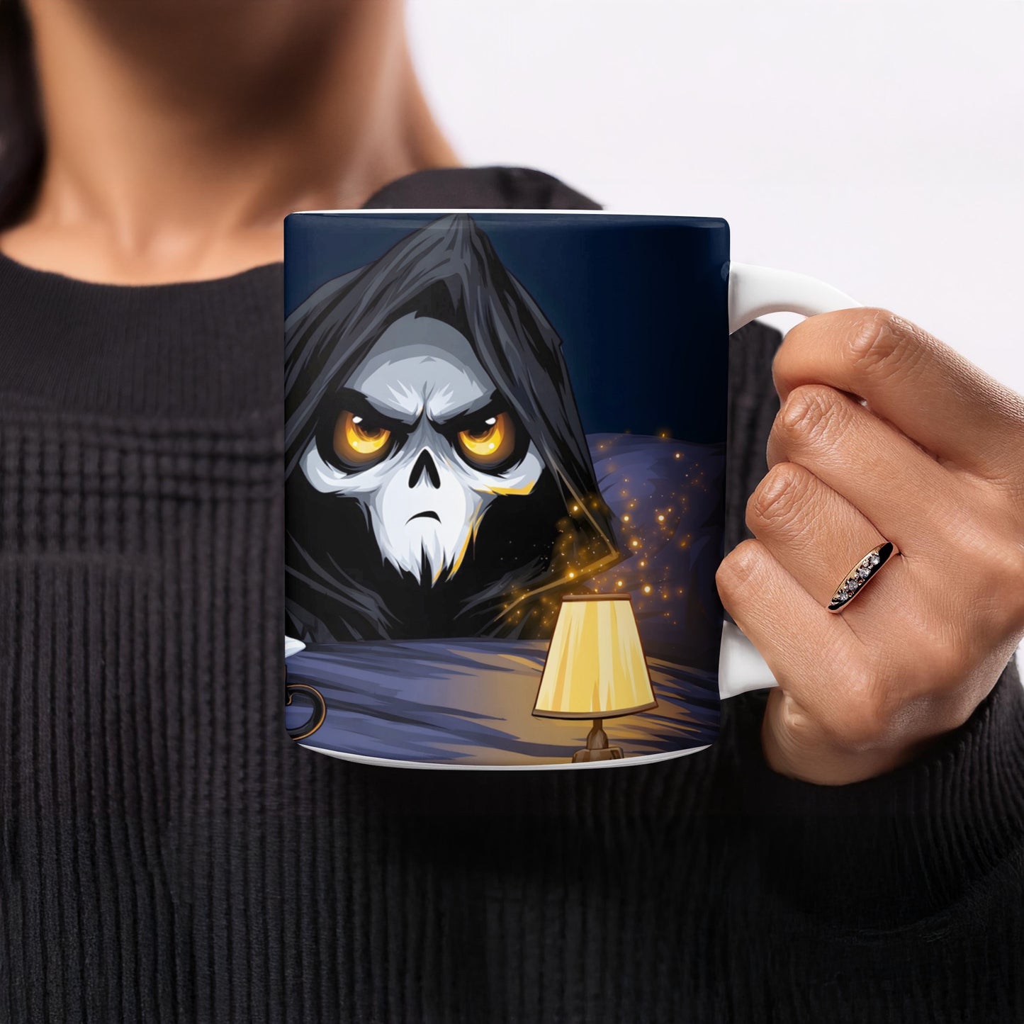 Grim Reaper Mug: Dark Humor, Cartoon, Sleepy, Funny, Spooky Design