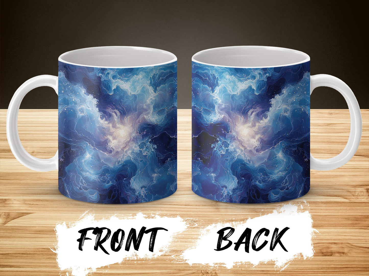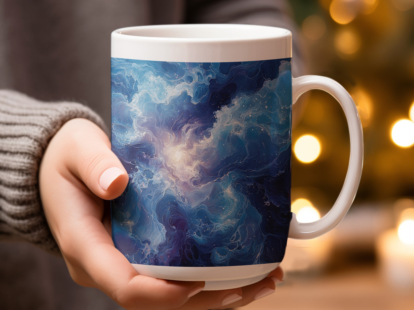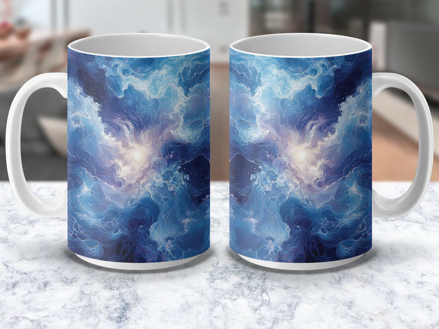 Transform your drinkware with this breathtaking abstract blue and white galaxy design. A stunning visual that will add artistic flair to any mug. Perfect gift idea.