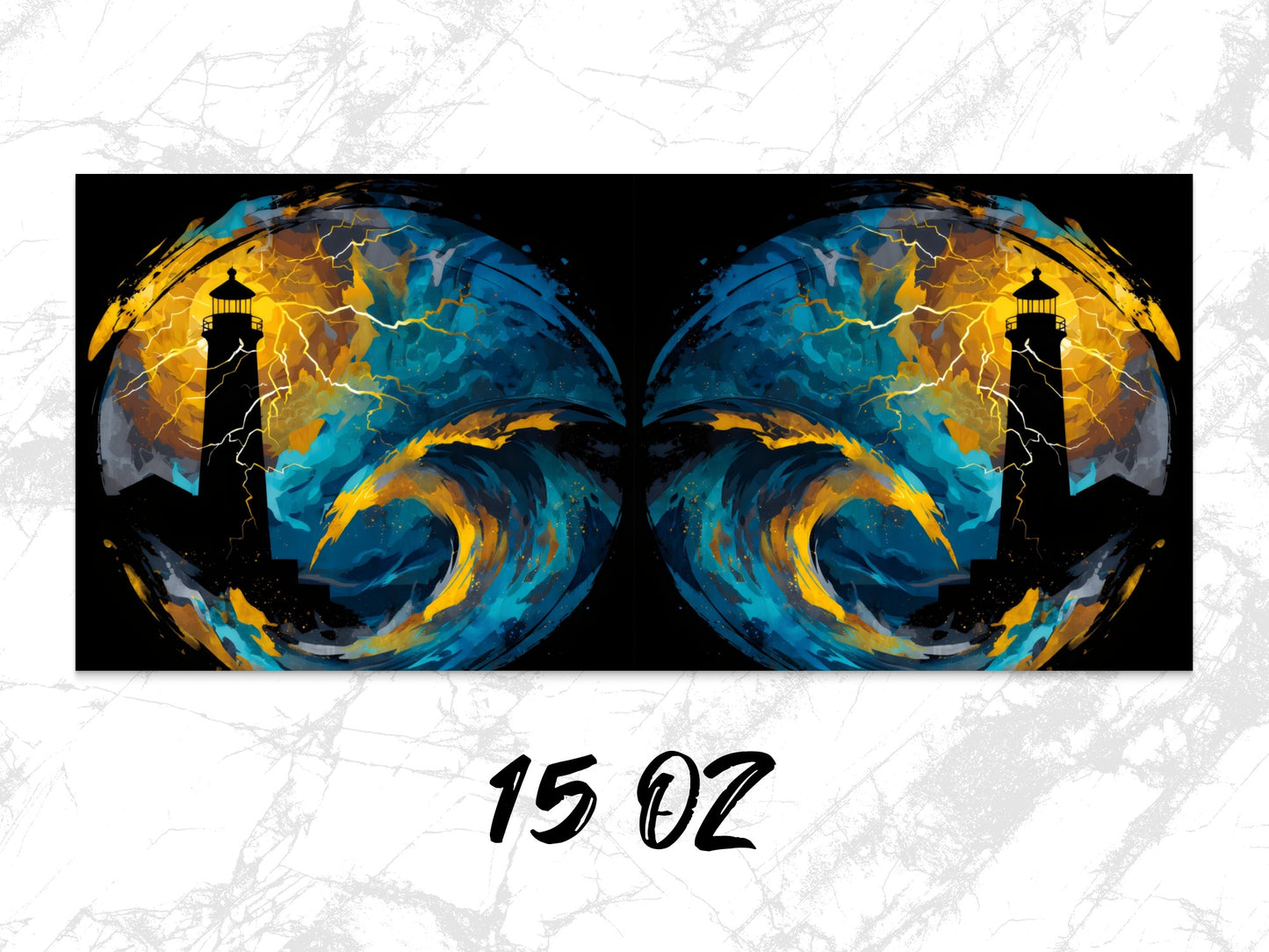 Elevate your mug game with our abstract lighthouse design featuring vibrant blues and golds intertwined with striking lightning strokes. Get yours today! Digital Mug Wraps 11oz & 15oz.