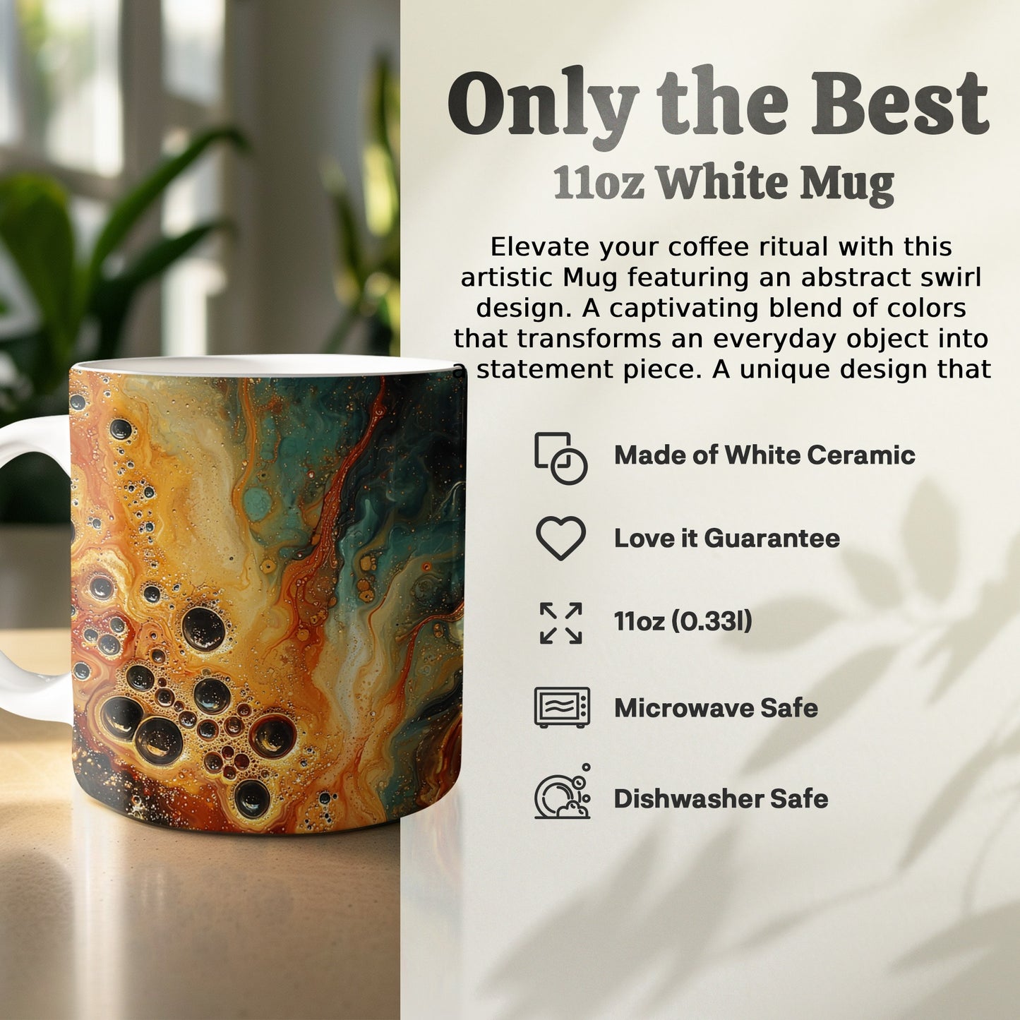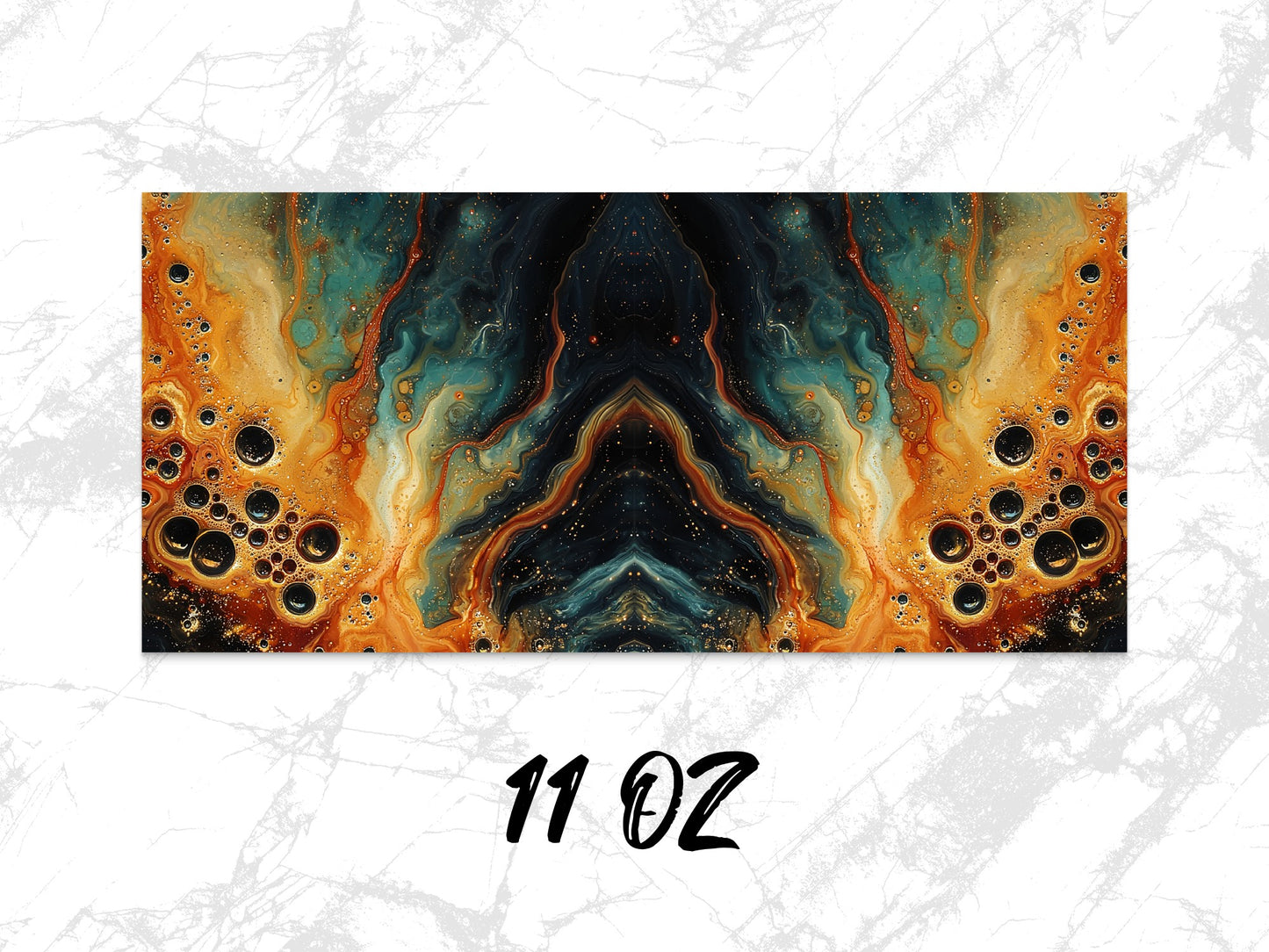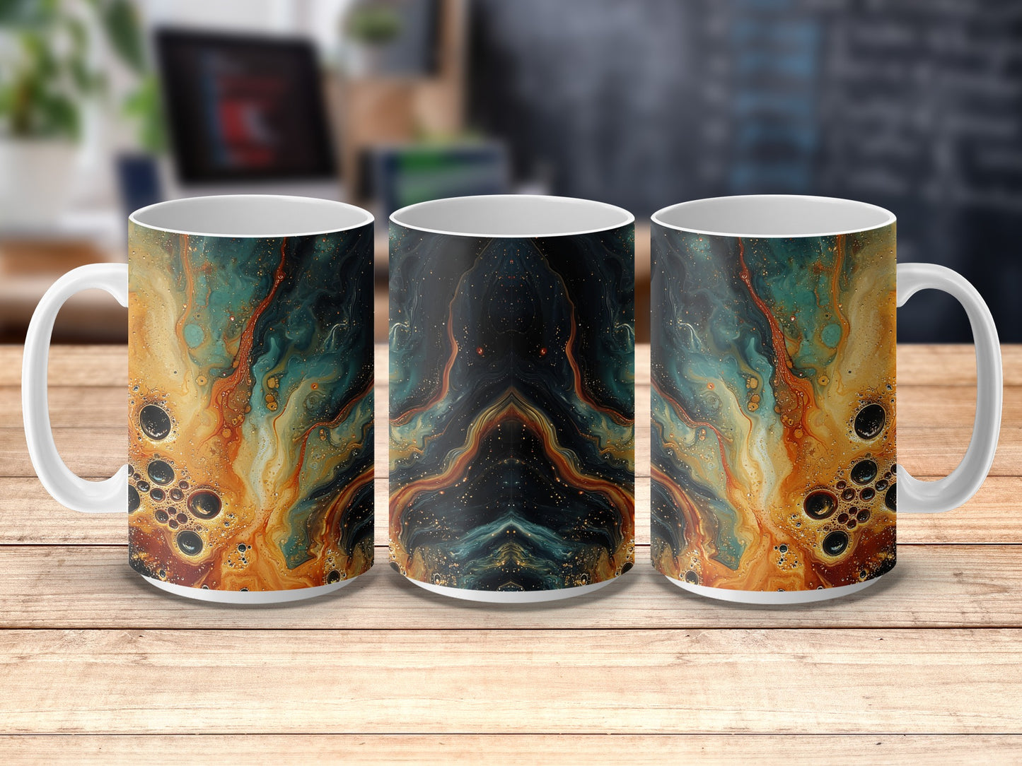 Dive into mesmerizing abstract art with this unique mug wrap. Featuring liquid textures in gold, teal, and dark hues, this design brings artistic flair to your daily beverage enjoyment.
