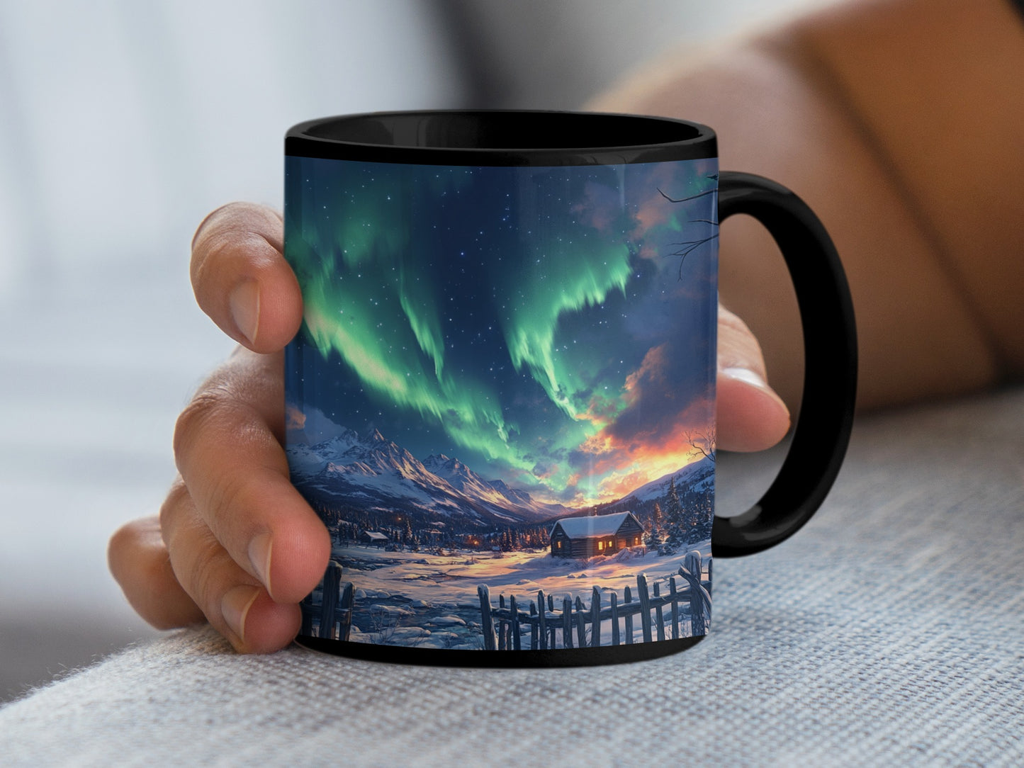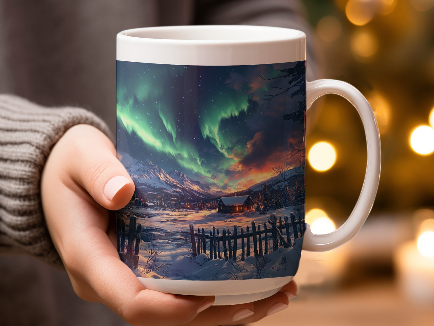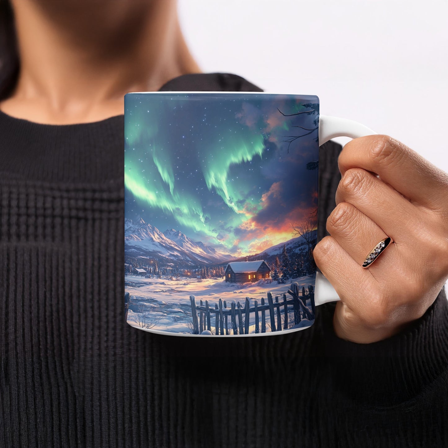Winter Cabin Under Aurora Lights Landscape Image Mug