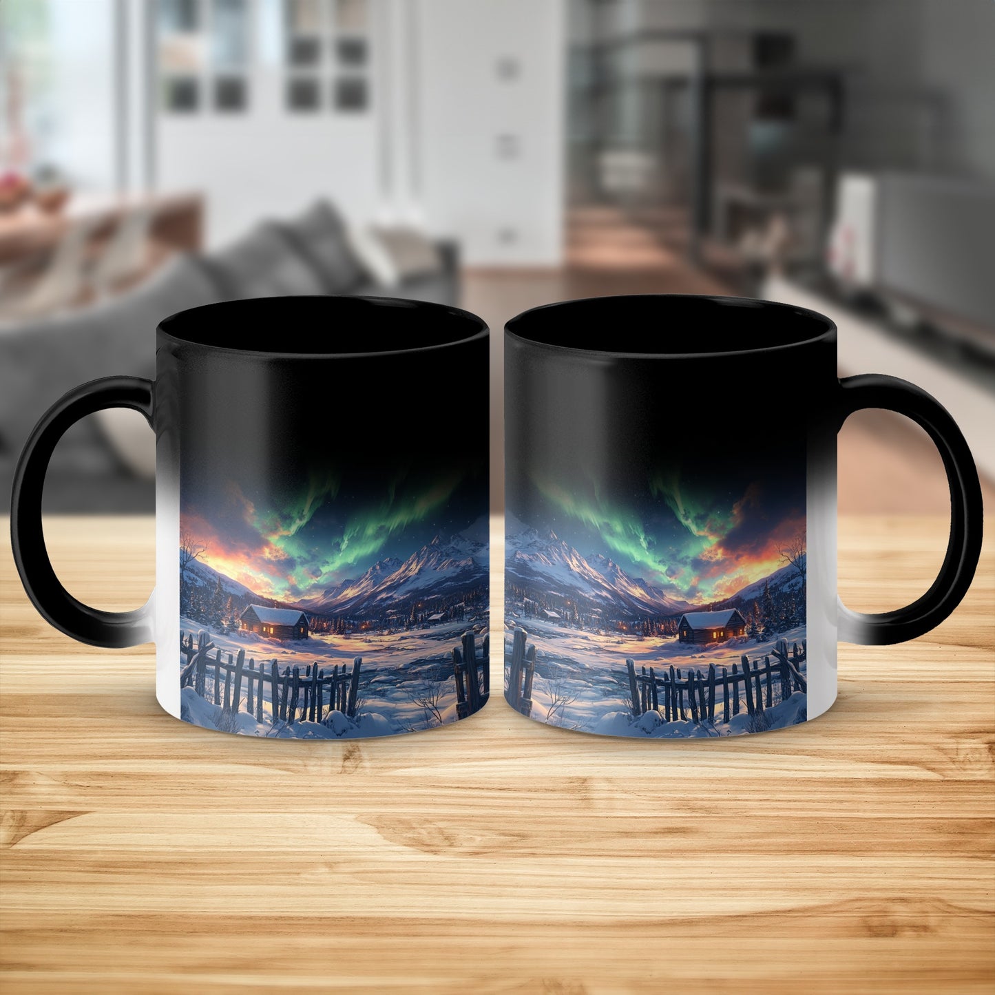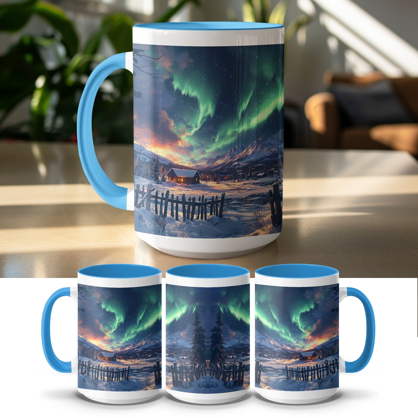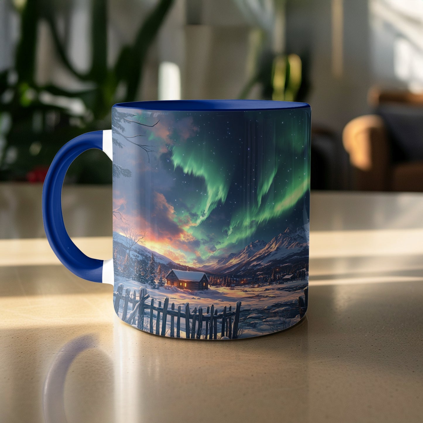 Winter Cabin Under Aurora Lights Landscape Image Mug
