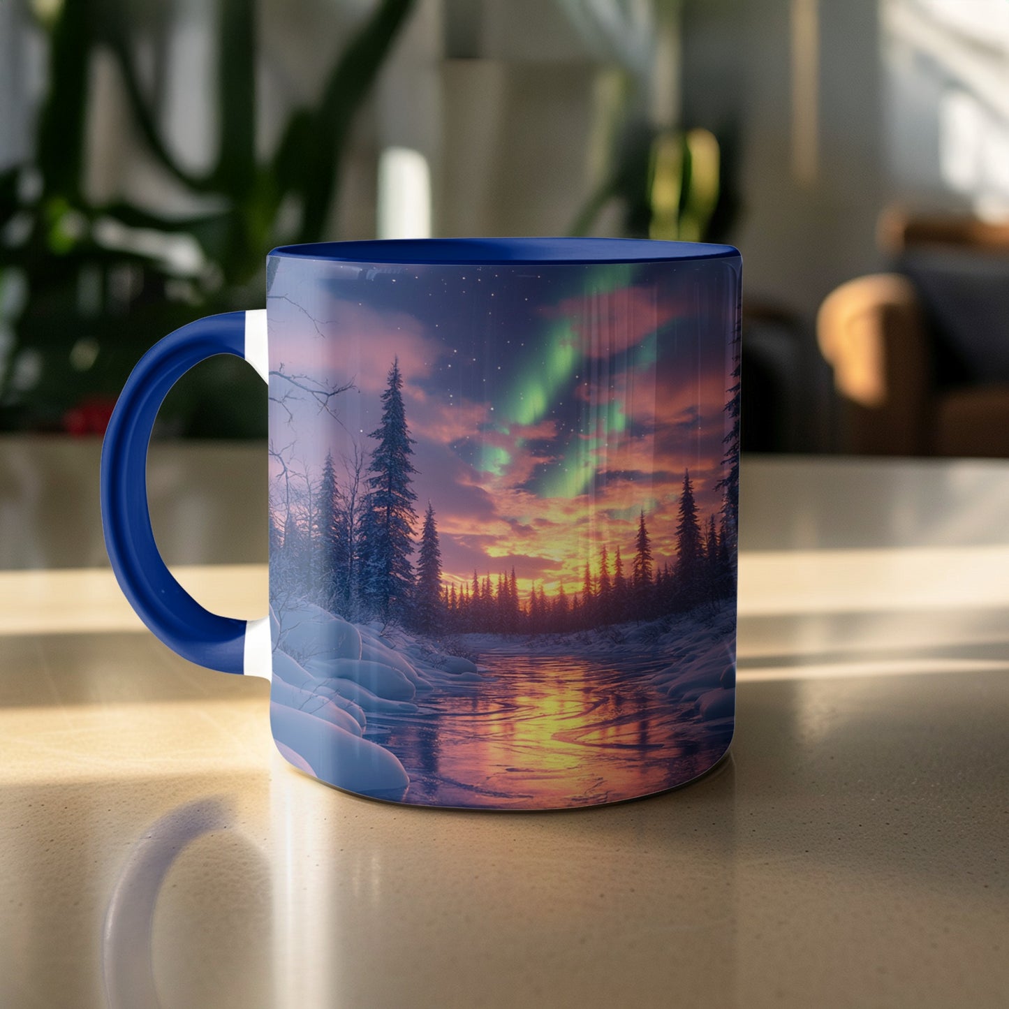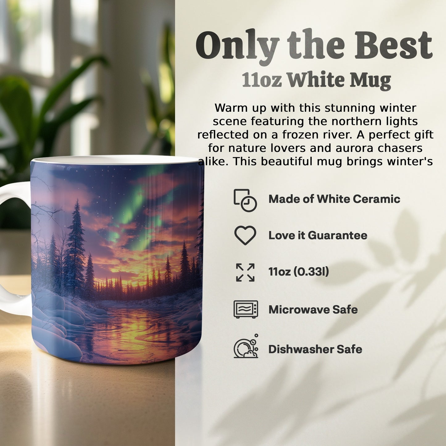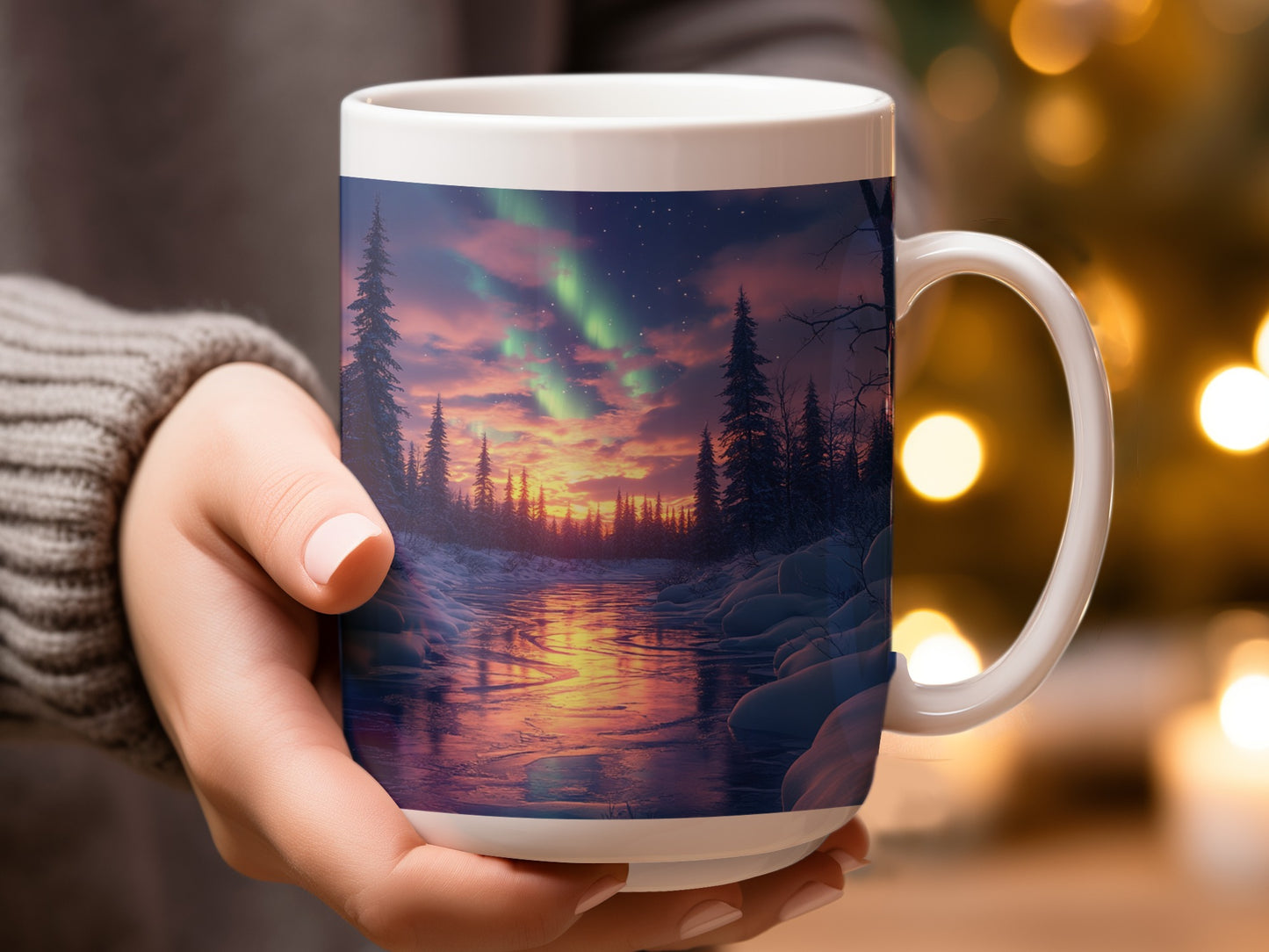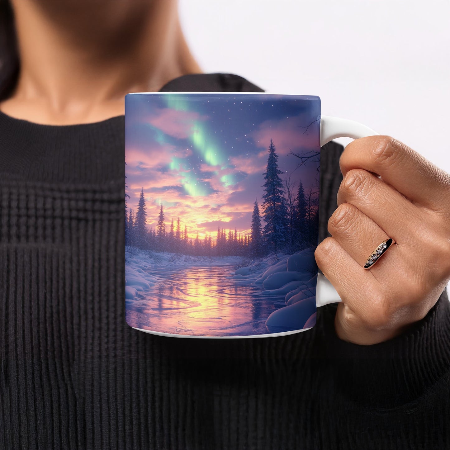 Winter Aurora Borealis Sky Stars Above River in Forest Mug