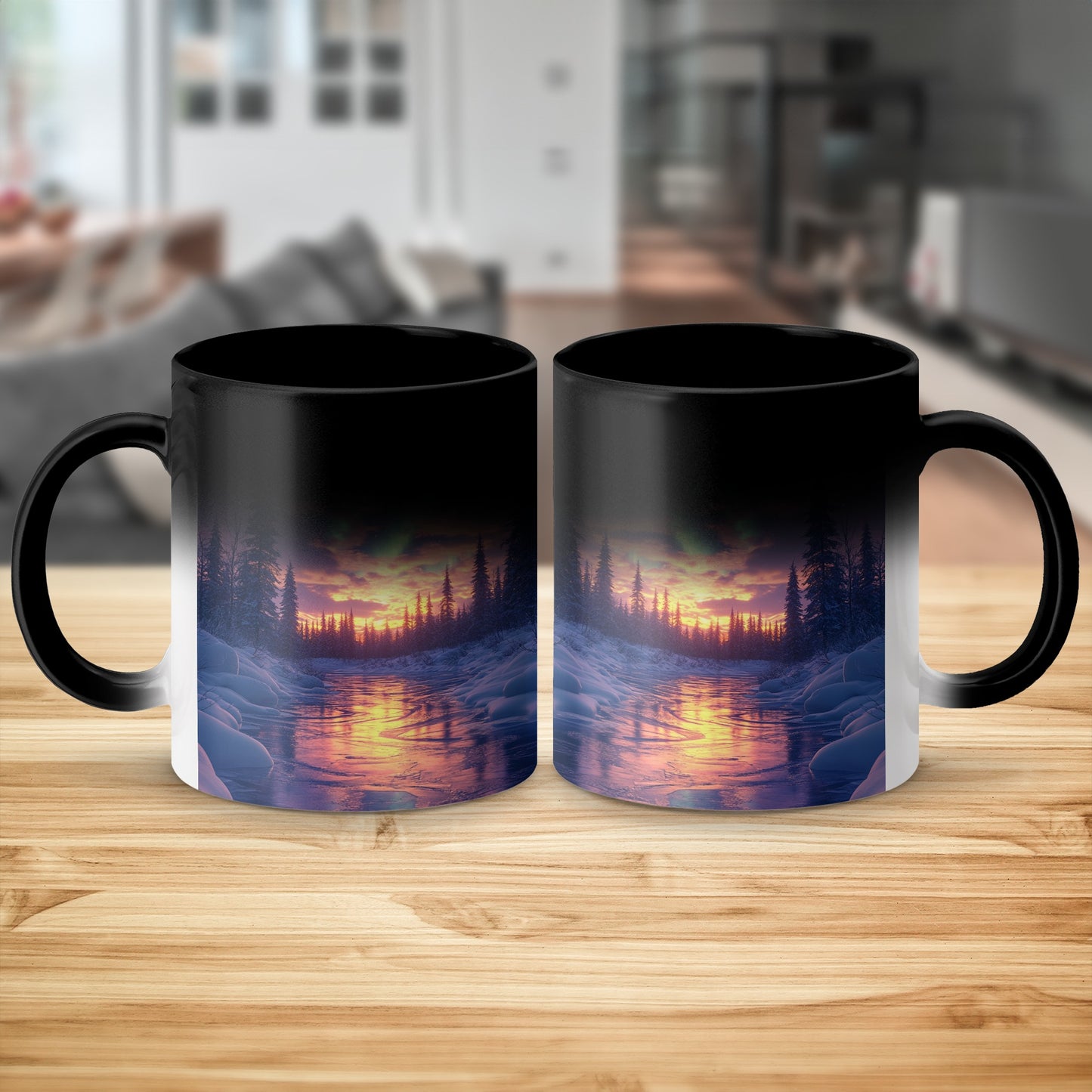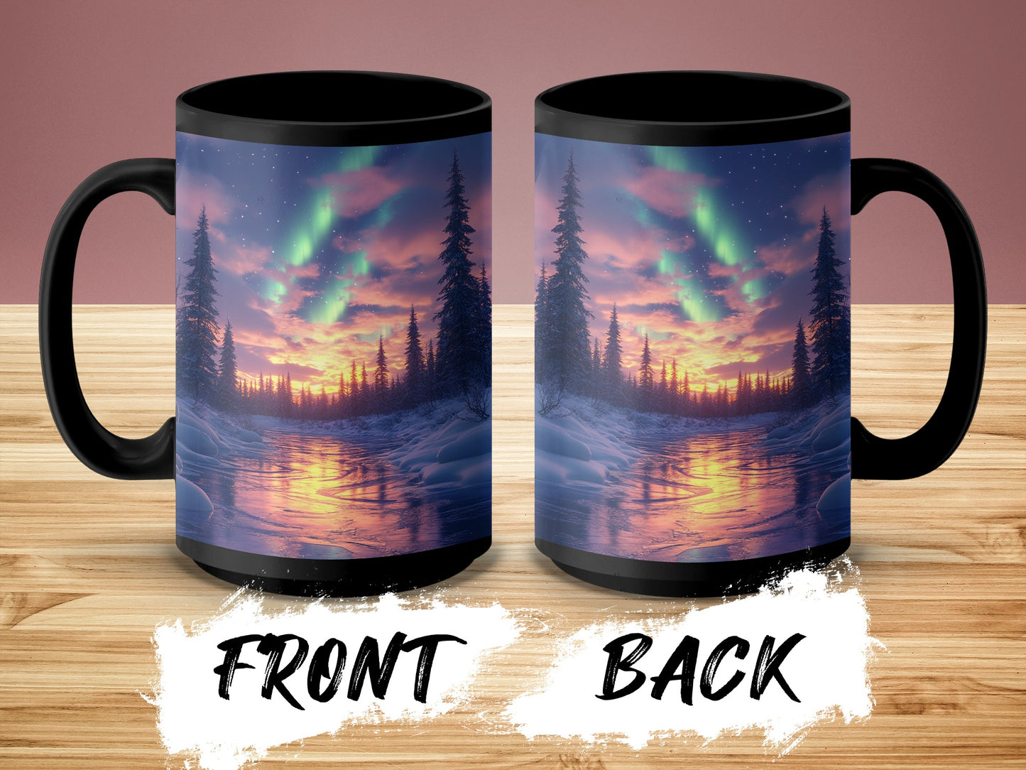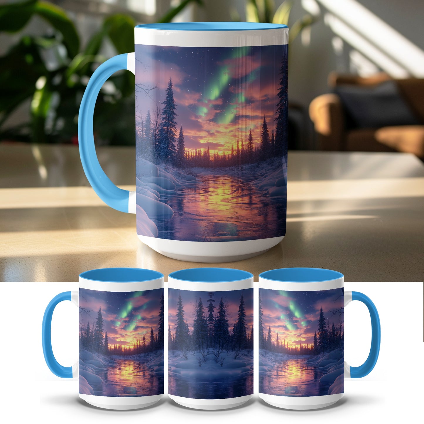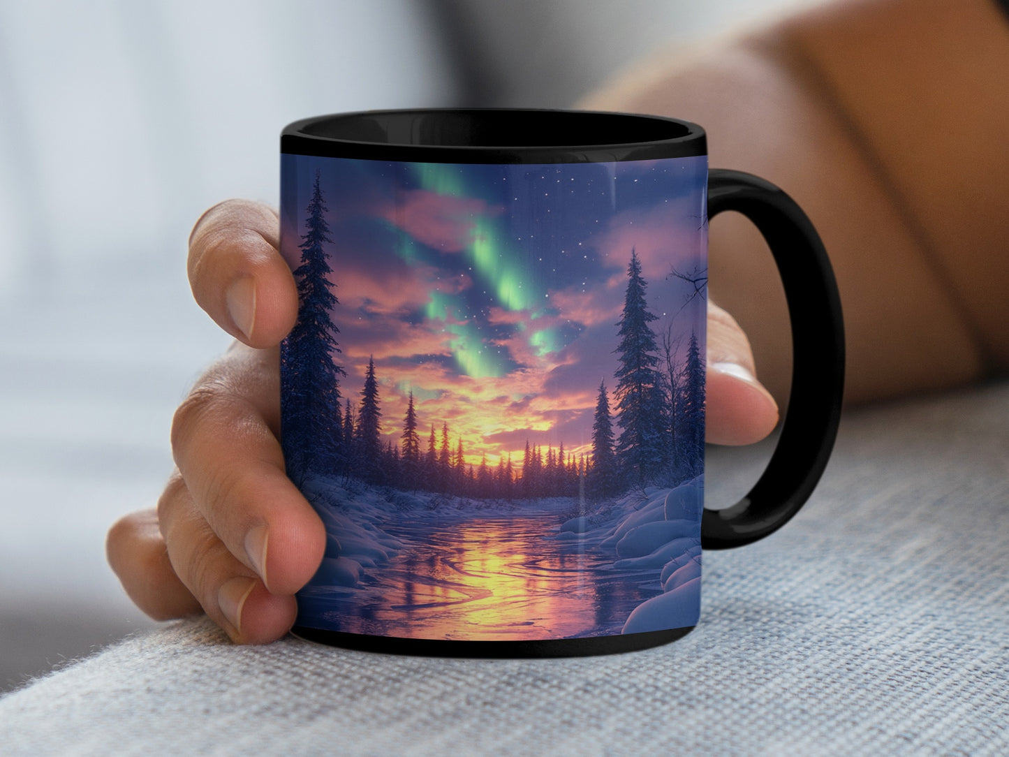 Winter Aurora Borealis Sky Stars Above River in Forest Mug
