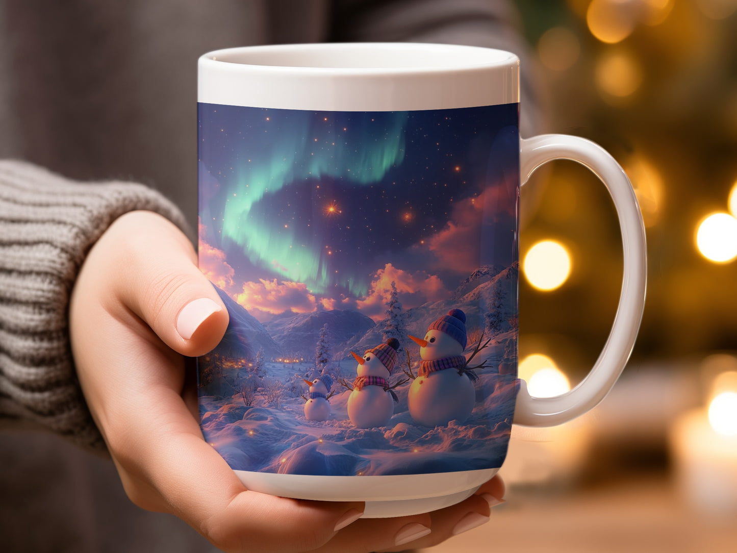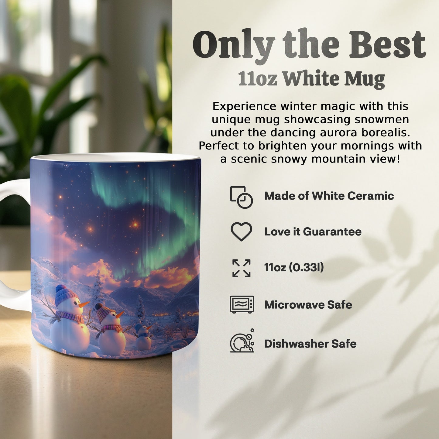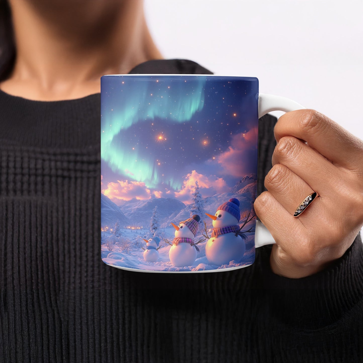 Winter Wonderland Snowmen Under Aurora Borealis Design Mug