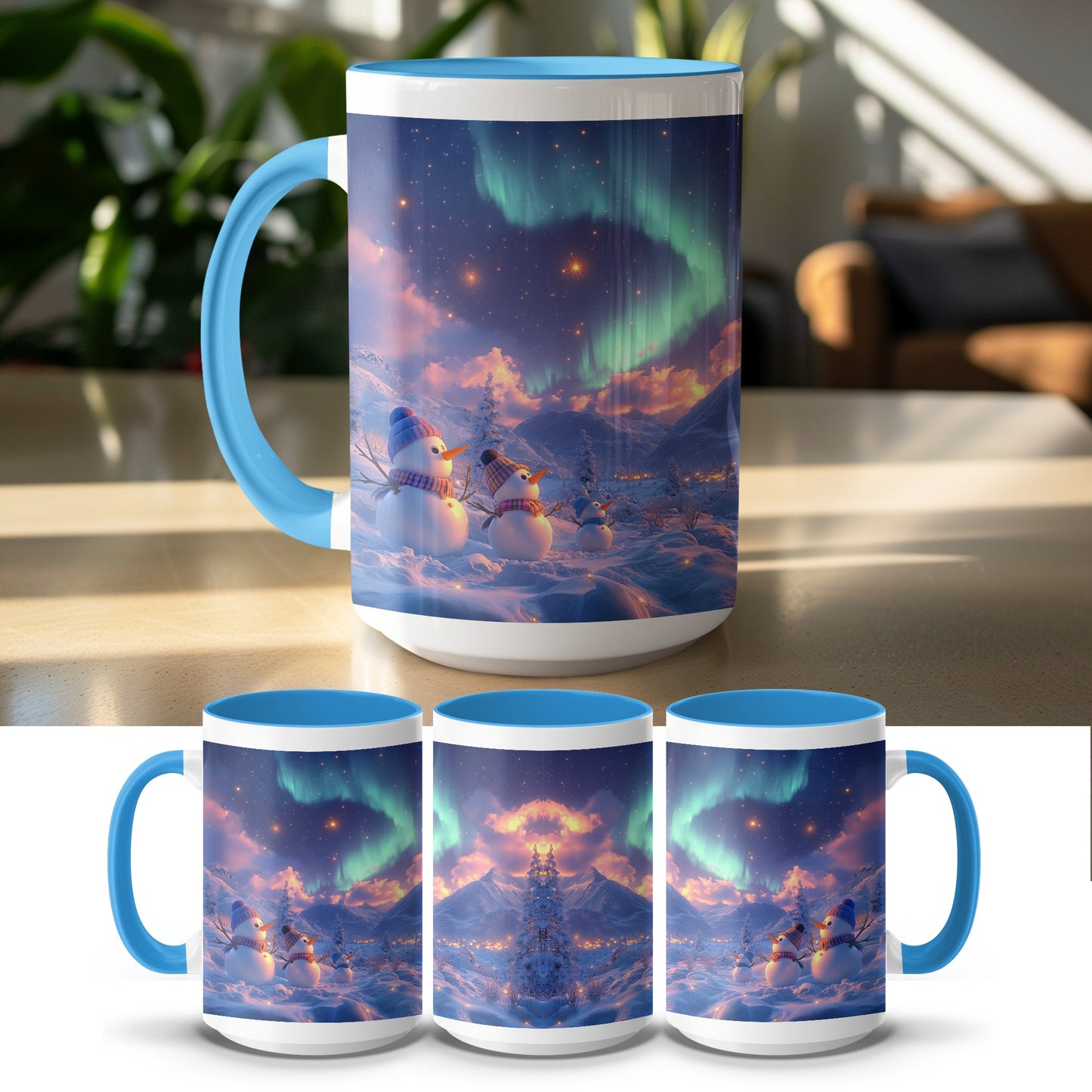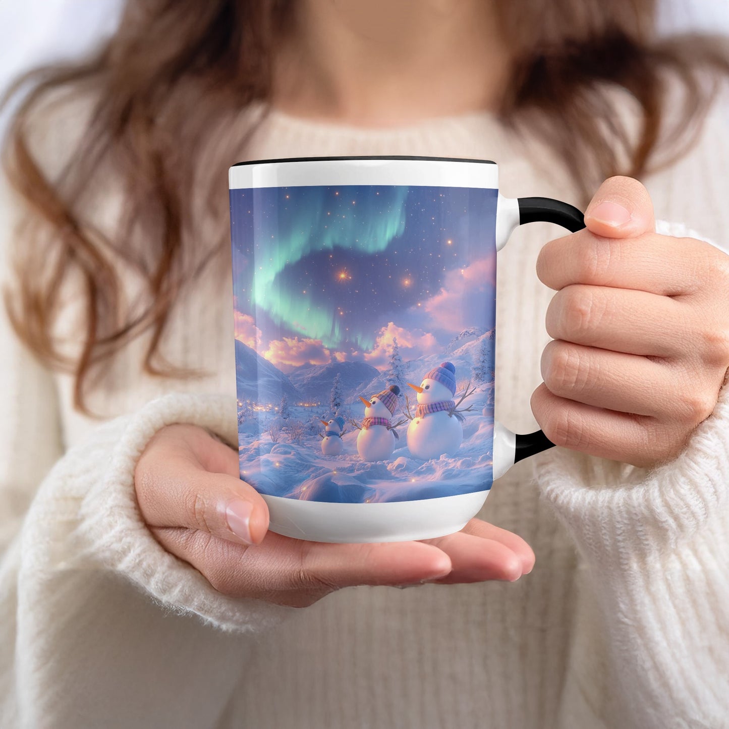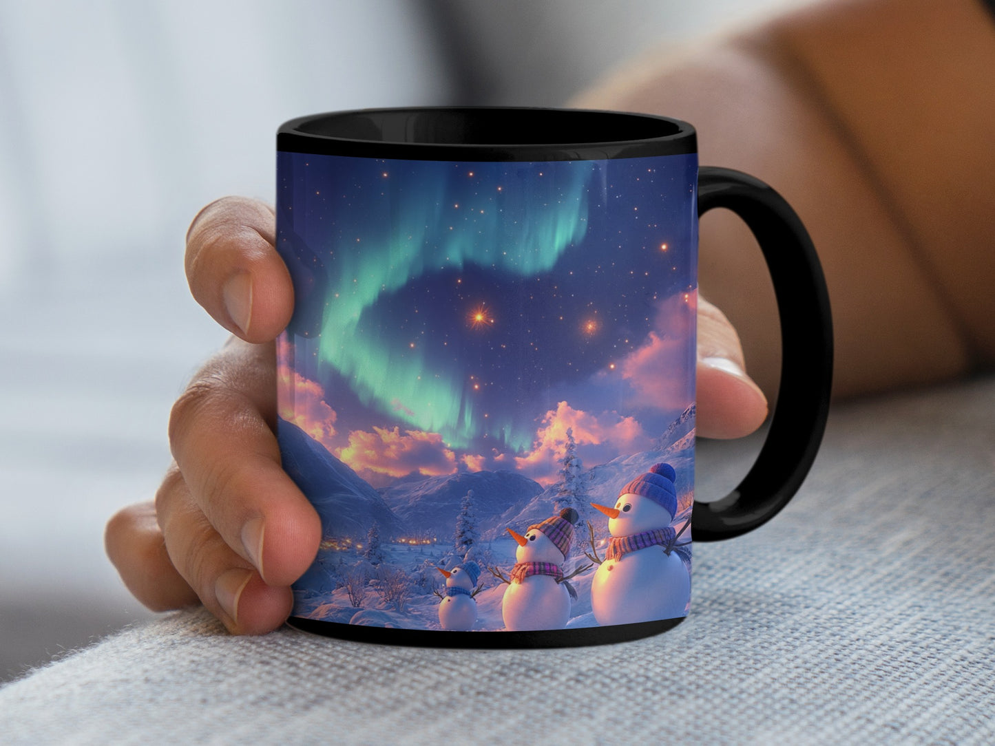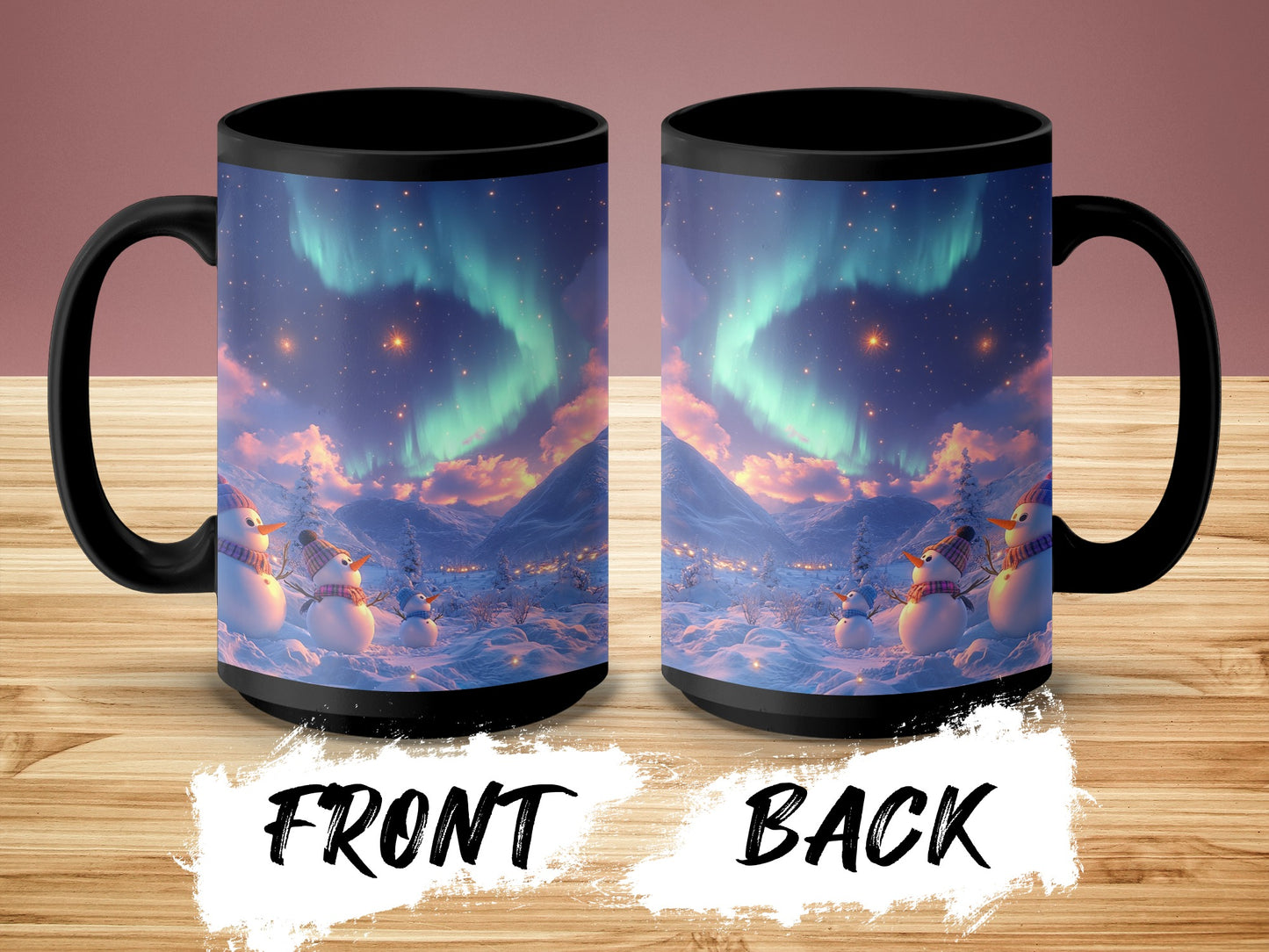 Winter Wonderland Snowmen Under Aurora Borealis Design Mug