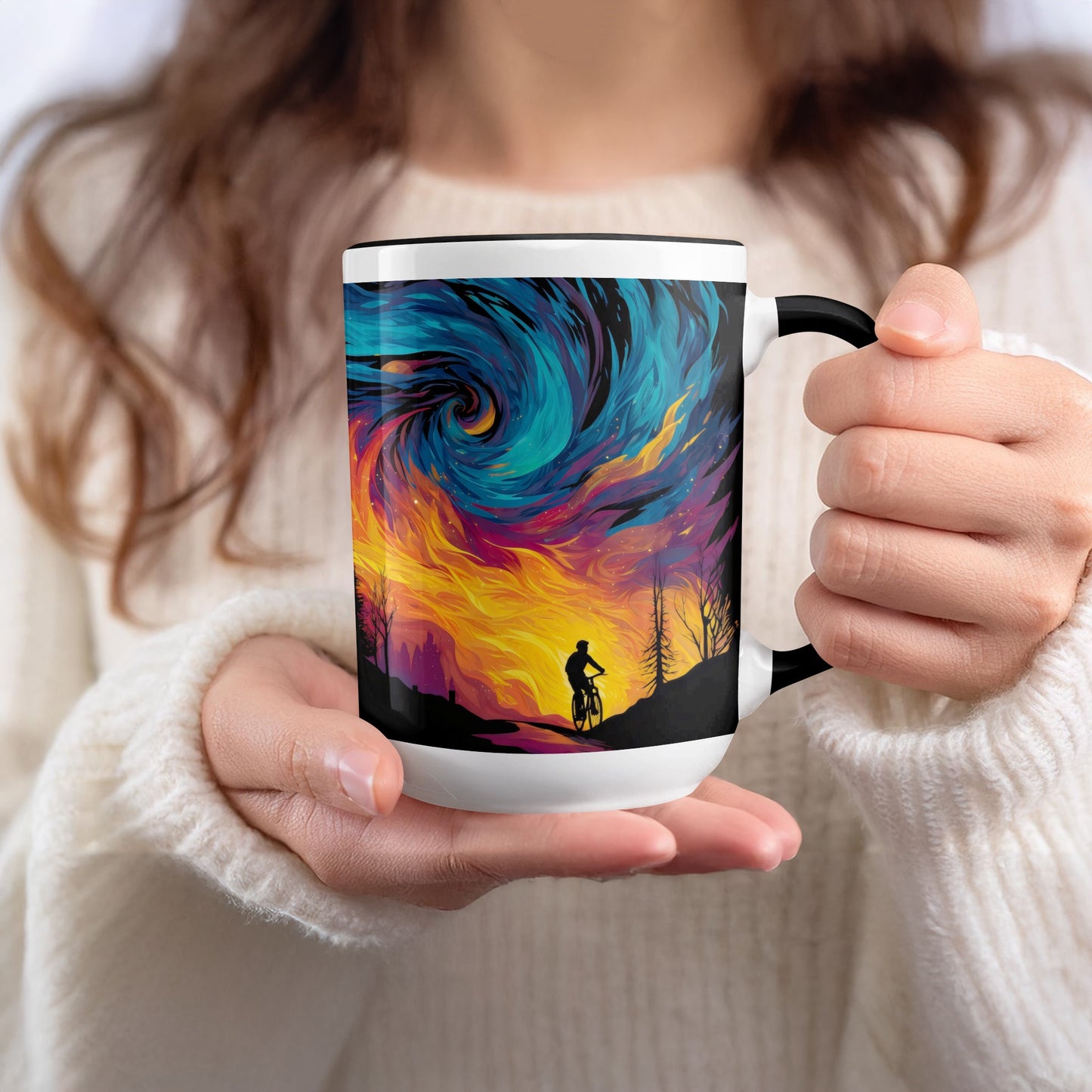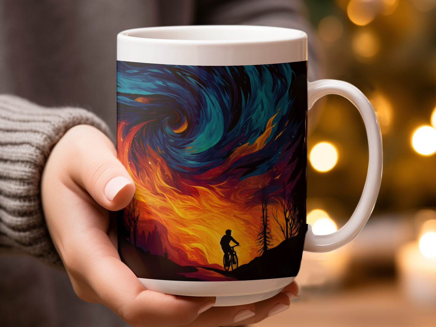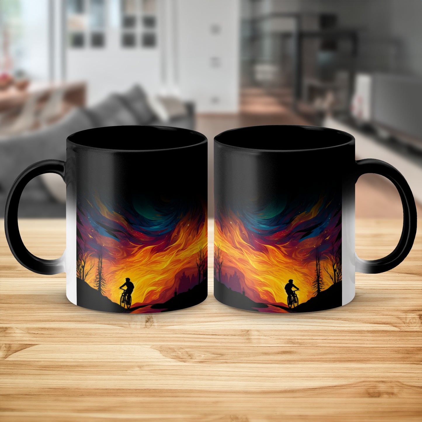 Biker Silhouette Against Fire and Sky Art Design Mug