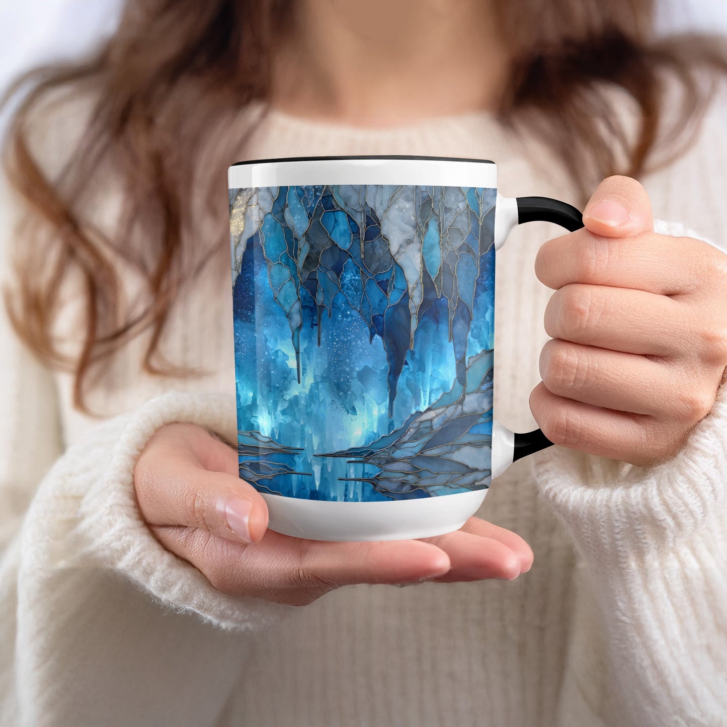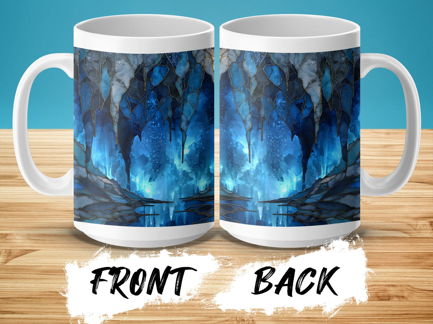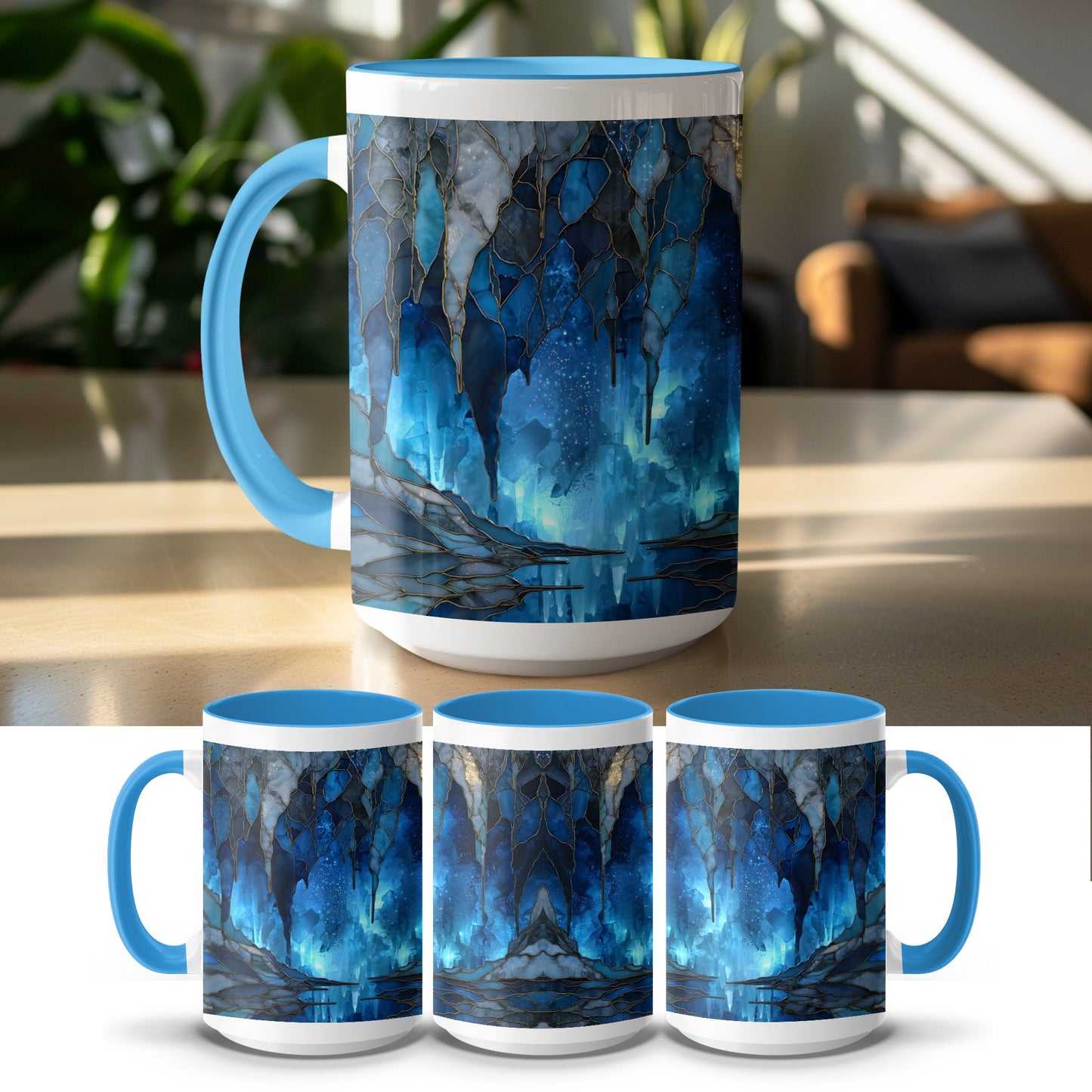 Discover this captivating stained glass themed digital design featuring a celestial blue ice cave with galaxy accents. Perfect for art enthusiasts and digital projects alike!
