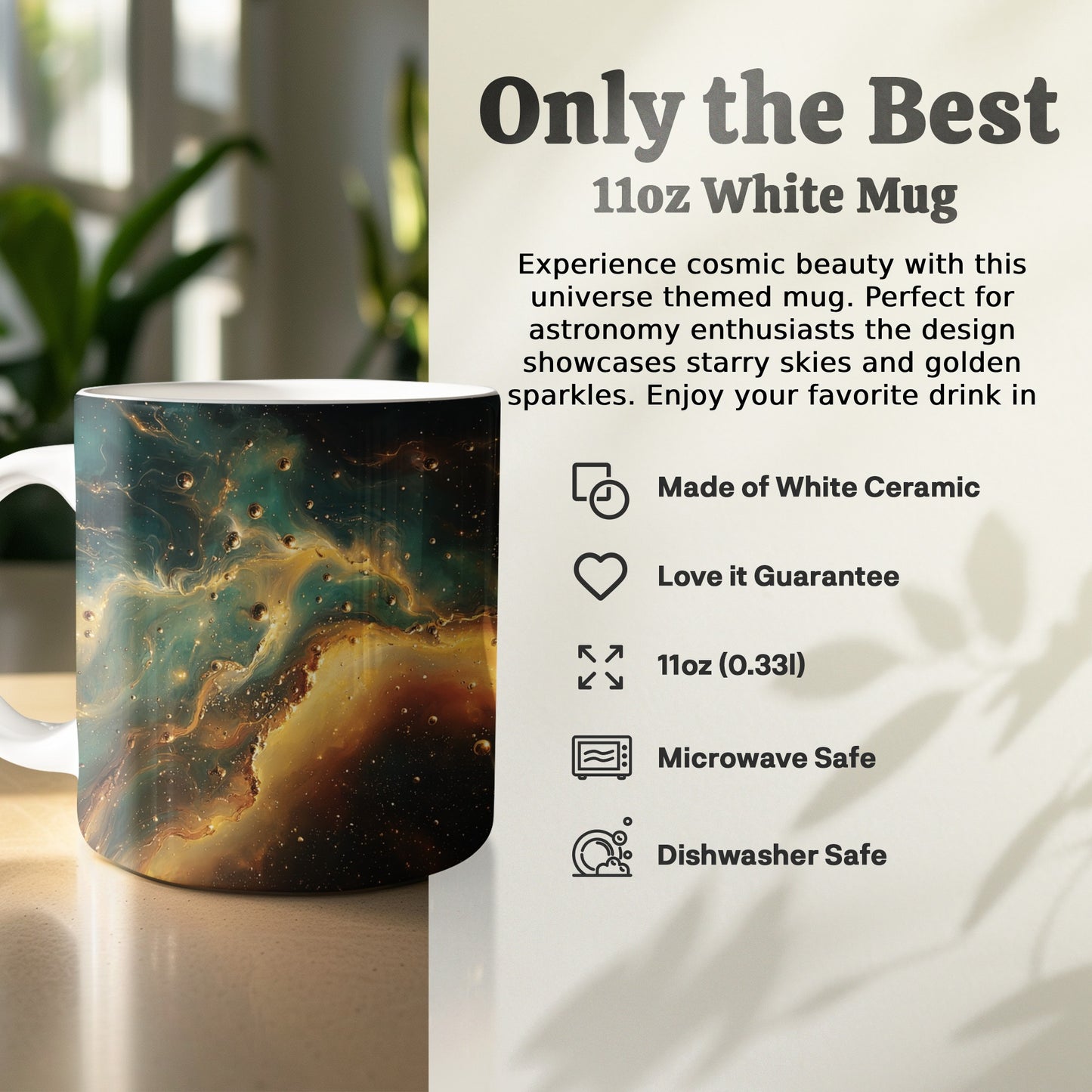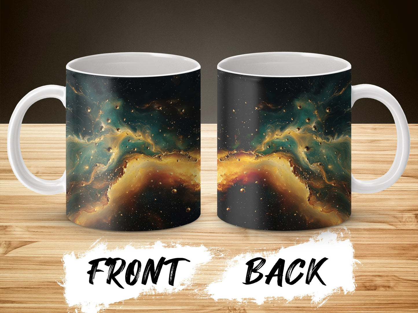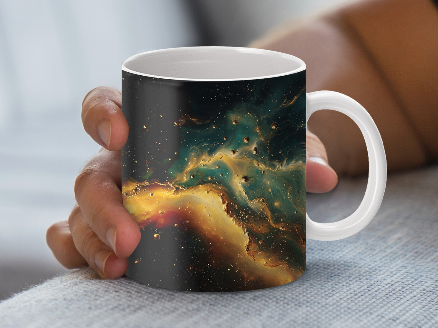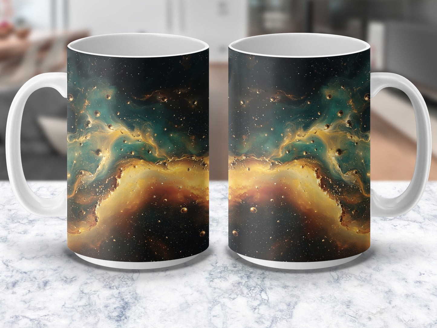 Transform your mug into a mesmerizing work of art with this celestial design. Featuring a stunning combination of golden hues and ethereal blues it's perfect for any space lover.