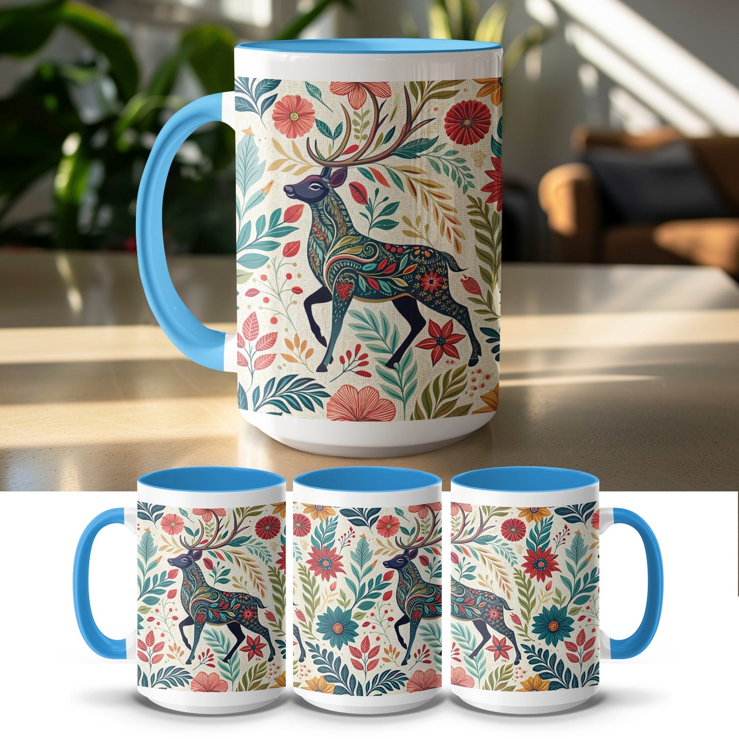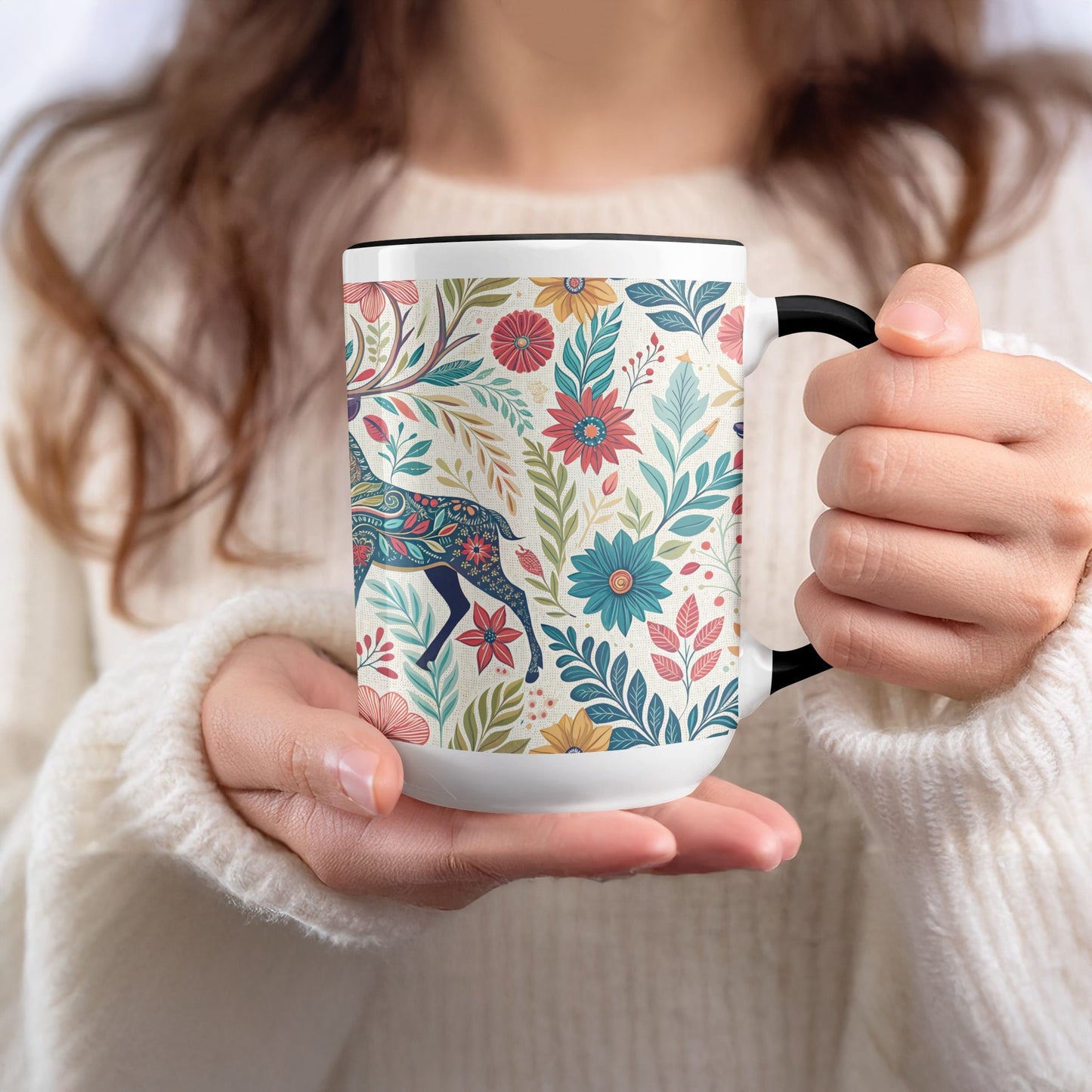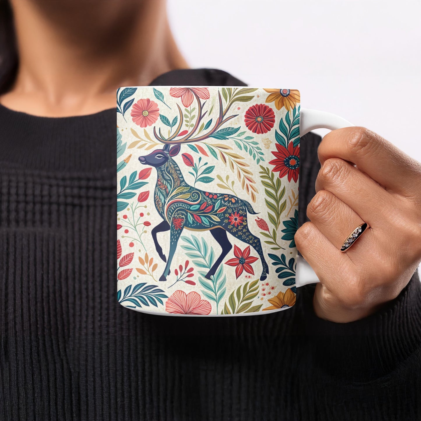 Colorful Deer Floral Design Mexican Otomi Style Mug