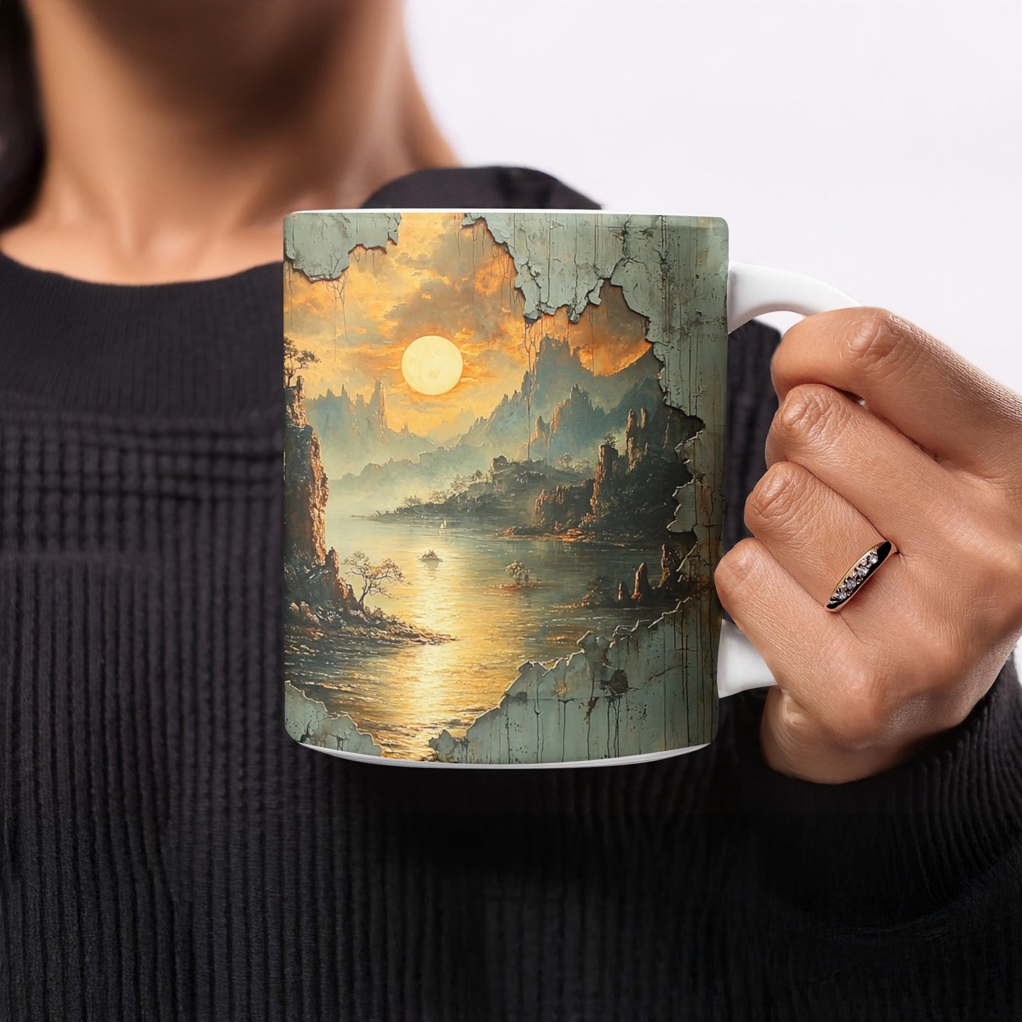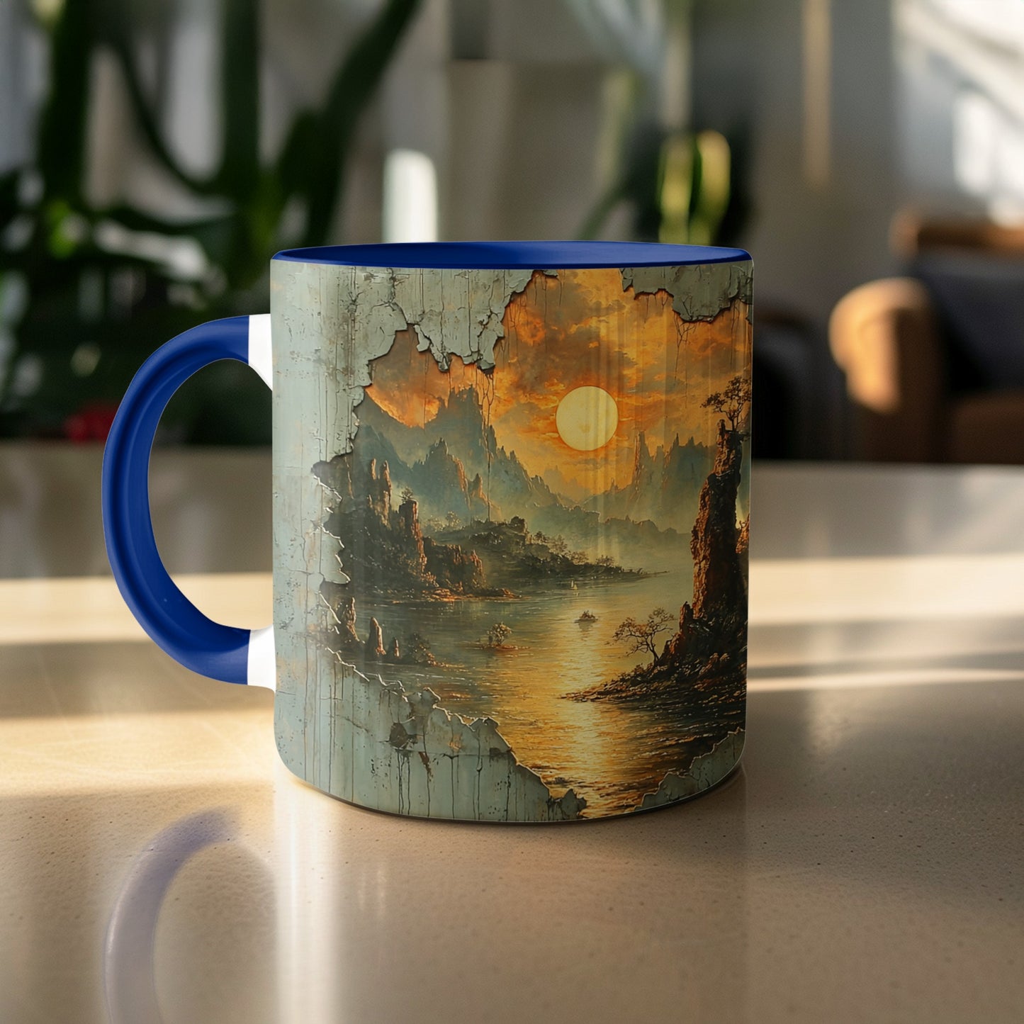 Vintage Landscape Mug: Retro Wall Effect, Mountain View, Serene River