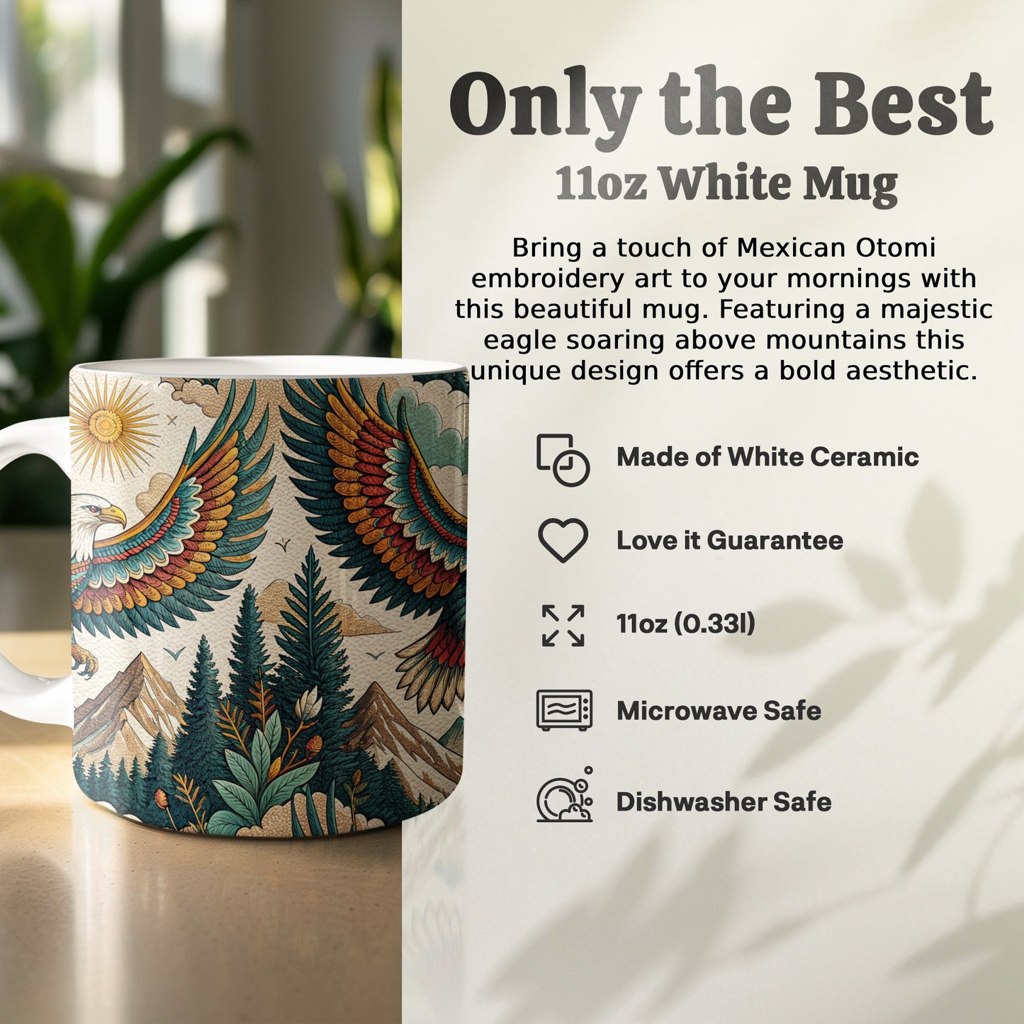 Bring a touch of Mexican Otomi embroidery art to your mornings with this beautiful mug. Featuring a majestic eagle soaring above mountains this unique design offers a bold aesthetic.