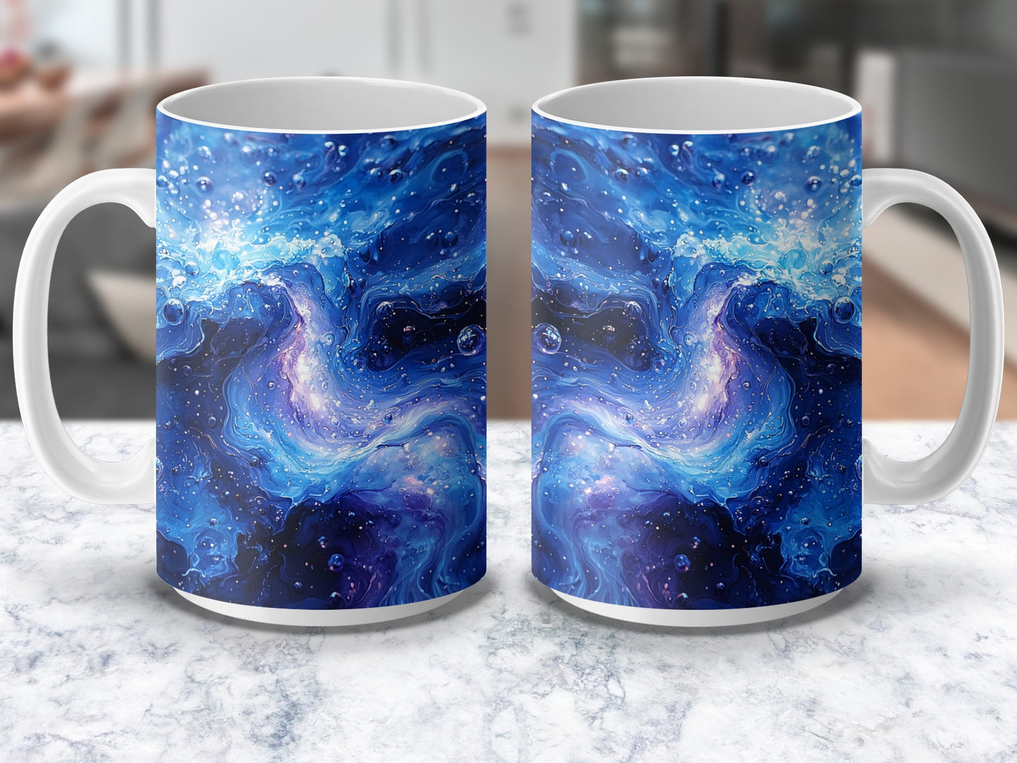 Immerse yourself in the dreamy beauty of a ethereal galaxy design. Featuring cosmic swirls and shimmering blue hues. Perfect to add a touch of magic to your coffee routine.