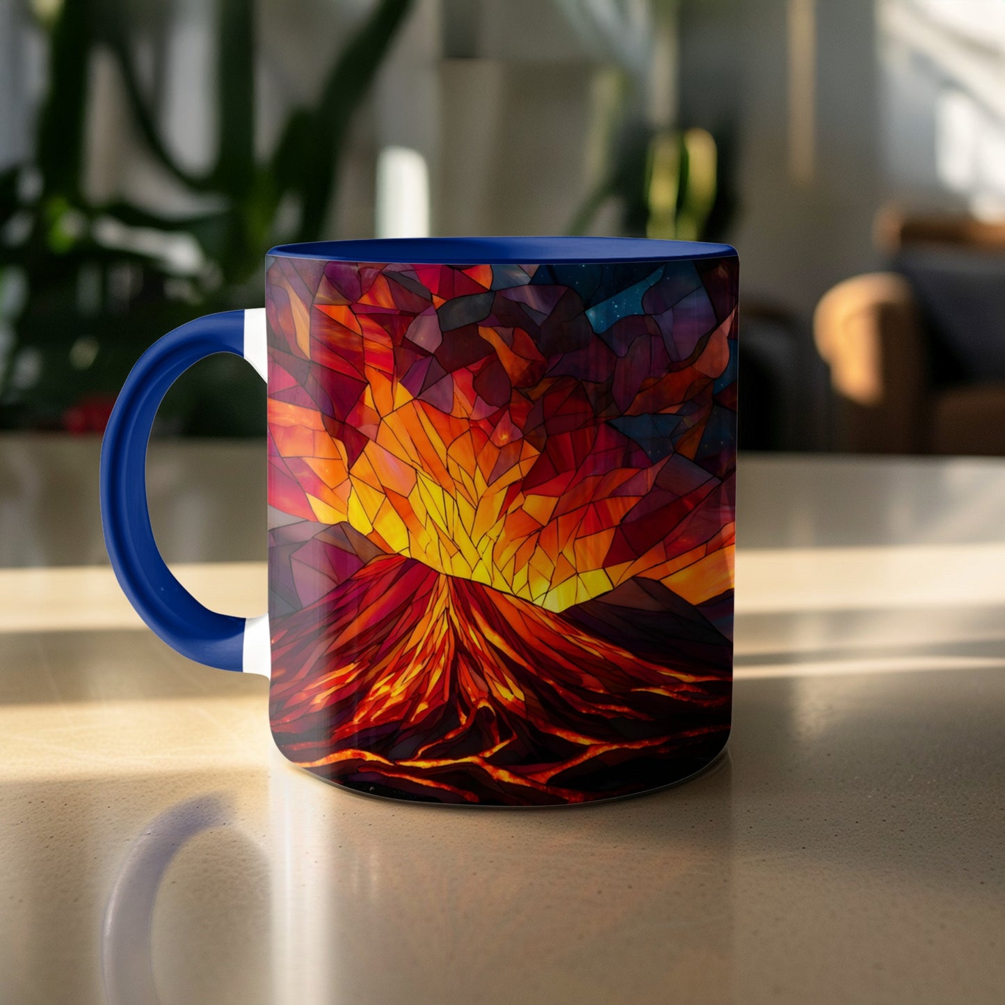 Discover unique digital art featuring fiery mountains in a beautiful stained glass style. Perfect wall decor for modern and traditional homes. Great as a gift. Get creative today!