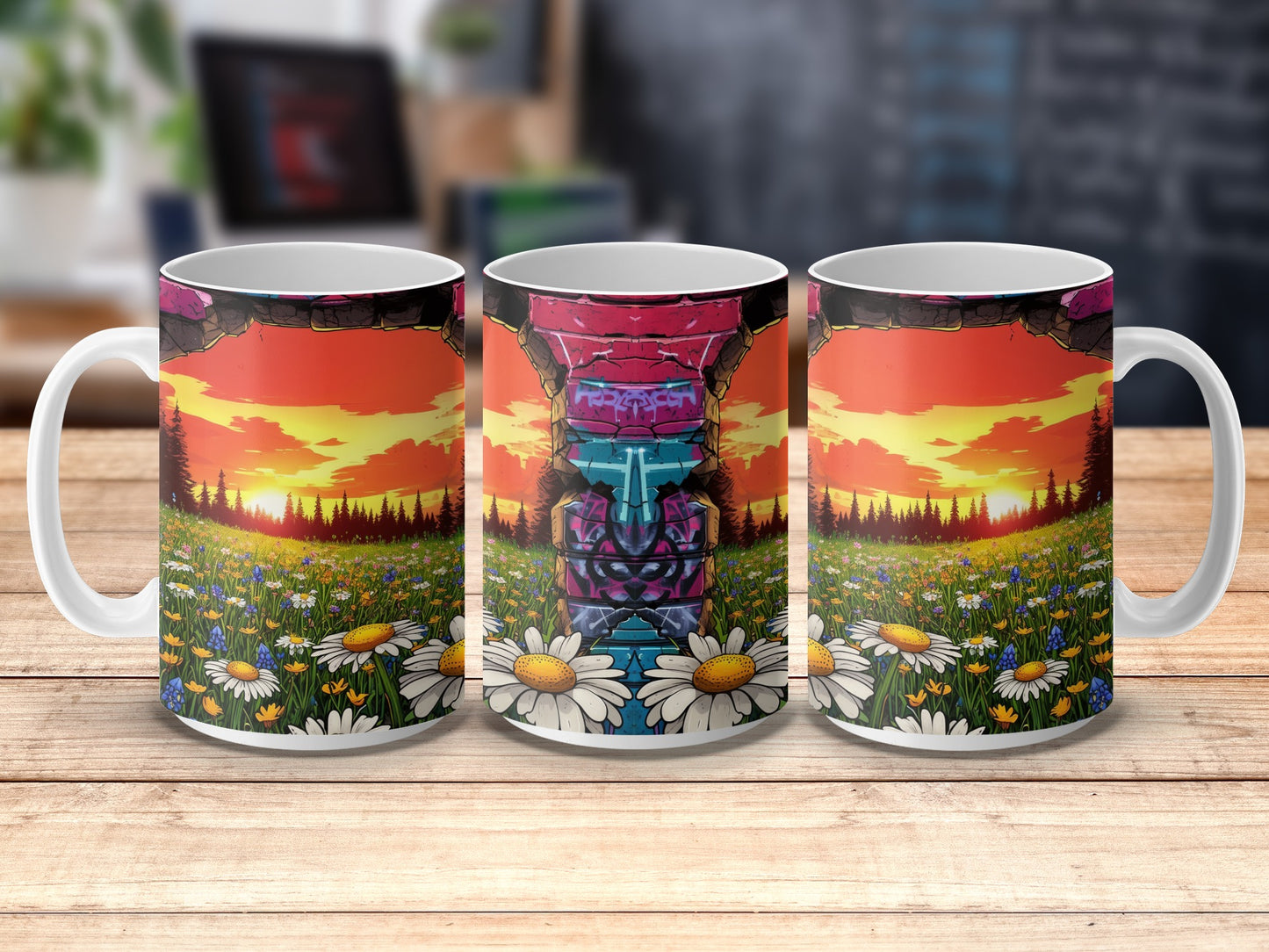 Transform your screen with this captivating digital art. A graffiti-covered archway frames a serene field of wildflowers at sunset creating a unique and beautiful landscape.