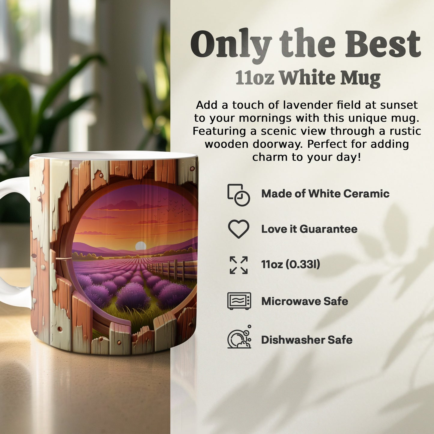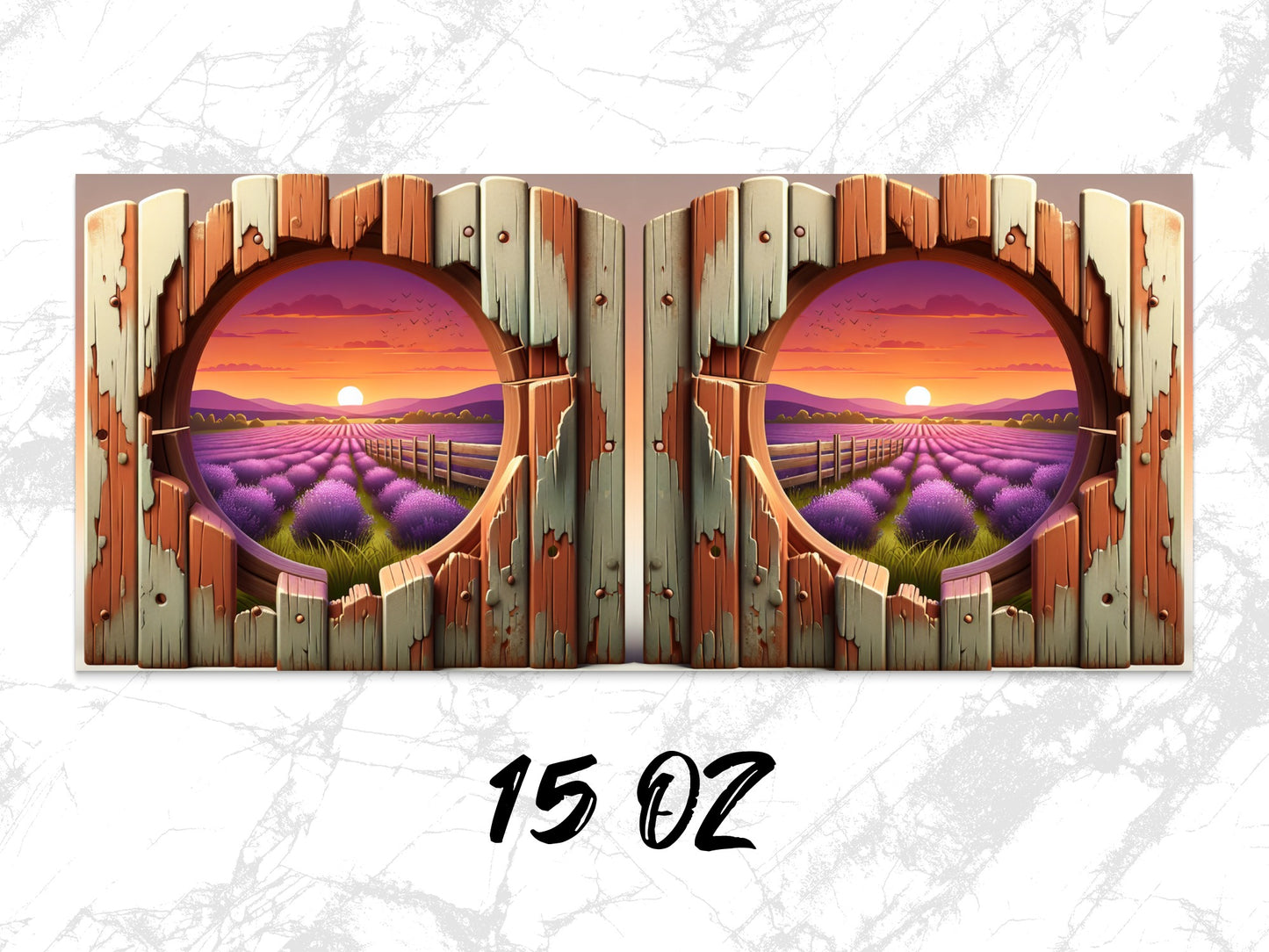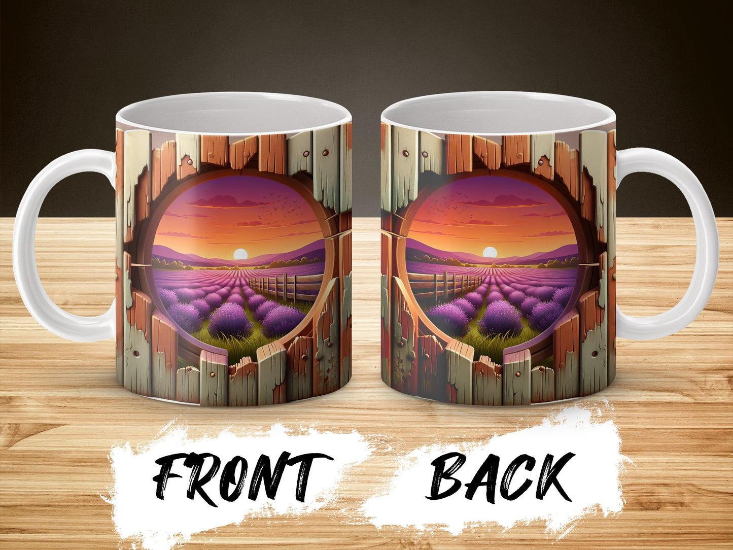 Explore a stunning landscape with lavender fields at sunset framed by rustic wooden gates. This artwork captures the beauty of nature in a digital format available for download.