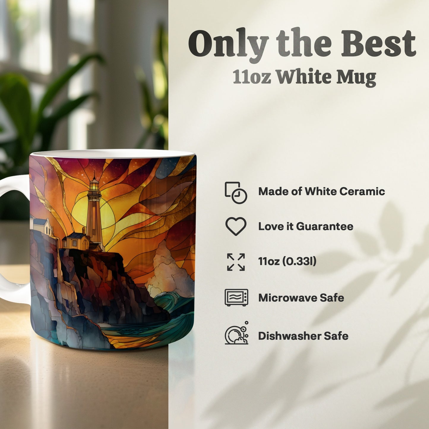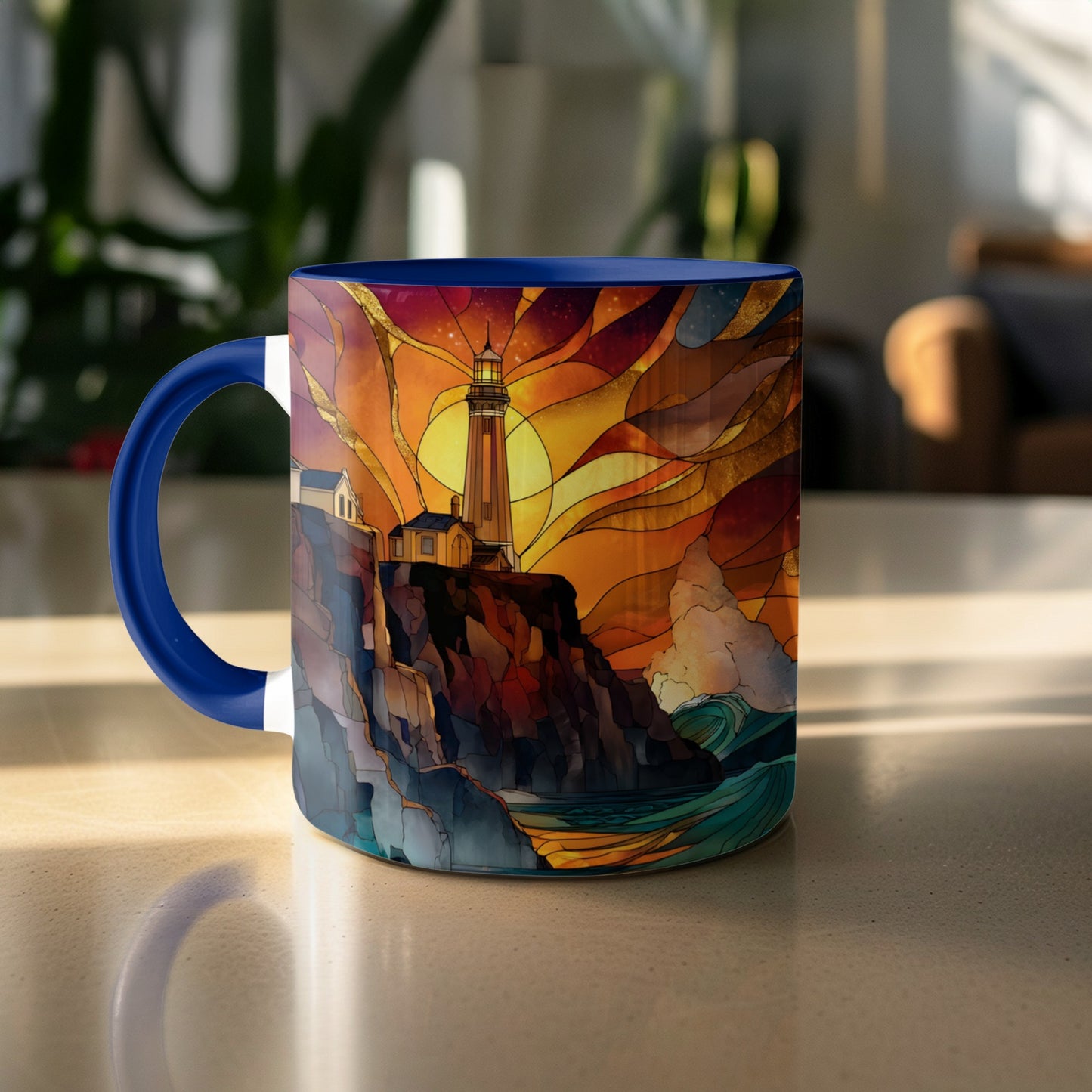 Discover stunning stained glass art with this lighthouse image. The vivid colors and unique design will captivate. Download this digital product today!