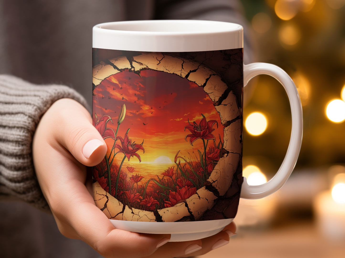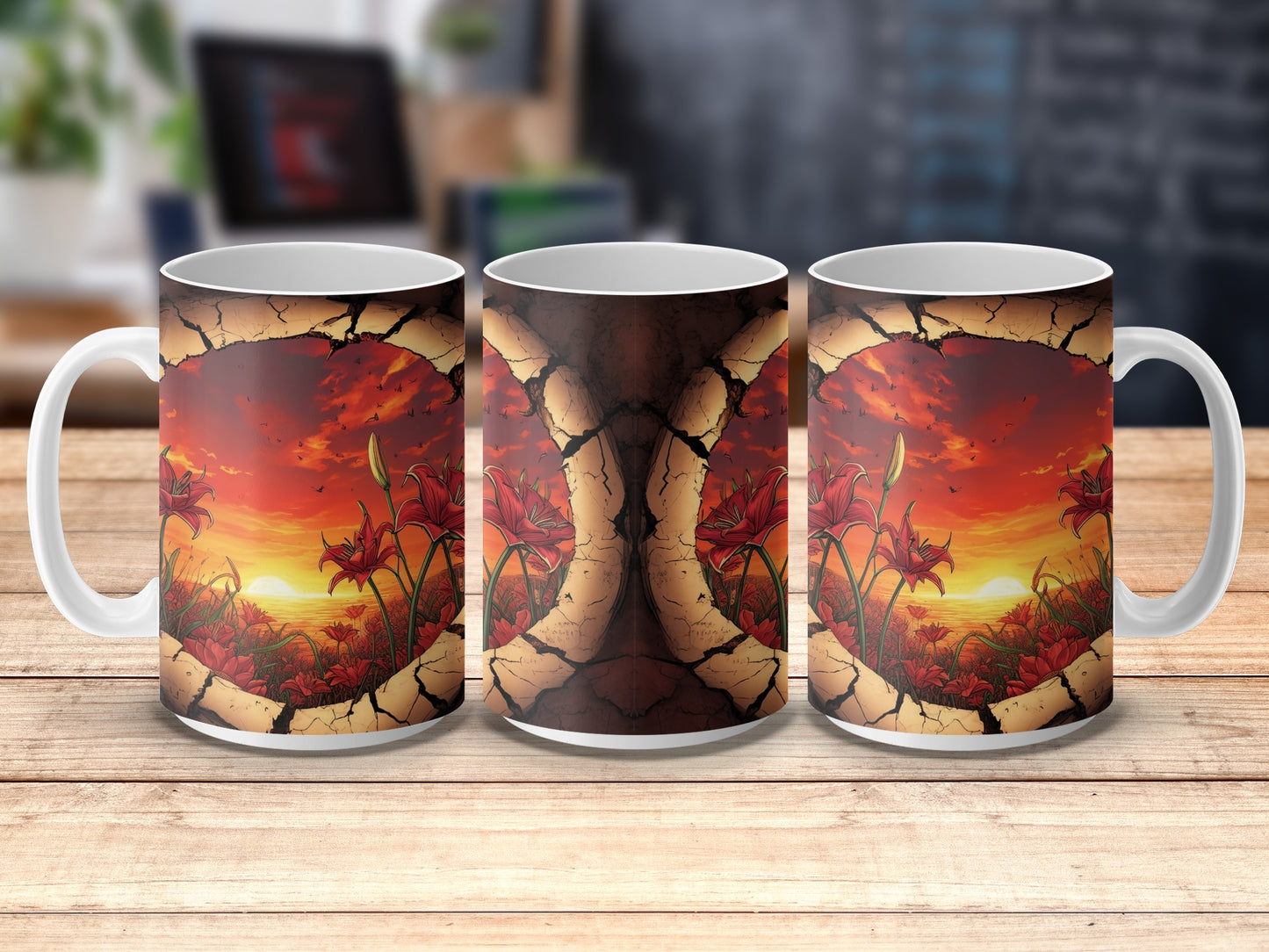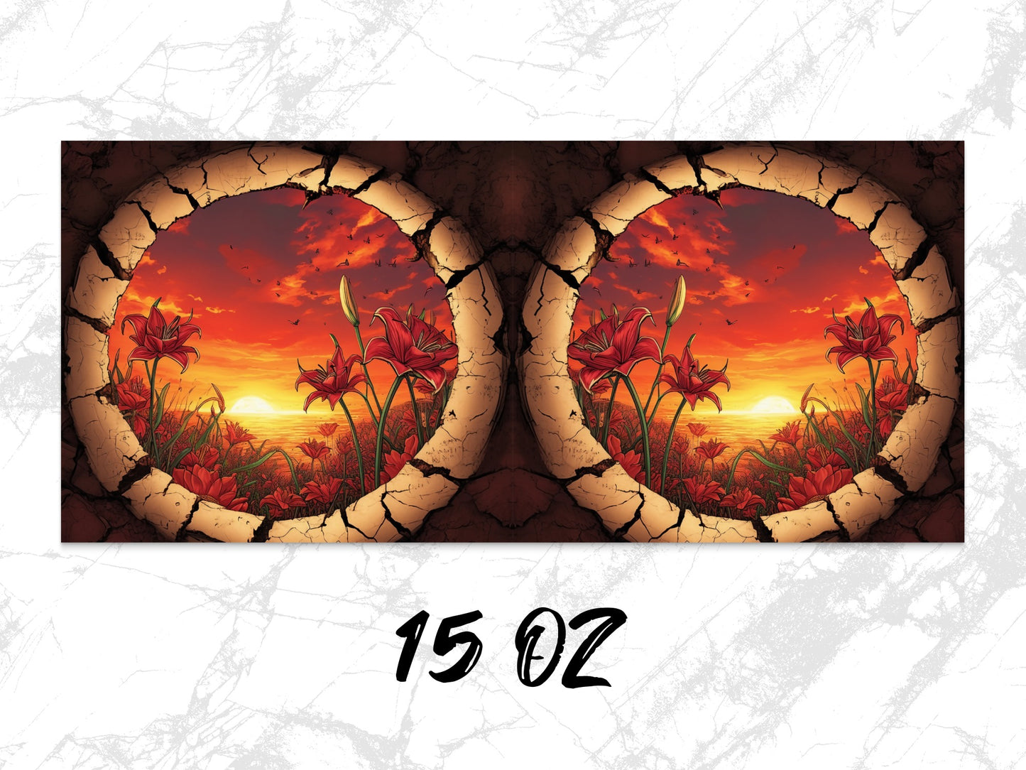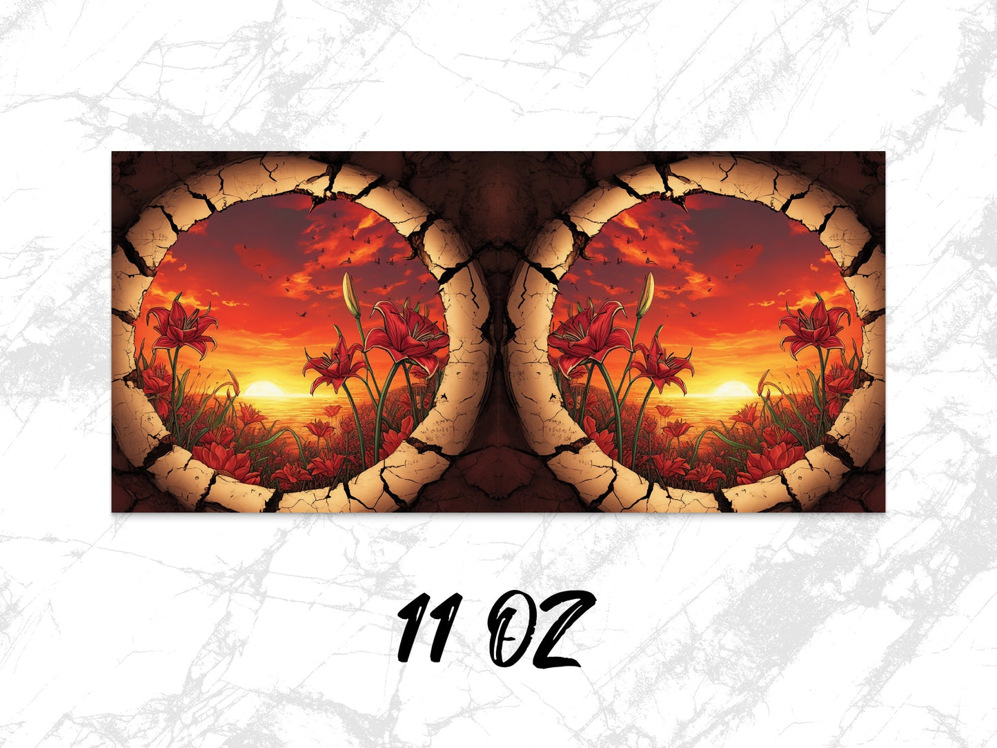 Explore stunning visual art of lily flowers with a vibrant sunset sky inside cracked walls. Elevate your creative projects with this unique and beautiful digital artwork.