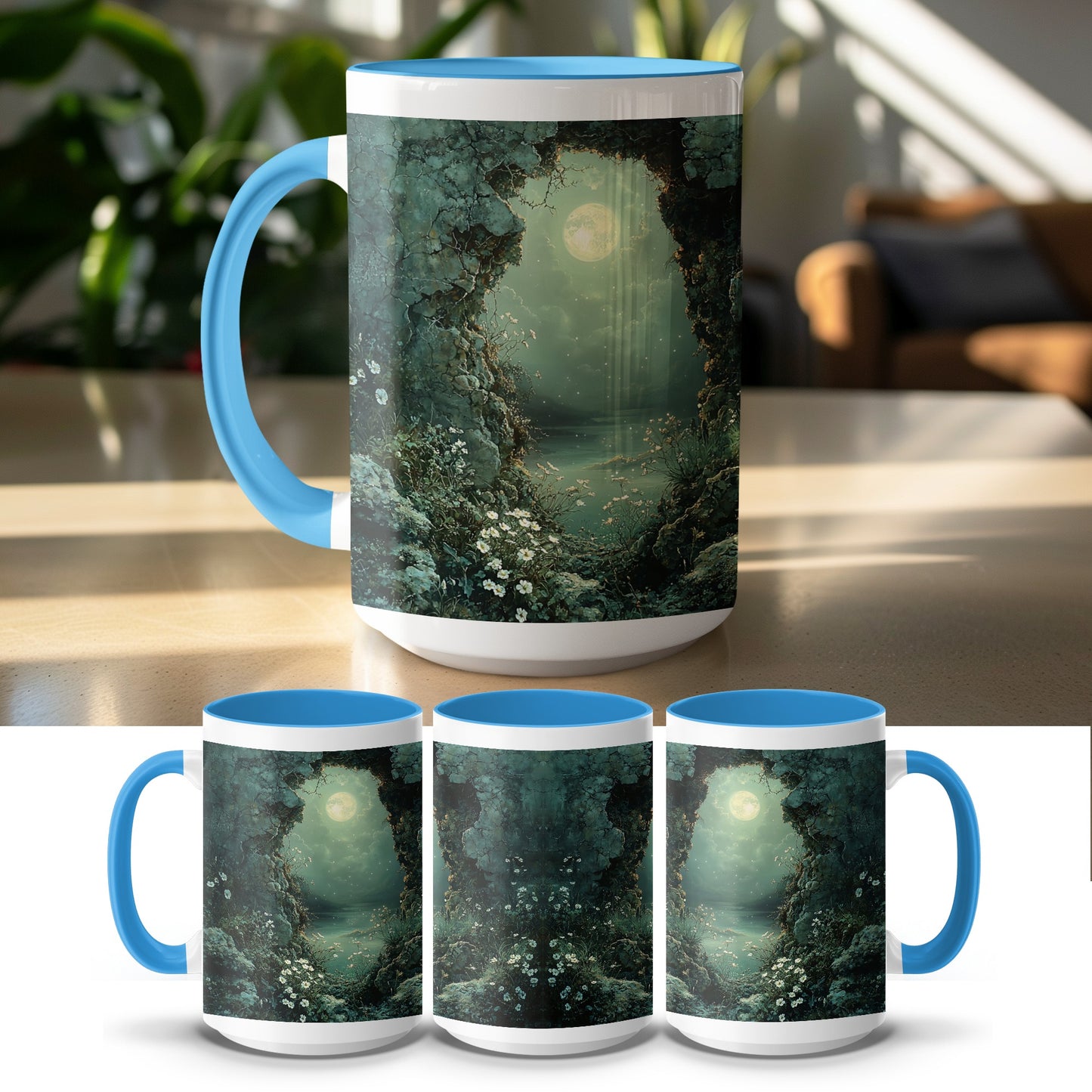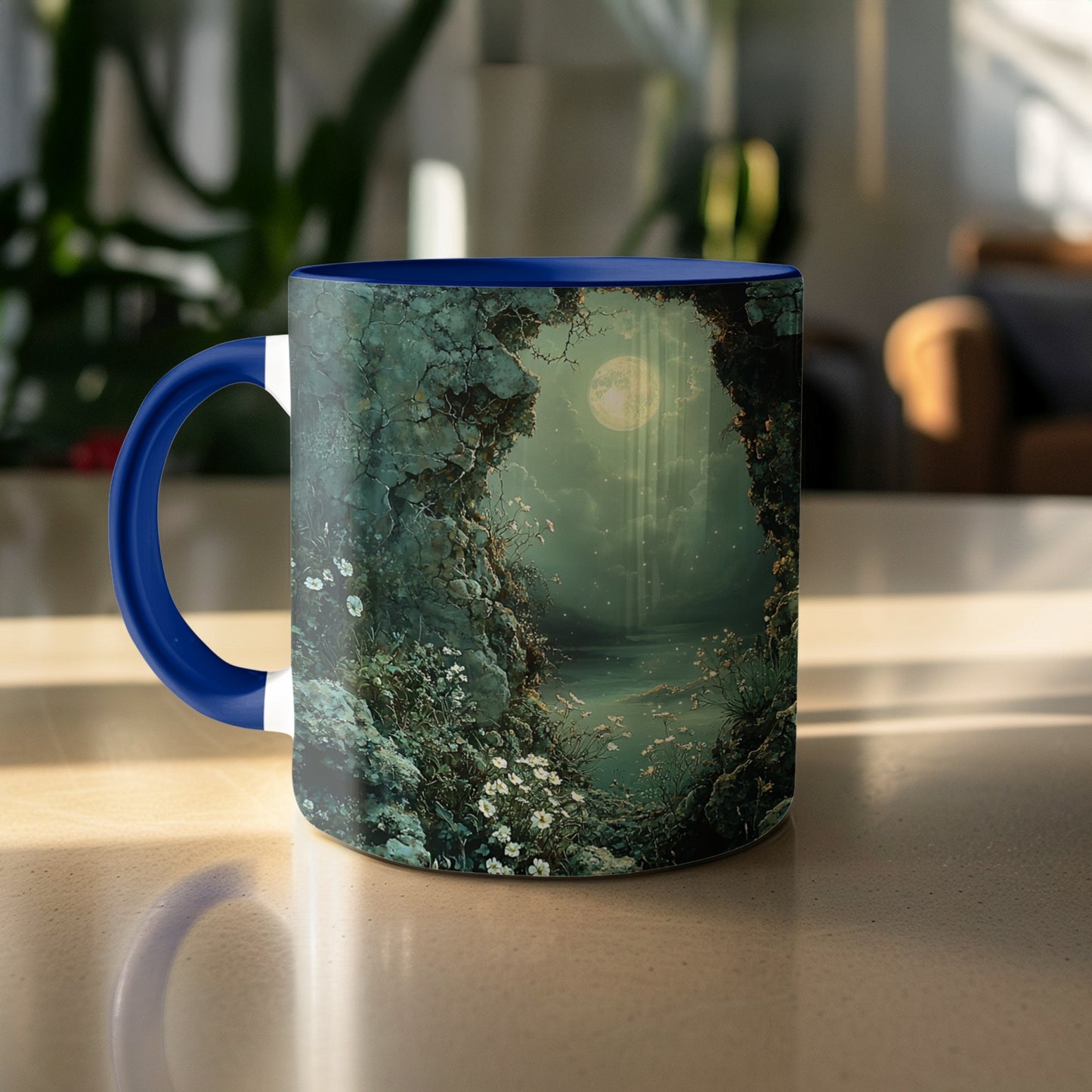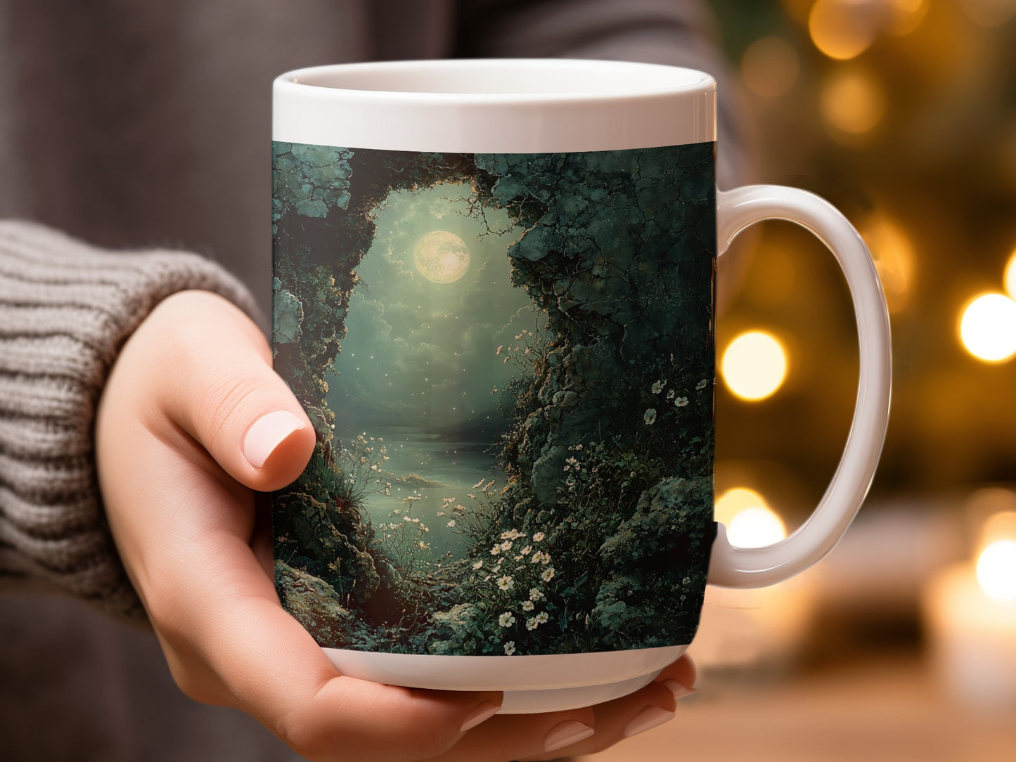 Fantasy Mug: Full Moon, Cliffside Flowers, Atmospheric Design