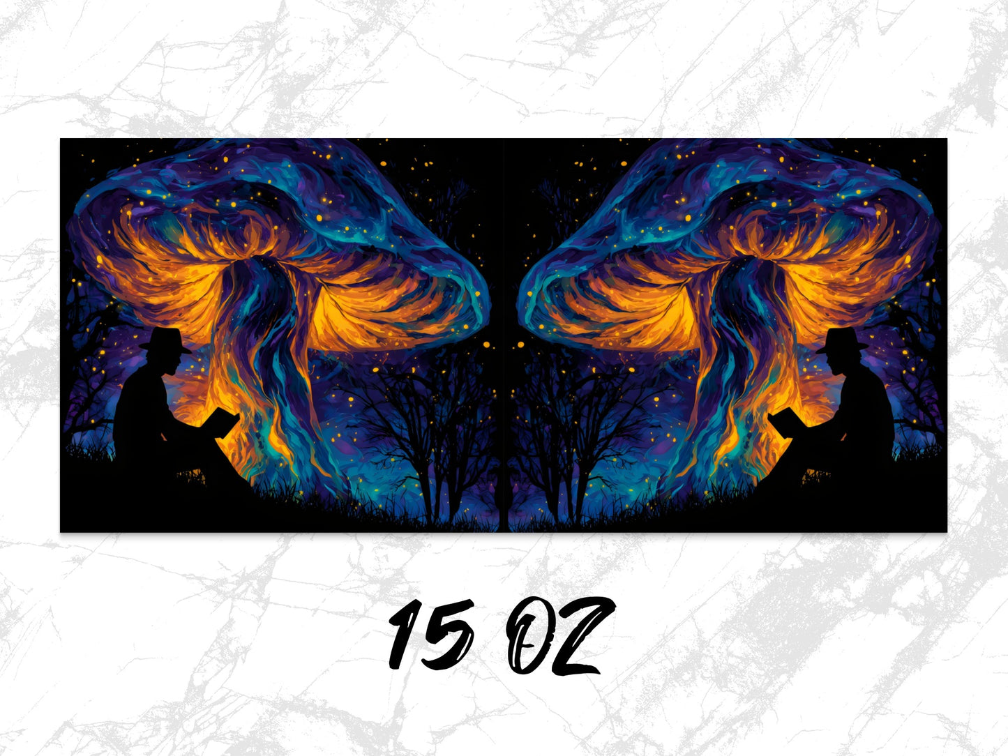 Transform your mug with this striking digital wrap! Featuring mysterious silhouettes reading books under a surreal luminous canopy. Perfect unique gift idea to elevate your daily coffee.