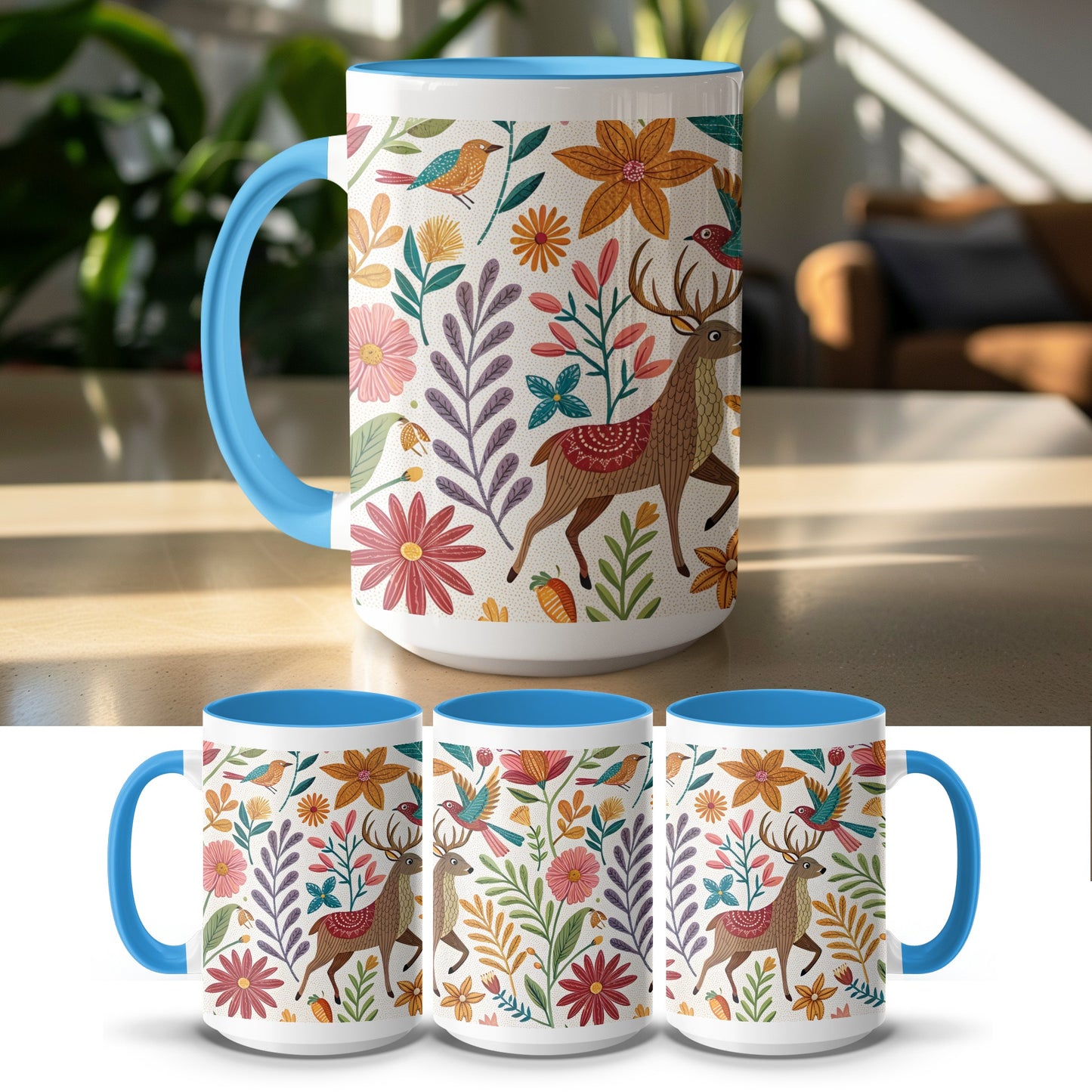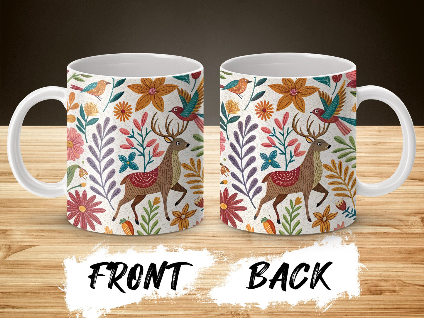 Discover a unique digital product designed with Otomi embroidery style showcasing deer birds and colorful flowers. Download it and use it for your next project.