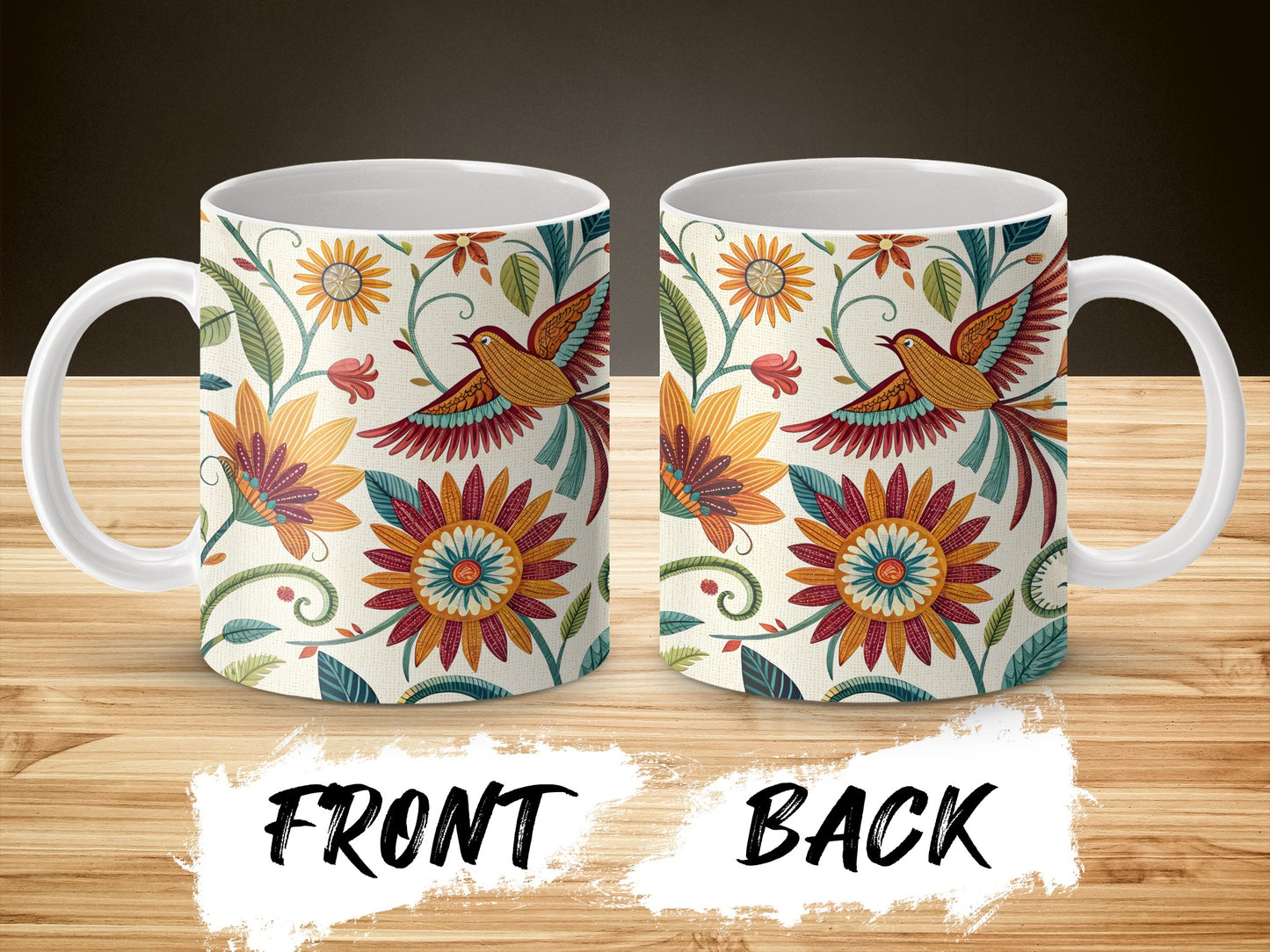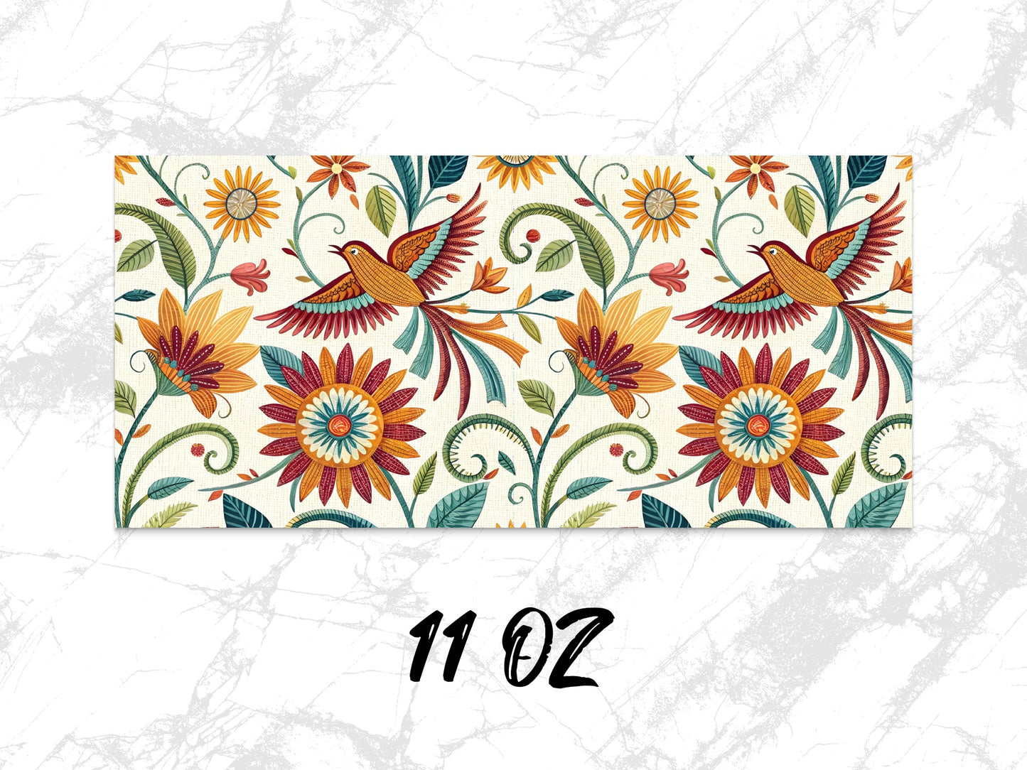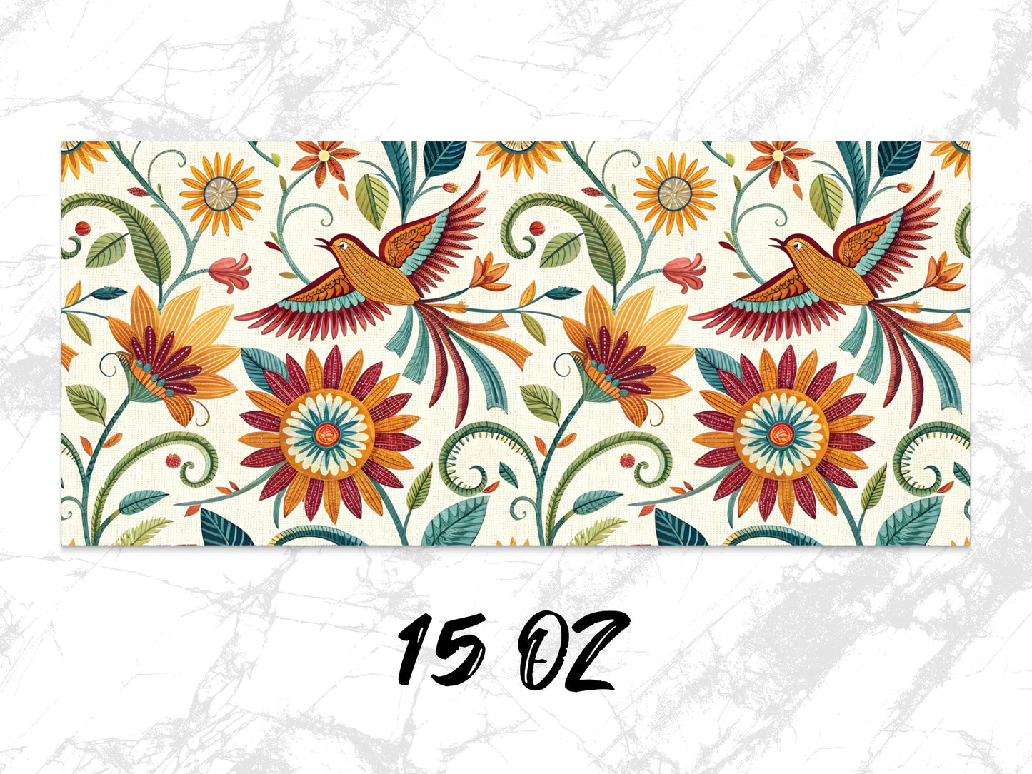 Add a vibrant touch of Mexican folk art to any project using this Otomi embroidery inspired digital design featuring birds and flowers. Perfect print asset with unique style.