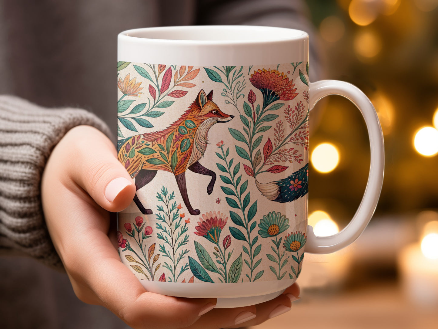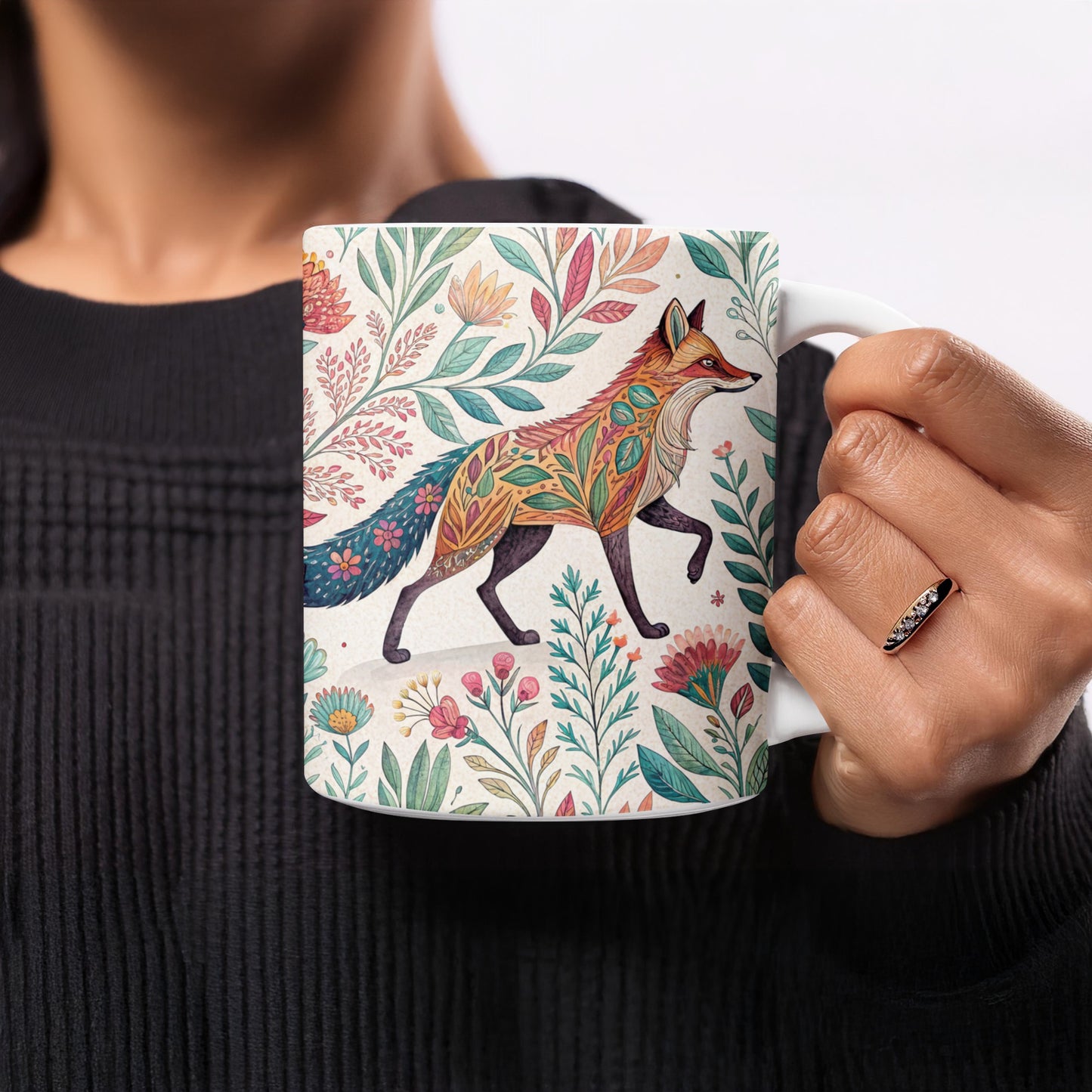 Otomi Embroidery Style Fox and Flowers Image Print Mug