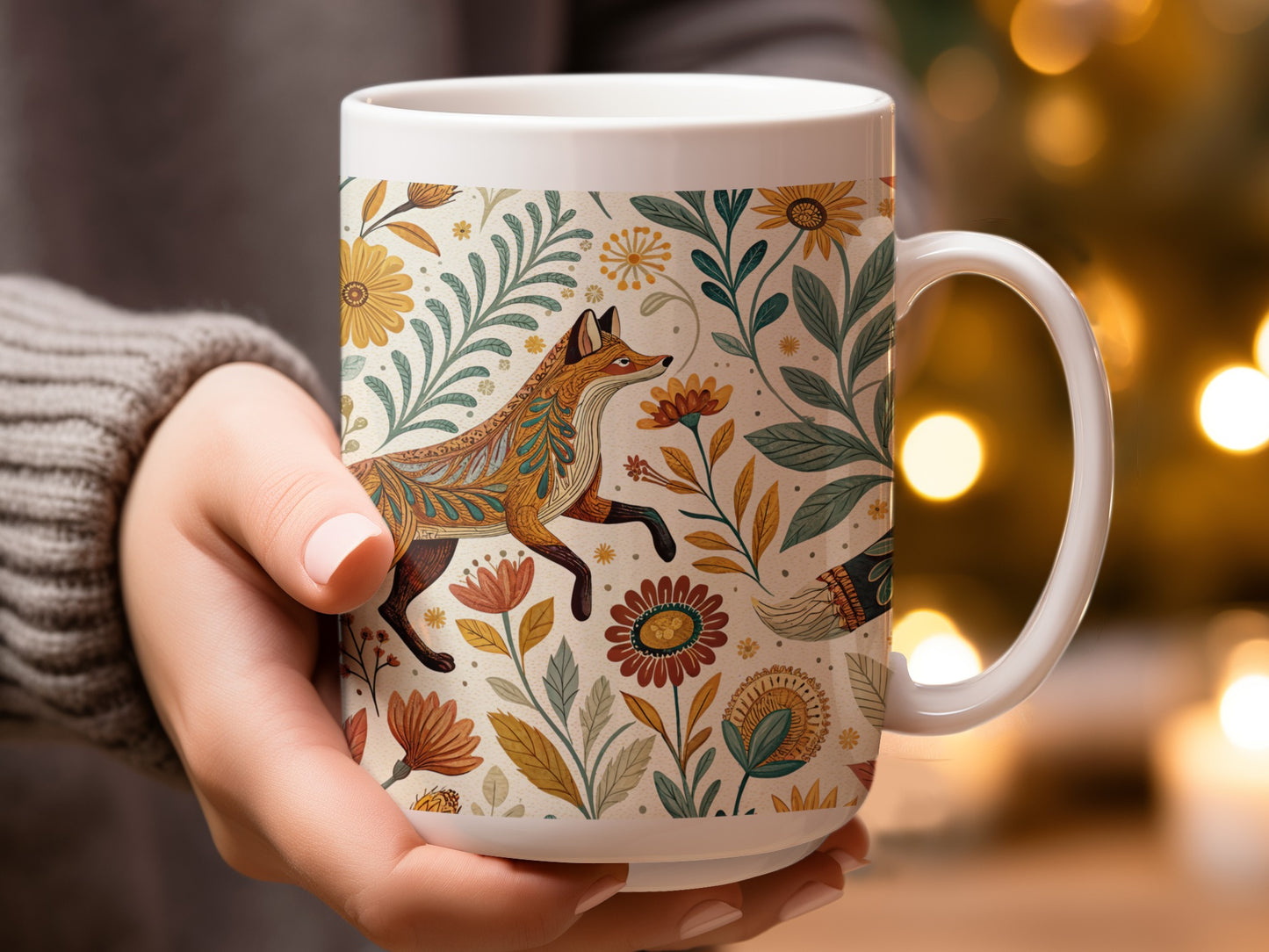 Indulge in folk charm with this mug featuring an Otomi embroidery style fox amidst whimsical flowers. A delightful addition to your morning routine or a lovely gift.