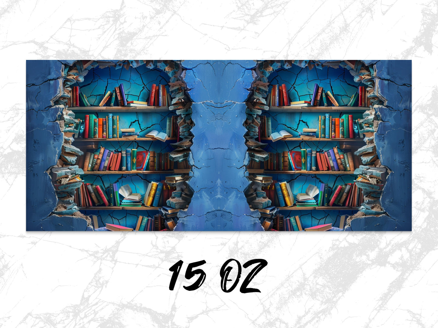 Transform your space with this captivating bookshelf digital art featuring a blue cracked wall. A unique addition to any art collection. Download instantly!