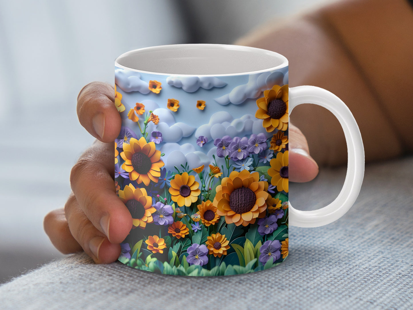 Transform your mug into a work of art! Showcase a charming blend of sunflowers clouds and violet flowers with our unique 11oz & 15oz Digital Mug Wraps.