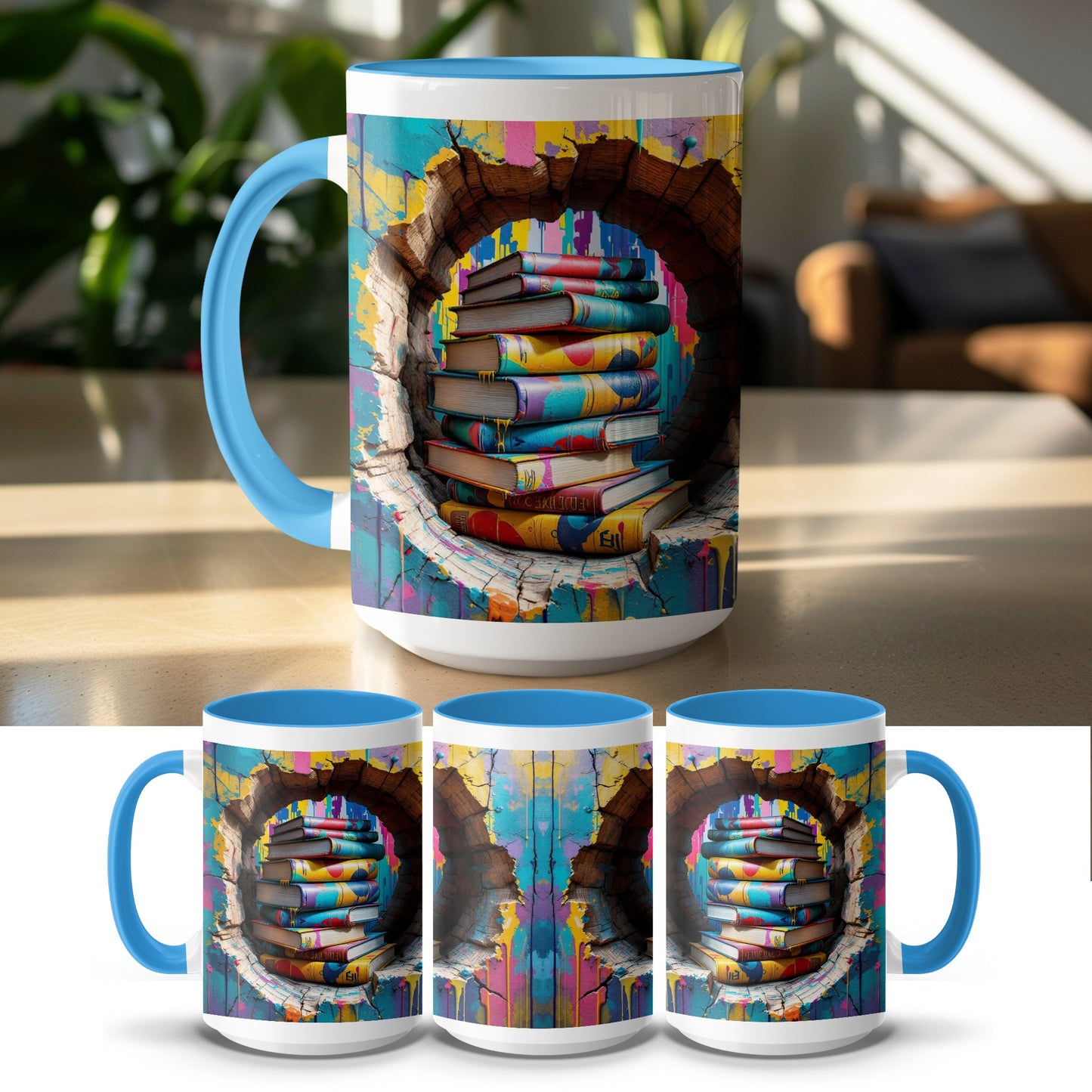 Colorful Books stacked With Opening Wall Tunnel Design Mug
