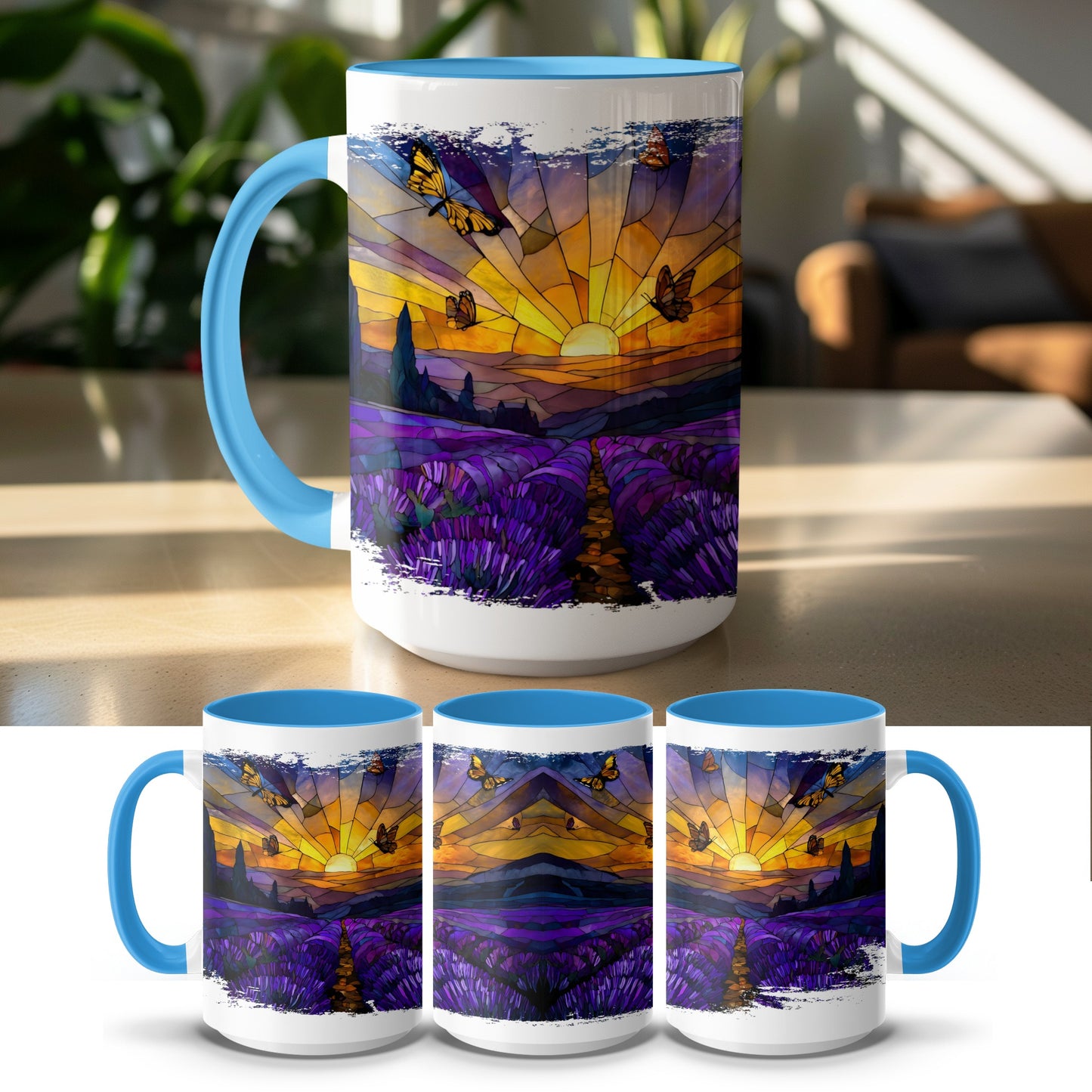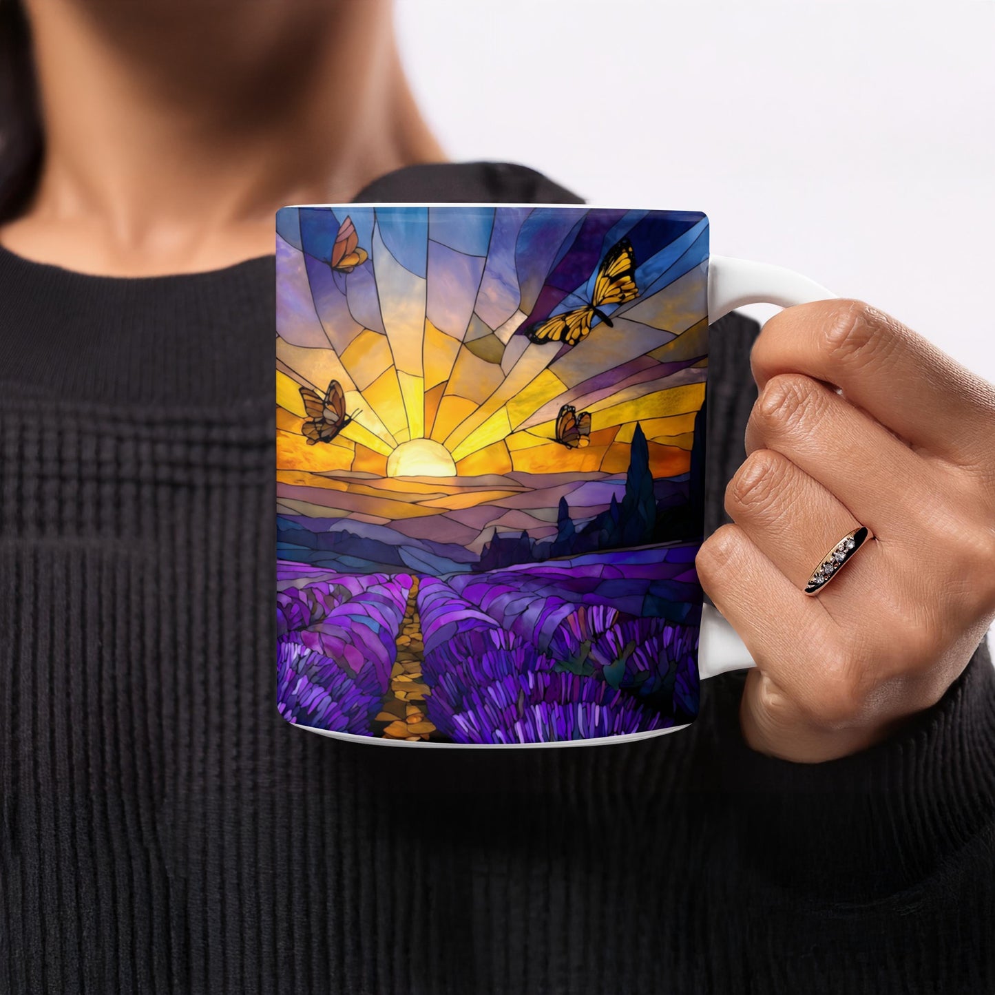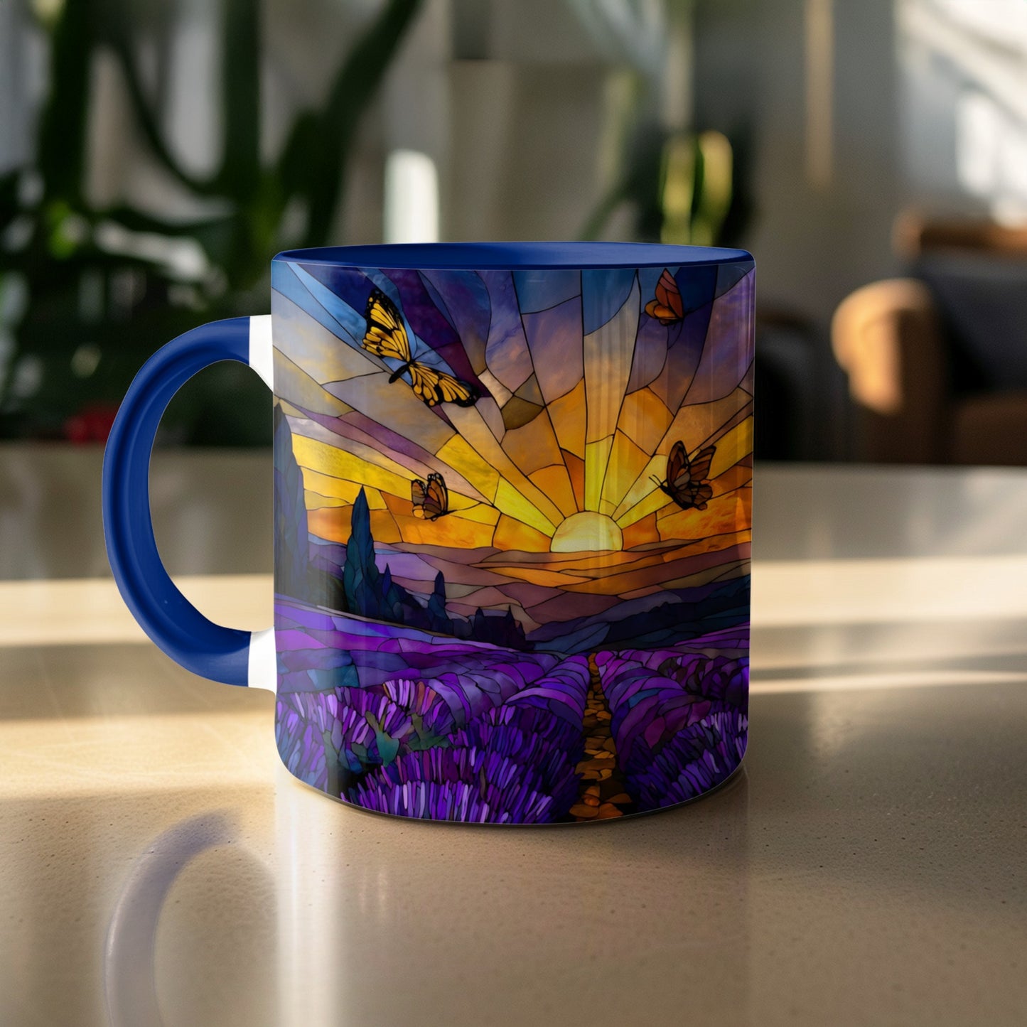 Sunset Above Lavender Field in Stained Glass Designs Mug