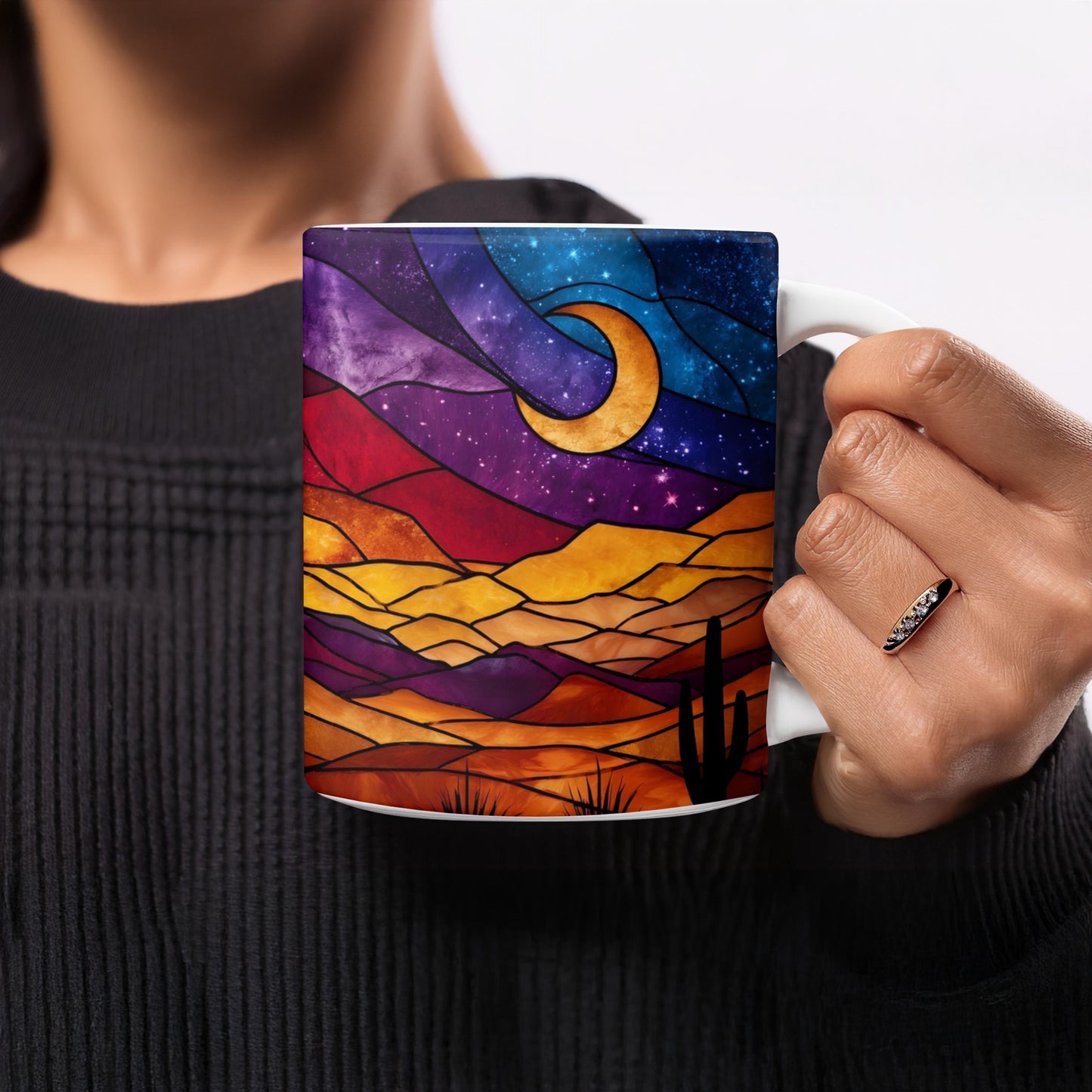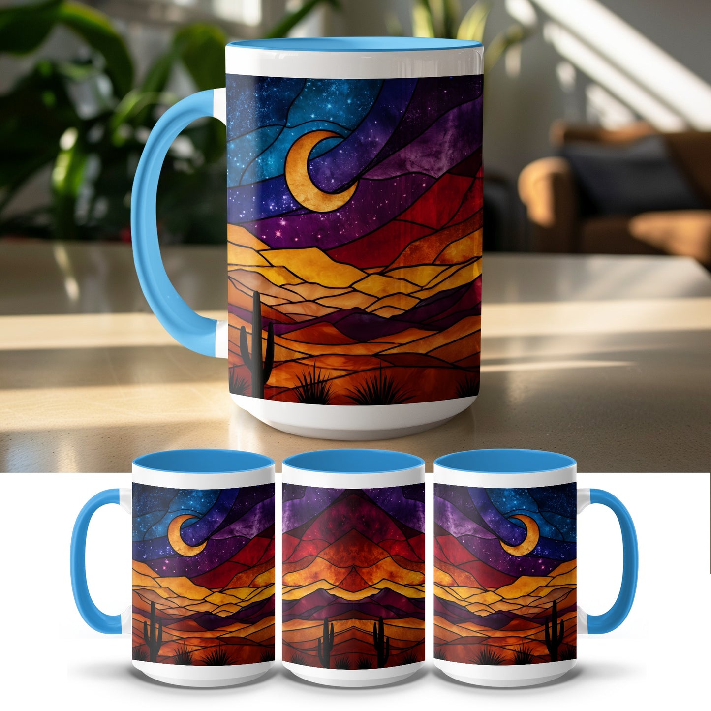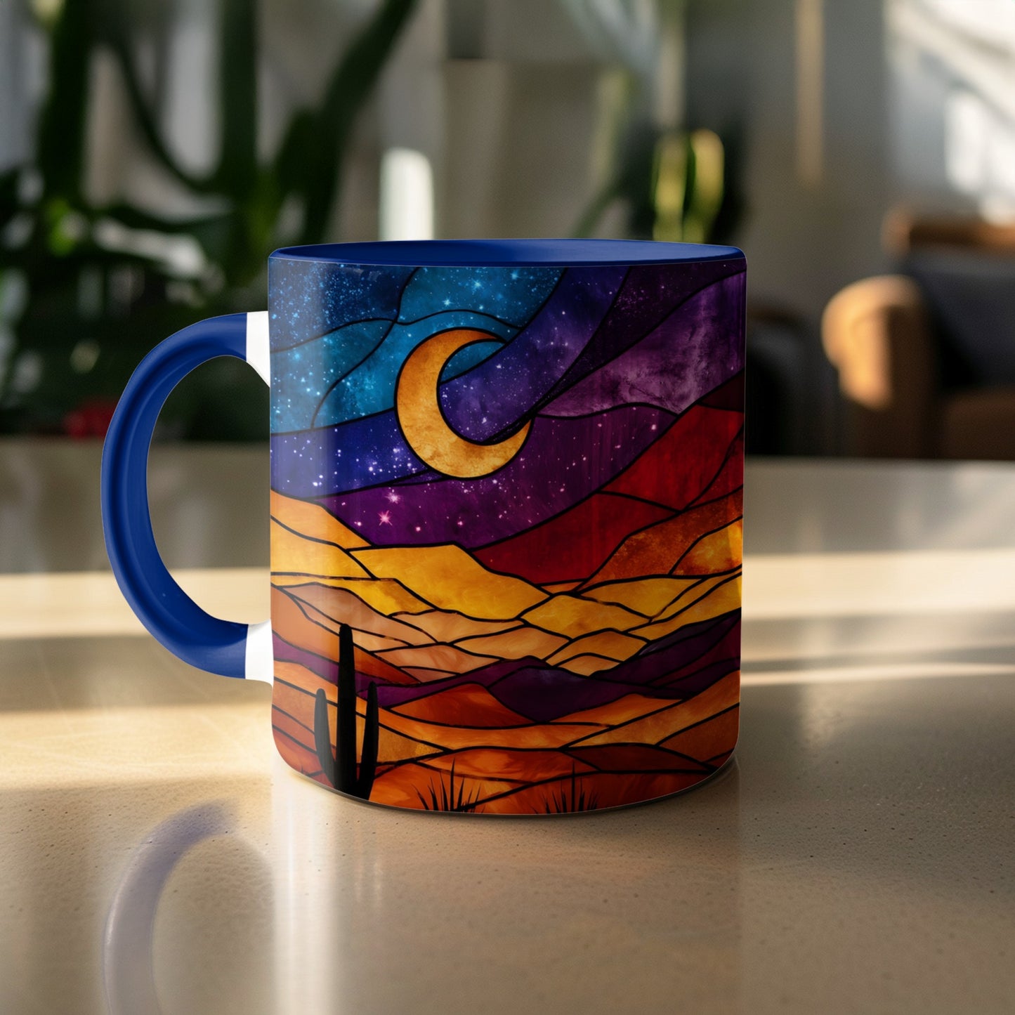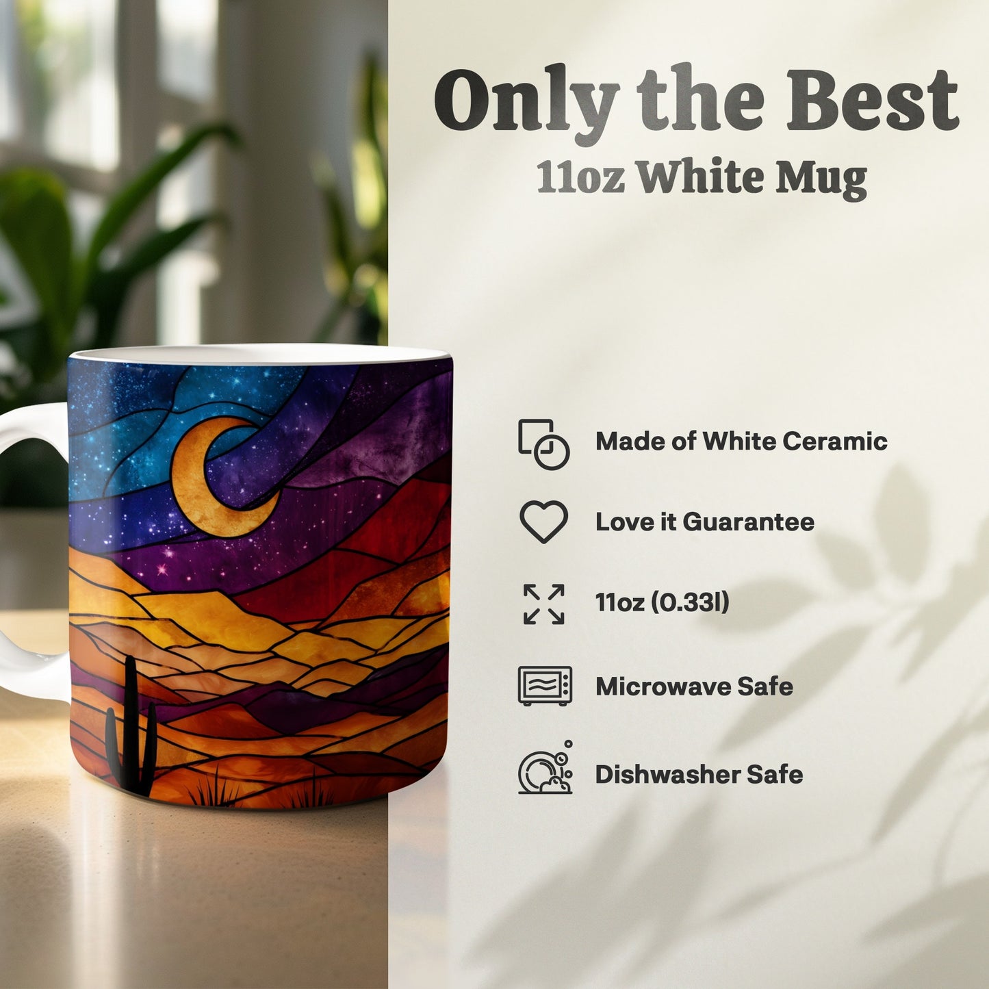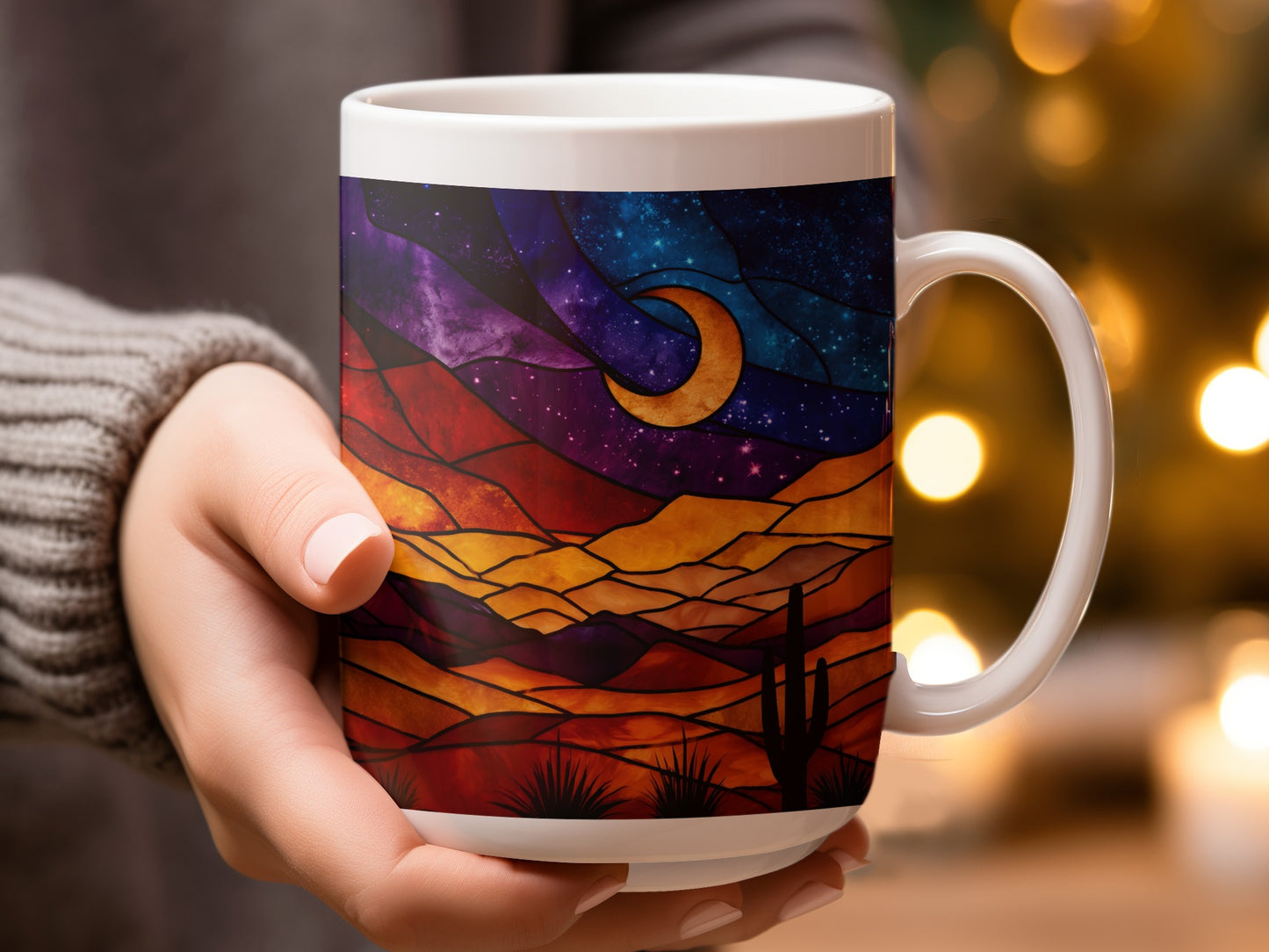 Enhance your creative projects with this unique desert landscape design featuring a vibrant color scheme of oranges reds and purples. Evokes tranquility under a starry night.