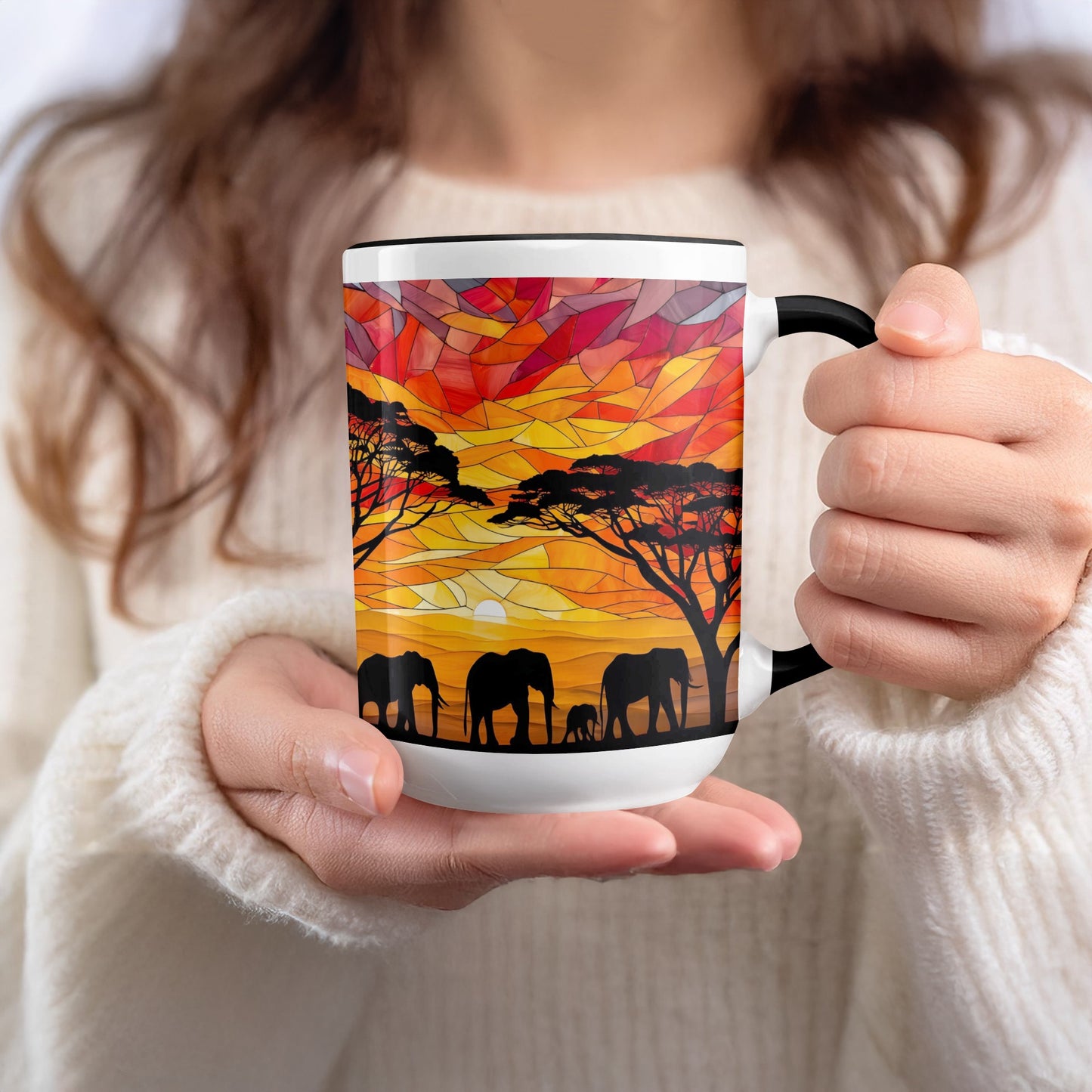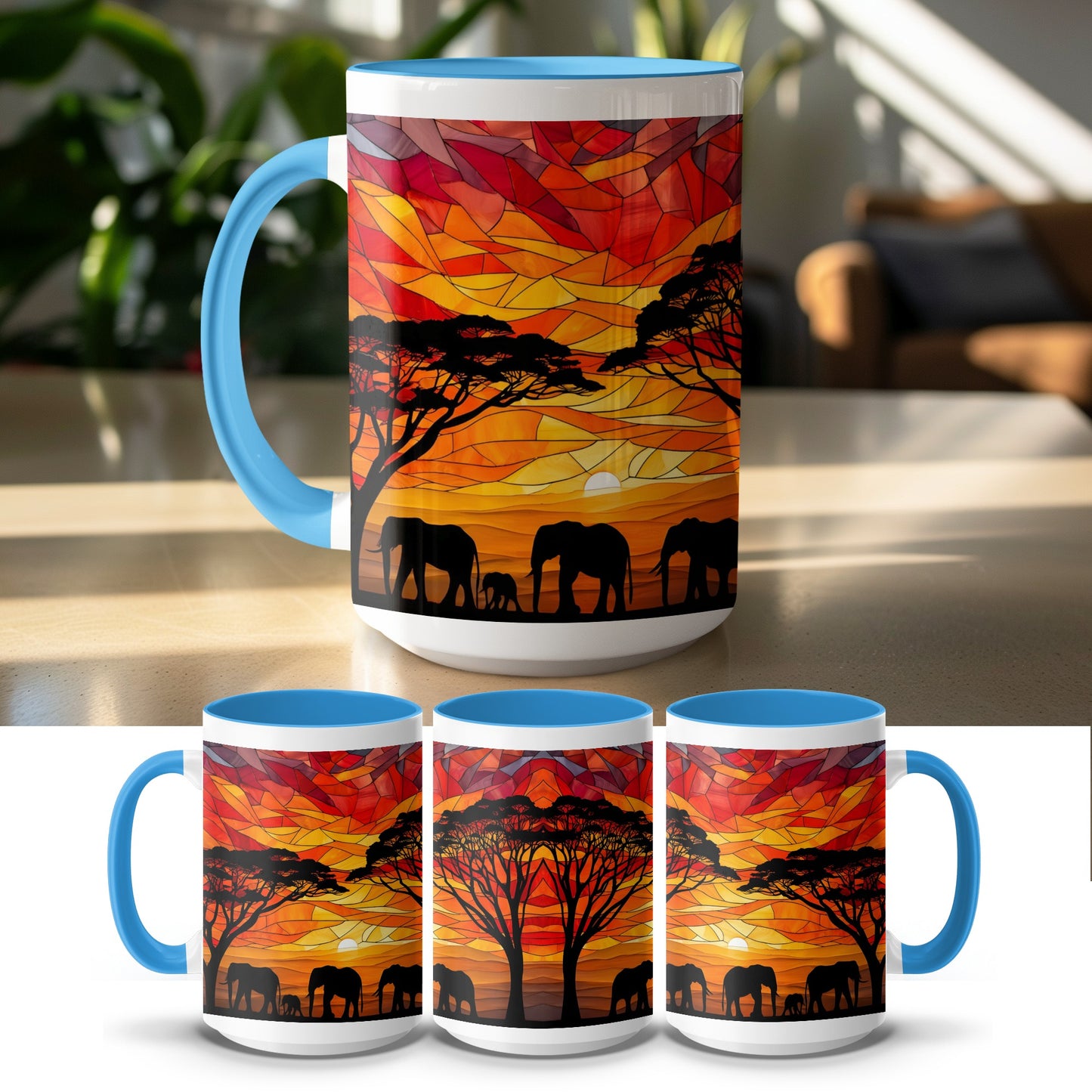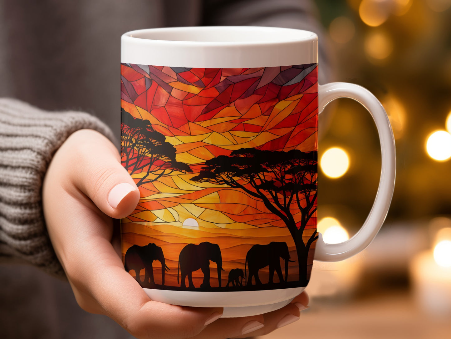 Capture the beauty of the African savanna at sunset with this stunning stained glass styled design featuring elephants at sunset. Perfect for unique projects. Get yours now!