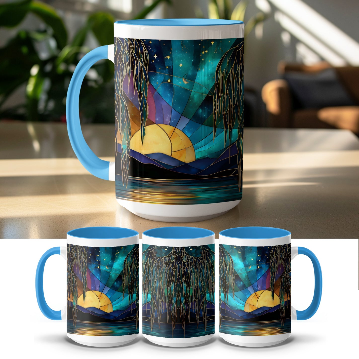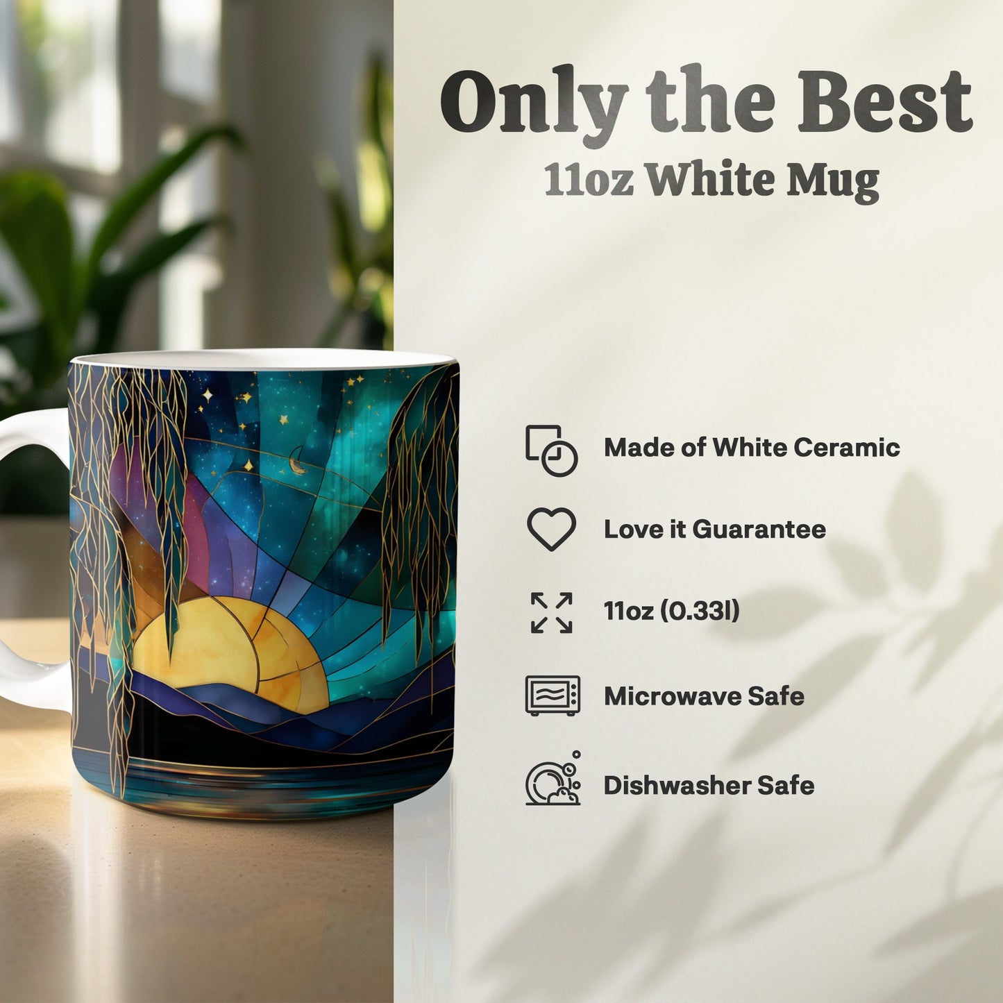 Explore the enchanting stained glass inspired design featuring a golden willow under the moonlit sky. This captivating art piece brings a touch of elegance to any space.