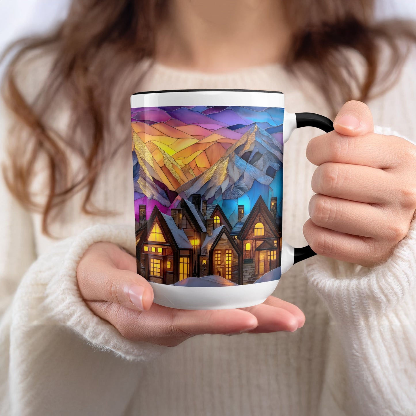 Enhance your home decor with this stunning stained glass themed design showcasing snow capped mountain tops and quaint winter houses. Perfect for adding a touch of warmth and charm.