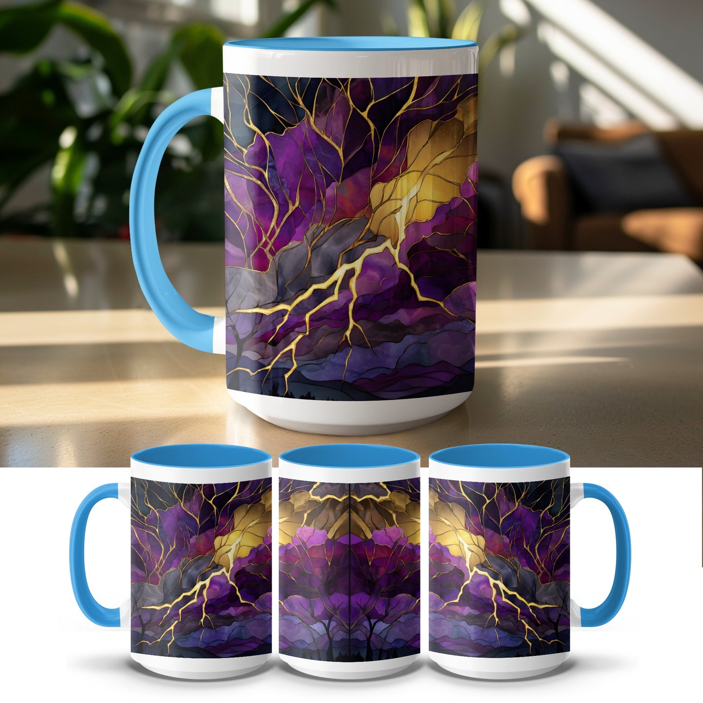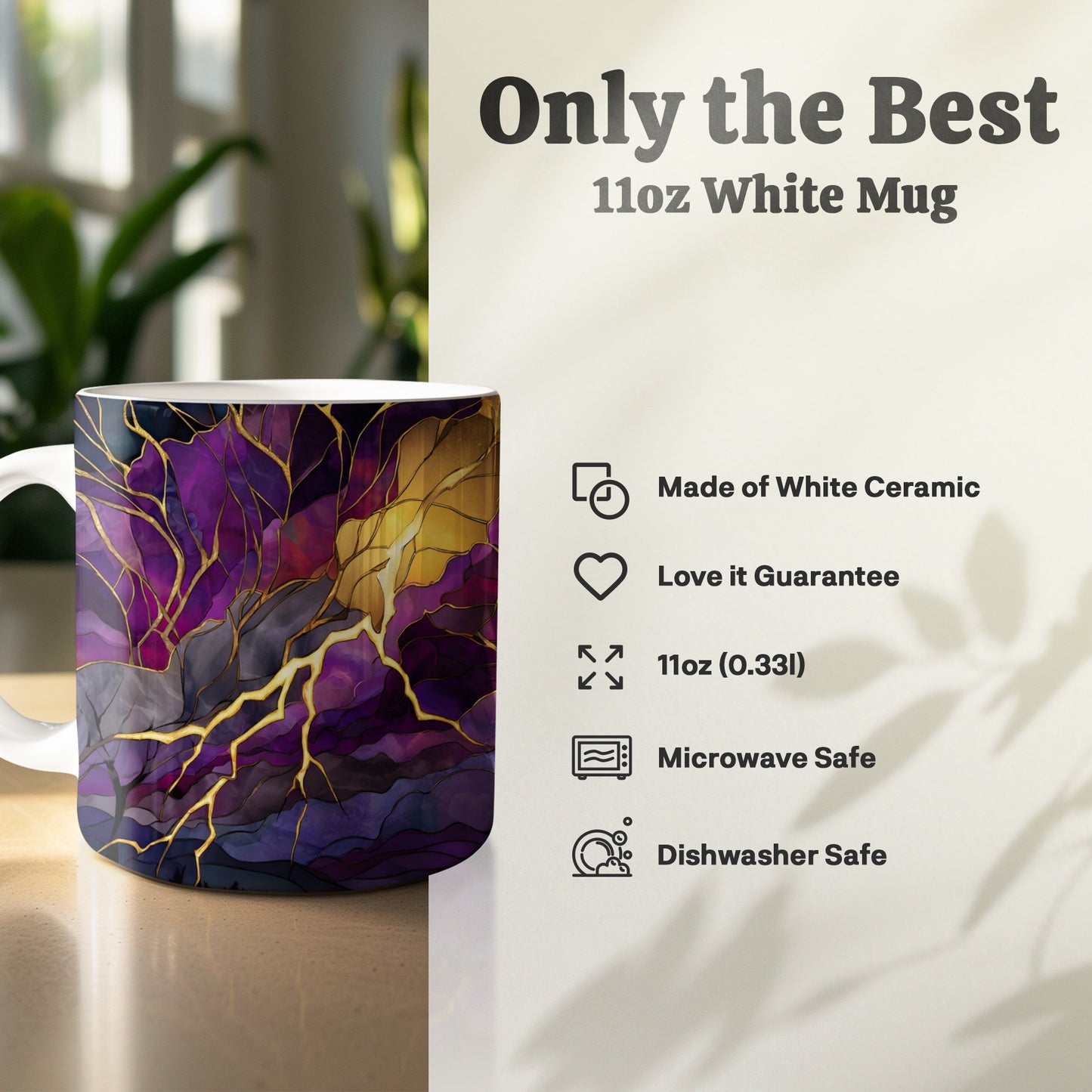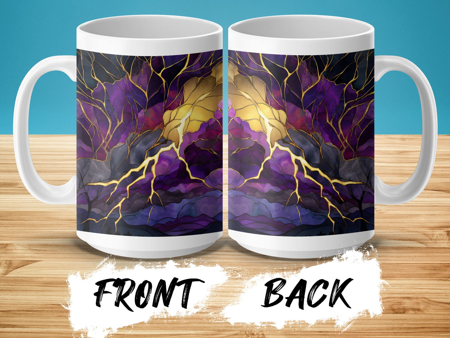 Discover our stunning stained glass style design featuring a mesmerizing tree with purple and gold hues. Perfect for adding an elegant and artistic touch to any project.