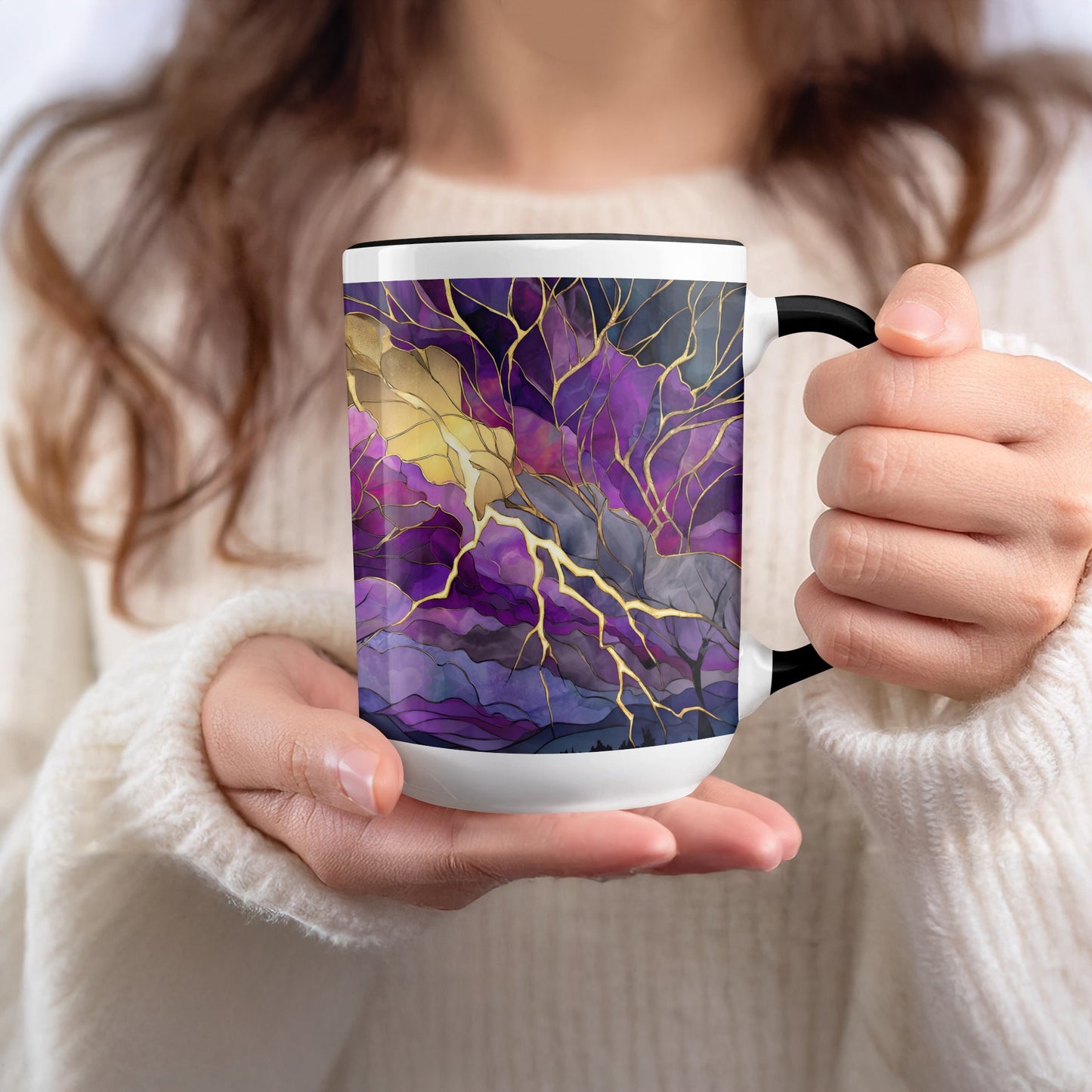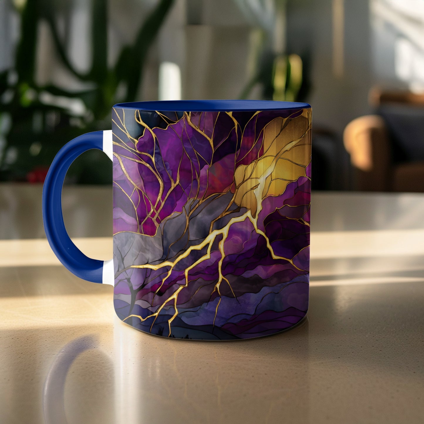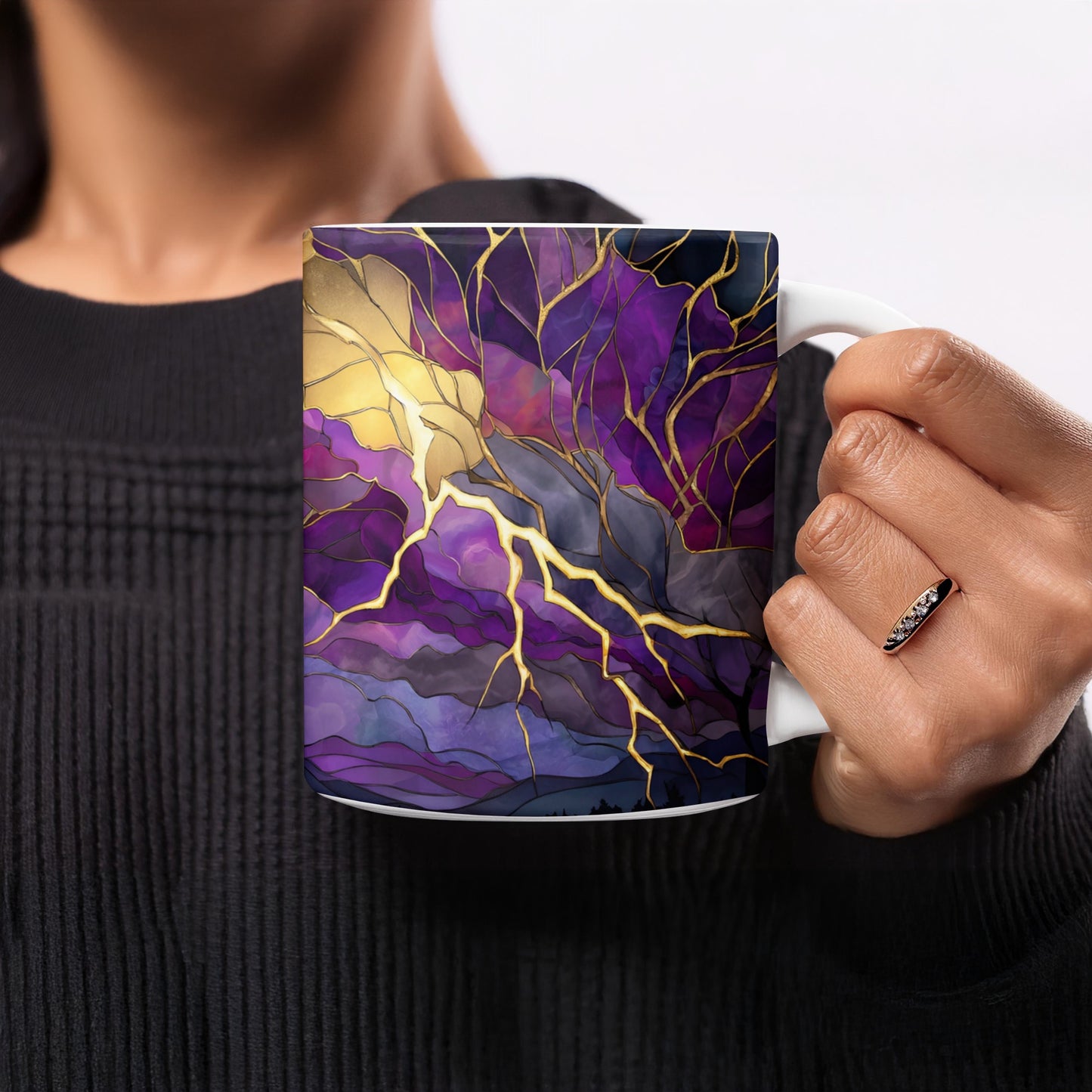 Discover our stunning stained glass style design featuring a mesmerizing tree with purple and gold hues. Perfect for adding an elegant and artistic touch to any project.