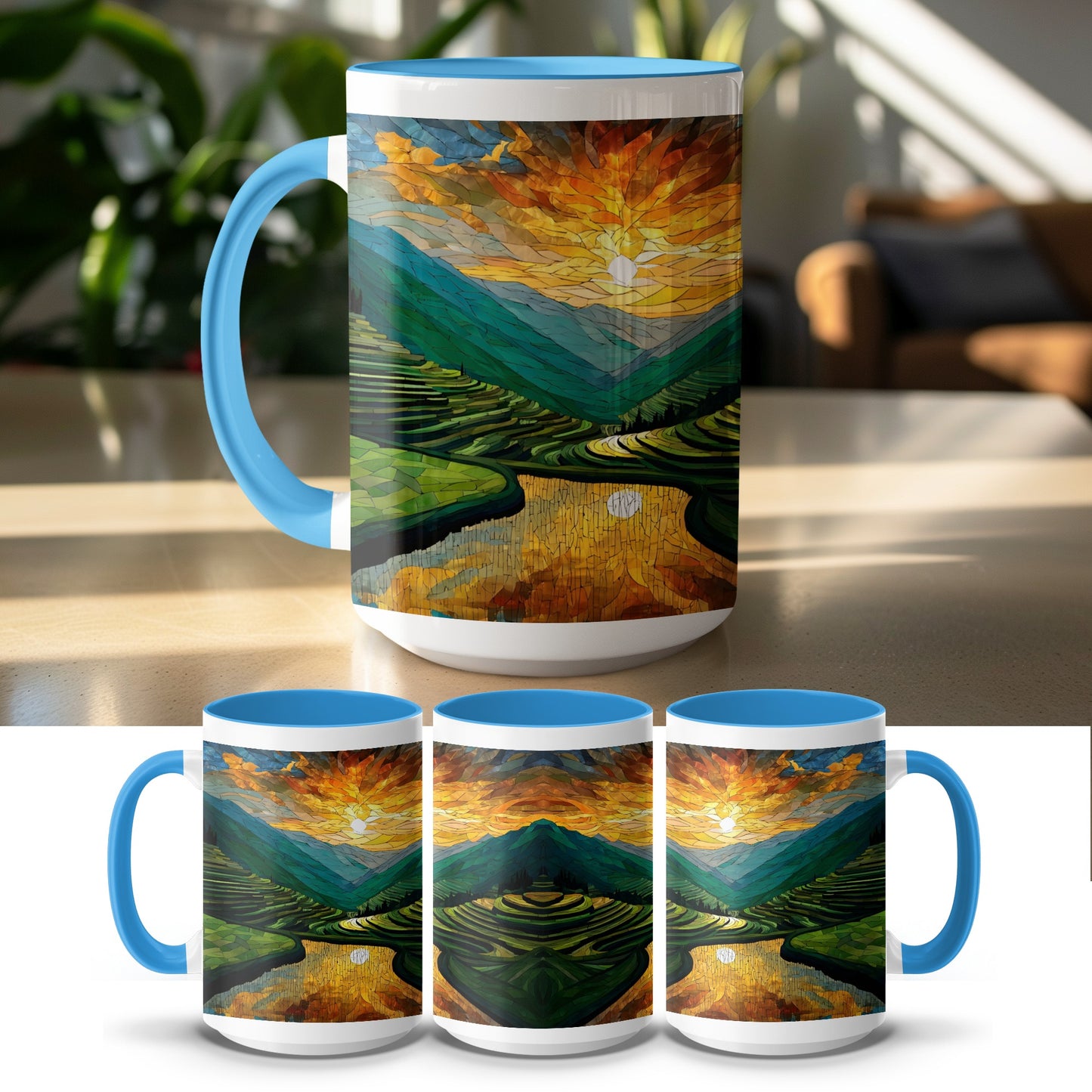 Transform your space with this unique stained glass artwork! Featuring a vibrant sunrise above lush terraced fields this digital artwork adds nature beauty. Get yours today!