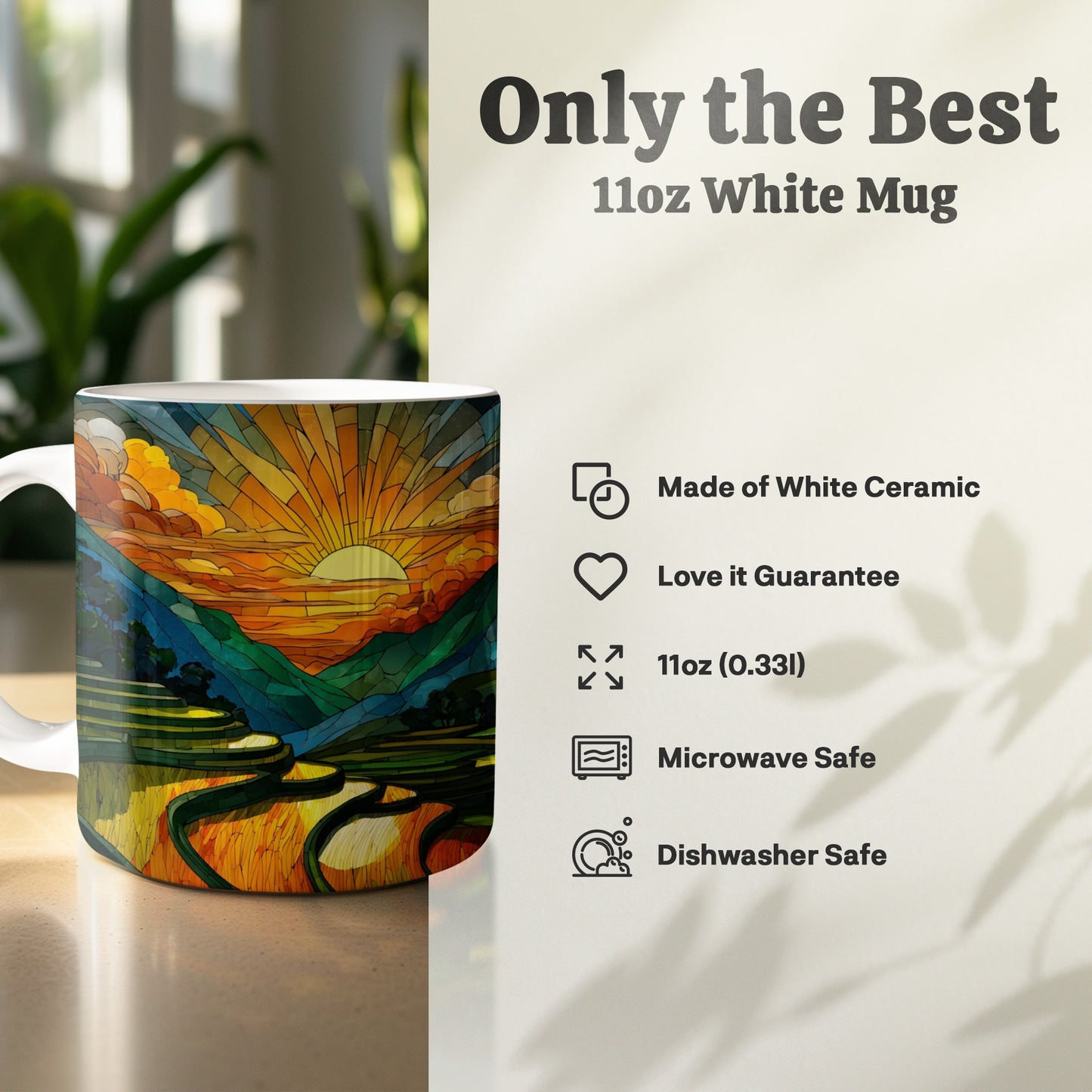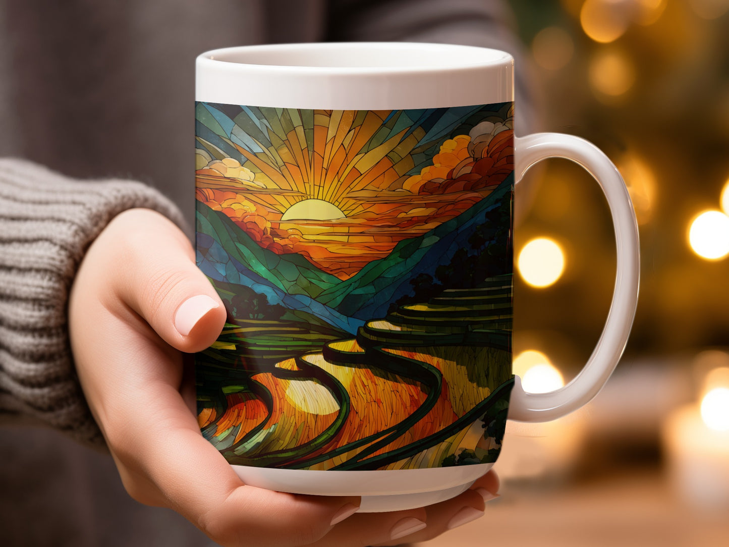Discover serene sunsets over mountains in a stained glass style. Perfect for adding a touch of colorful elegance to any project. Explore beauty with this artistic piece.